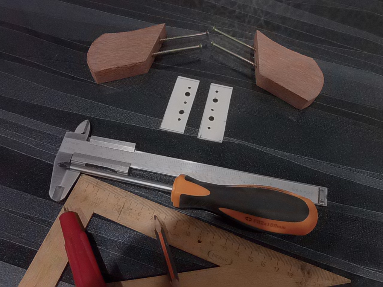 Отчекрыжил я нужное под нужным углом и перевёл на заготовки отпиленные носики. Лобзиком выпилил их, в каждый носик с заднего торца закрутил по два самореза. Они для надёжного крепежа этих элементов в ложе. Также сделал и прокладочки из пластика под них: