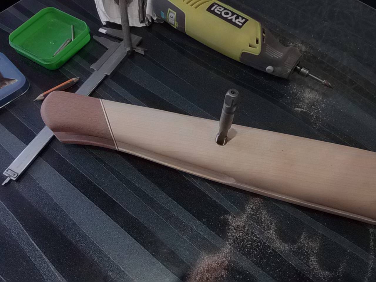 После полного высыхания накапал в просверленные в торце ложи отверстия тот же ЭДП,намазал поверхности прокладок и торцы ложи клеем,вставил саморезами носики в торцы,отцентровал их и хорошенько прижал.Снаружи носики и прокладки были с запасом на обработку,а внутренние плоскости были в один уровень с торцами ложи. Ну и после высыхания новенькие носики намертво приросли к ложе! Крепче и не придумаешь пожалуй! Вот так примерно всё это выглядело: