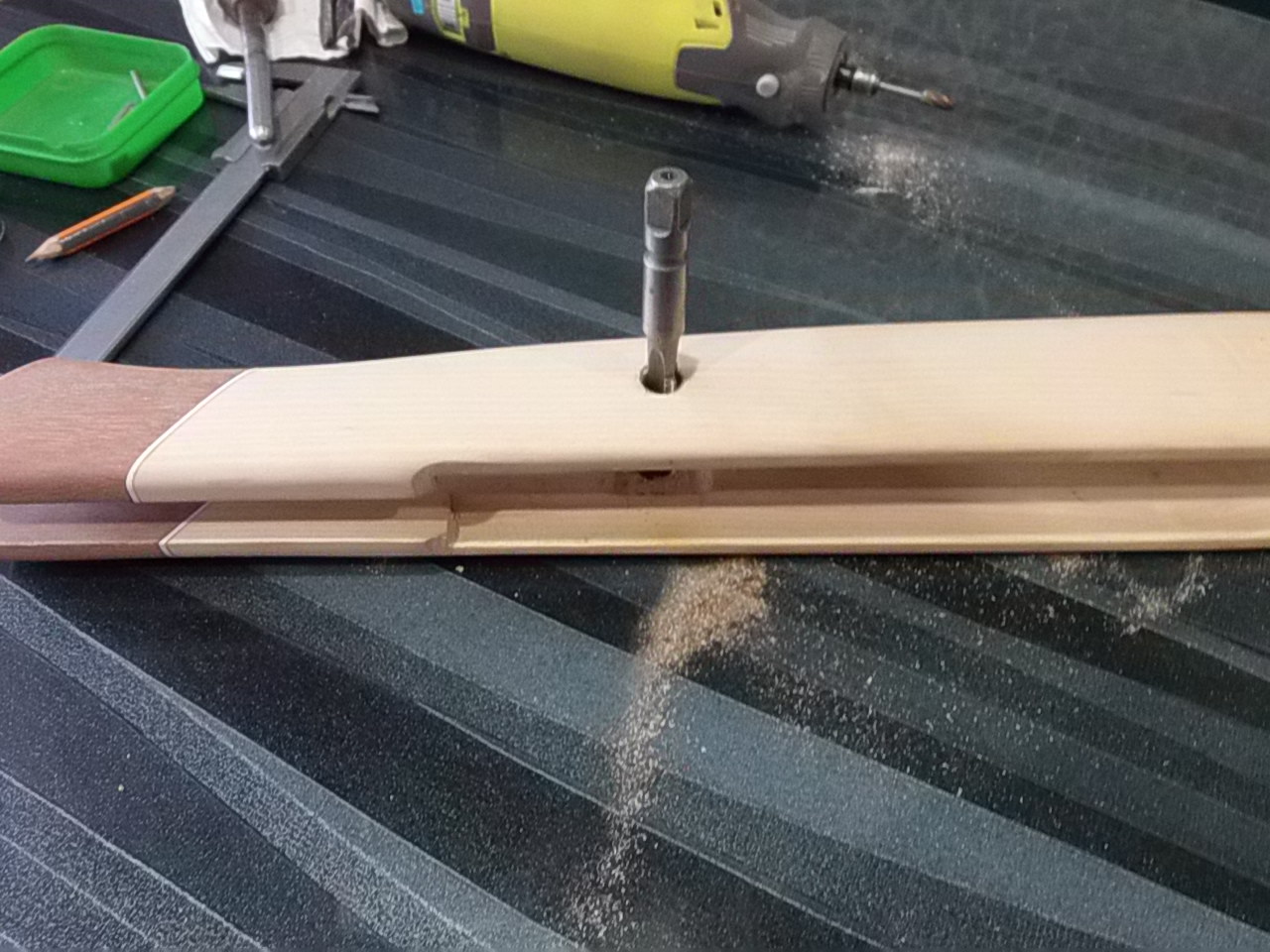 Позже разметил на торцах ложи соосные отверстия под вкрученные в носики саморезы,просверлил отверстия Ф4,5мм для свободной вставки саморезов в эти отверстия: