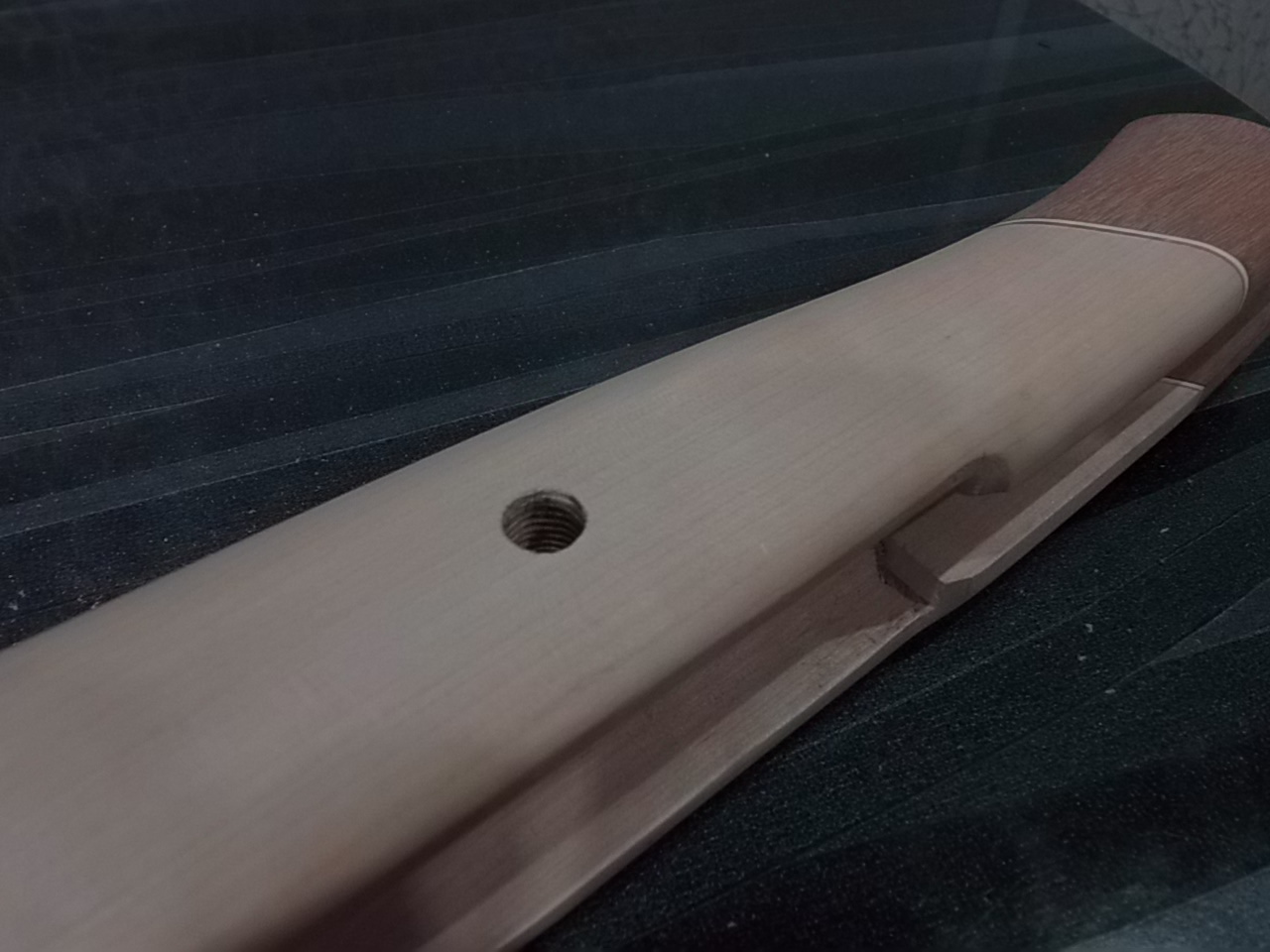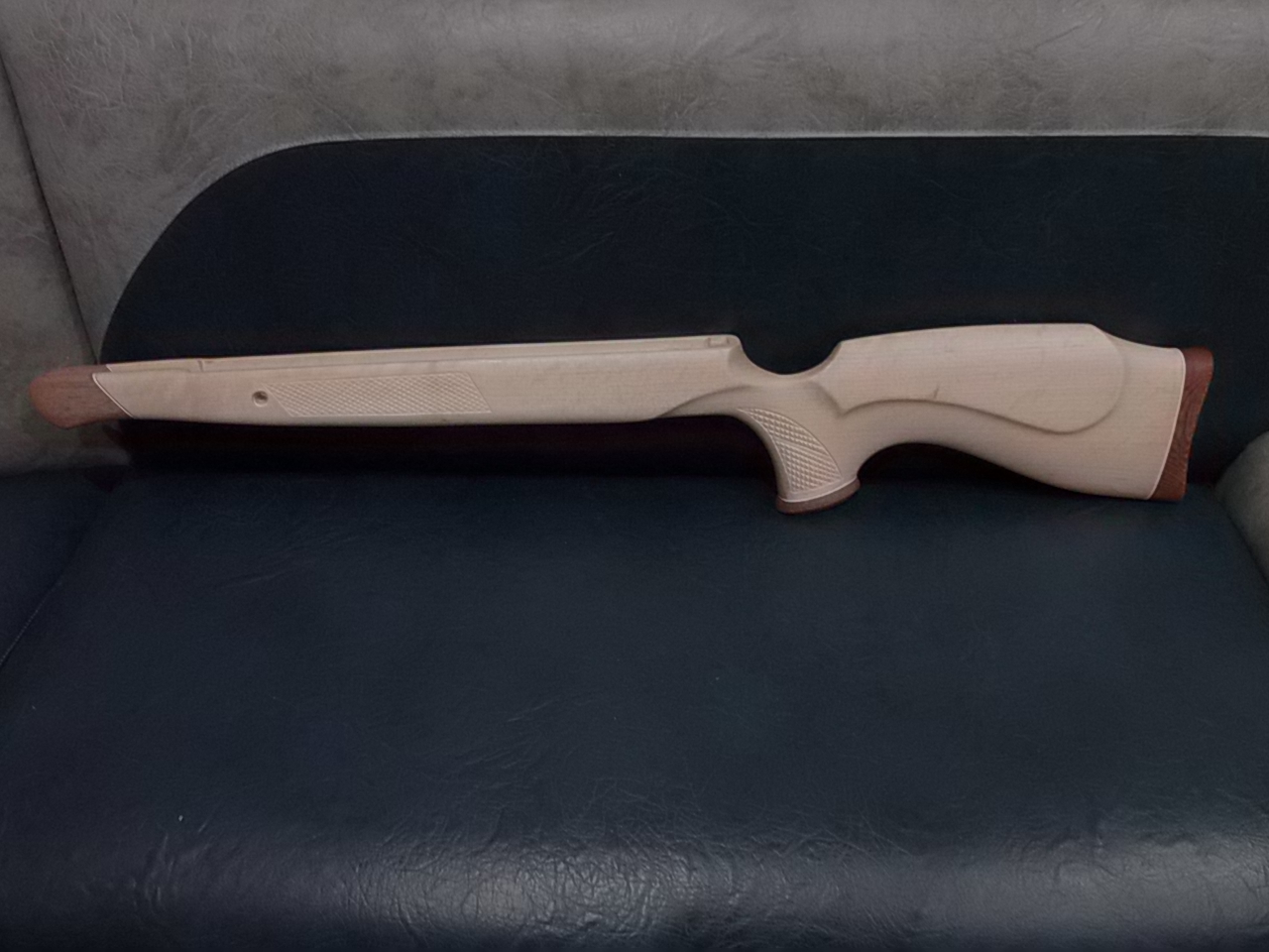 Досмотрел на картинке-образце,что справа на прикладе под щекой есть некоторая впадинка. То есть щека приклада с левой на правую сторону как бы наплывает. Решил обратиться к «боссу» и предложить ему сделать сей элемент. Получил: «Согласен!!!» Ну и сначала полукруглыми стамесками,а потом доработав наждачками,получил вот такой декор щеки справа.На мой взгляд очень всё гармонично срослось,особенно впереди вышло красиво и стильно: