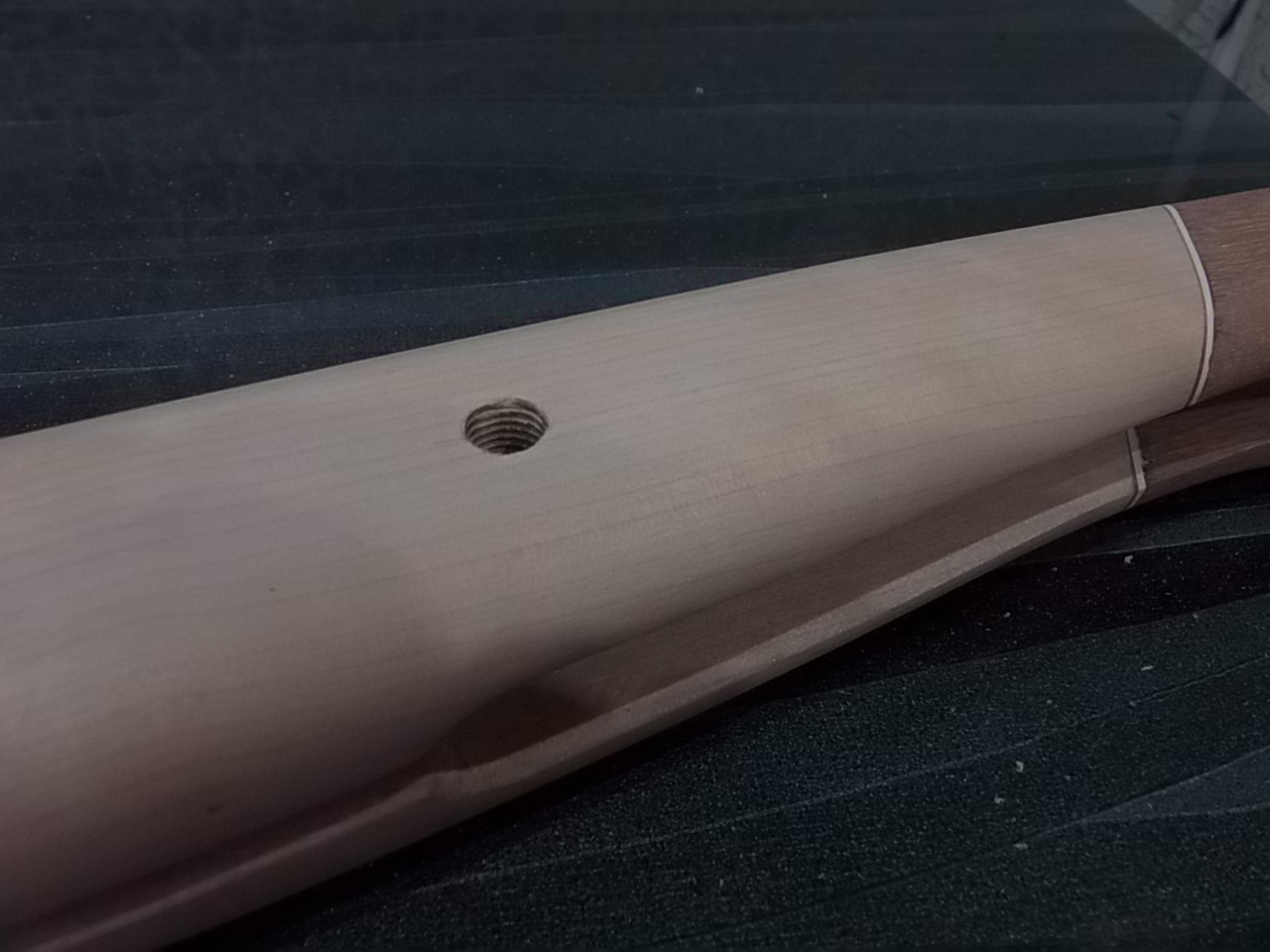 Выборку под скобу в передке я чуть лишнюю сделал,но это потом исправил шпаклёвкой из опилок и клея. Отверстие под передний саморез также видно… Ну а вместо родных боковых винтов под крестовую отвертку выточил новенькие из стали. Шляпки сделал симпатичной формы и под шлиц. На мой взгляд под шлиц винты смотрятся на оружии гораздо соответствующе чем под «крестик». Также для надёжности решено было в крепёжные отверстия в ложе врезать стальные втулки. Это во избежание поломки ложи в этих отверстиях. Может и нет,не сломалась бы,не треснула тут ложа…Но не лишним думается было и подстраховаться! Да и заказчик одобрительно кивнул на мои доводы и позволил делать как считаю нужным. Втулочки были с наружной резьбой М10Х1,5.Внутри резьбу не делал-было достаточно того,что винты с резьбой М6,а отверстия под них во втулках были 6,2мм. То есть люфта быть не могло. После сверления отверстий боковых в ложе Ф8,5мм,нужным метчиком нарезал в них резьбу указанную. Вот выточенная фурнитура и нарезанная резьба в «буратинке»: