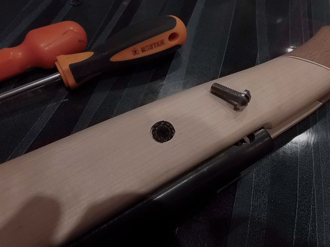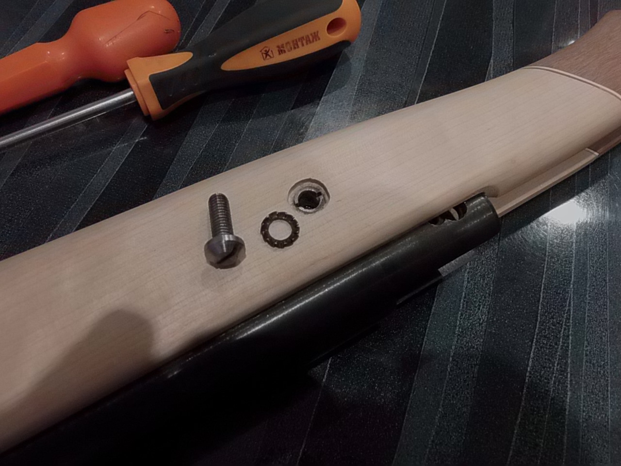 Ну и врезал в ложу выточенные втулочки на смесь ЭДП с металлическими опилками. Рассчитал так,что при закручивании полном винта с одетой шайбой рифлёной-головки винтов чуть торчали косым ободком из ложи. Втулки же были врезаны с внутренней стороны заподлицо с внутренней поверхностью ложи!То есть при вставке железа в ложу-места крепления вплотную были к втулкам!!! Ну вот примерно что я вам здесь пытался рассказать: