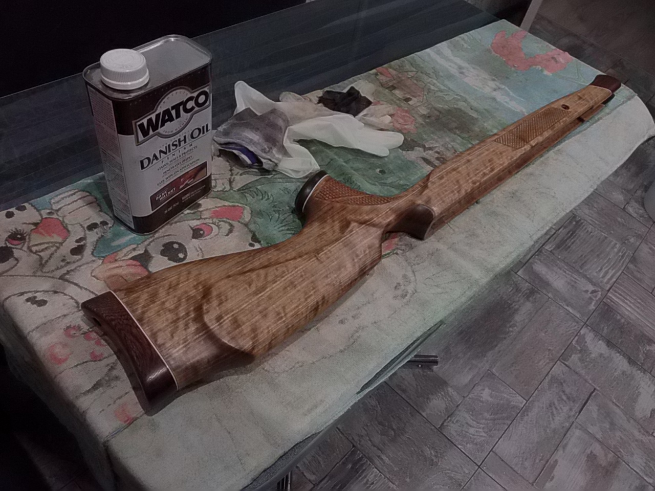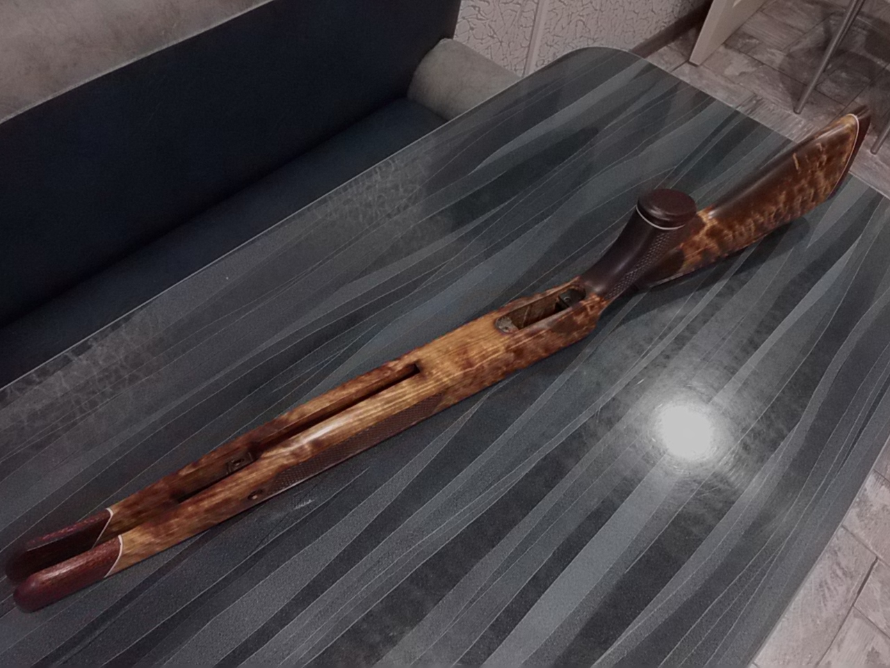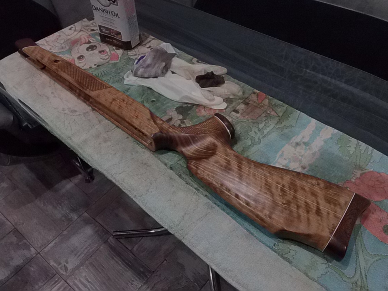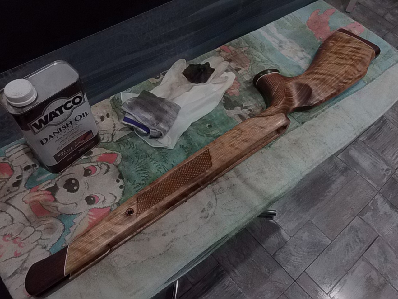 Приступил к пропитке. Очень быстро иссяк остаток в маленьком флаконе,открыл новую бутылочку. Растирал тщательно,но совсем не жалея. Его сколько не лей-оно всё лезет и лезет в деревяху. Но решил что нанесённых первым слоем грамм 80-90 вполне хватит. Ну и зафиксировал для истории ложу под нанесённым маслом. Результат меня очень порадовал! Опять же! Предложил владельцу не окрашивать ложу морилкой. Очень уж не хотелось рисковать потерей эффекта тигровости на ложе. Да и сама текстура могла спрятаться бесследно под морилкой-как ты её потом после нанесения не растирай!Хоть водой,хоть самогонкой))) Не тот берёза материал,чтобы как в буке или орехе вскрыть текстурку! Плотность совсем другая у неё и фактура. Снова получил согласие на своё предложение,тем более после льняного масла планировалось наносить Дениш ойл «тёмный орех». Посчитали что будет достаточно только масел, чтобы добиться цвета как на картинке-образце. Ну и вот что стало после первого нанесённого слоя! Просто шикарно!Неужели не согласитесь? Фото: