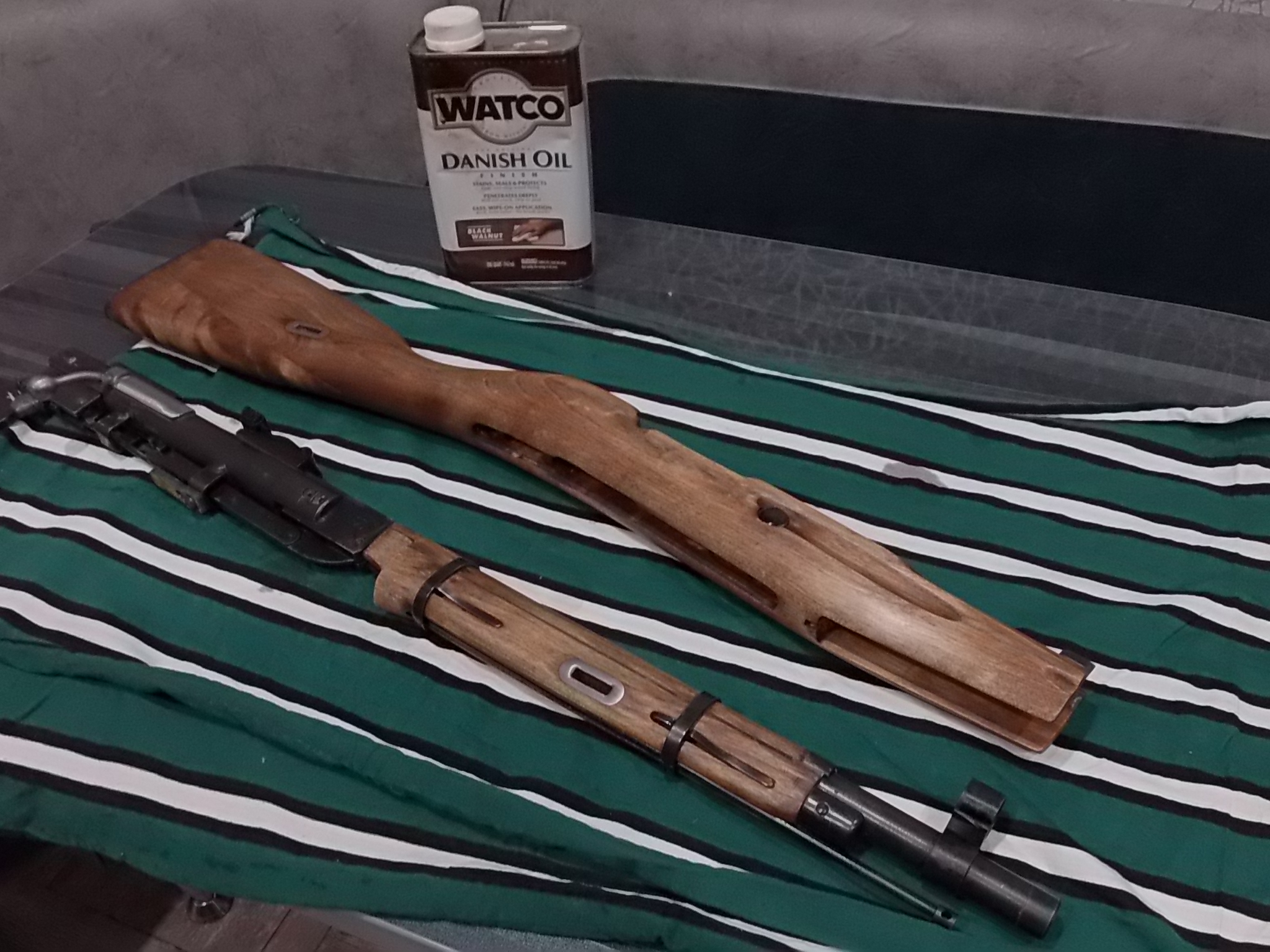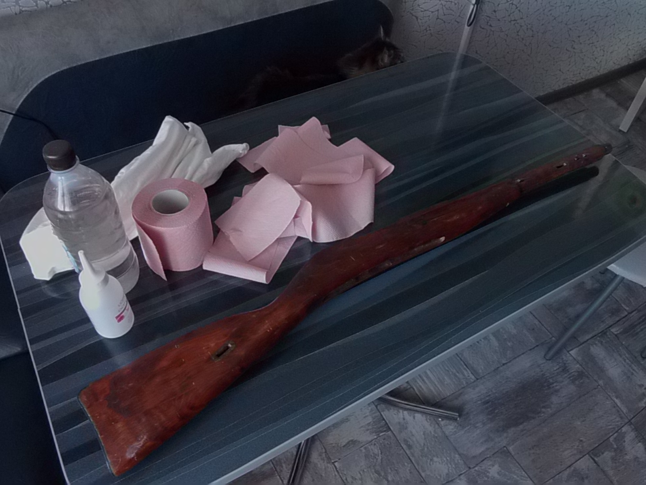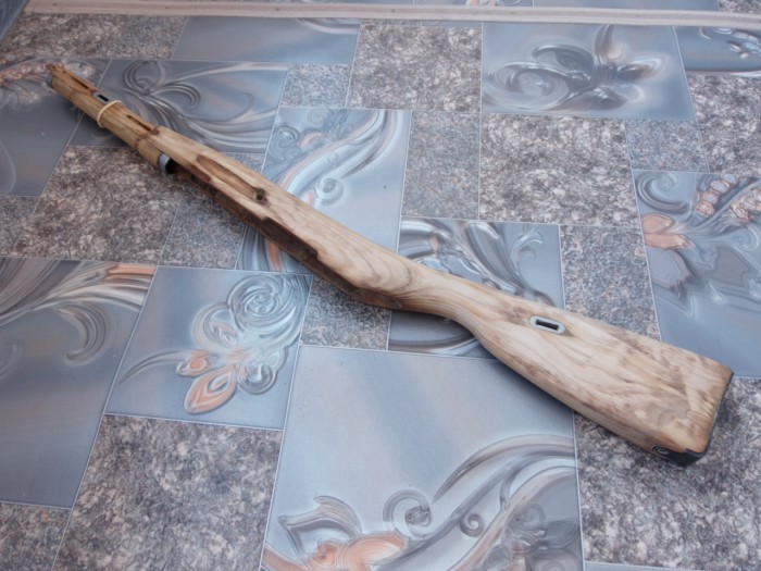 Далее нужно было обрабатывать ложу с накладкой. Складское хранение-видок конечно был не очень хороший. Старое покрытие разумеется с деревяшек нужно было снять. Пропитано дерево было от души какой-то массой напоминающей обычное машинное масло. Попробовал тереть наждачкой-три-четыре раза поёрзал и наждачка наглухо забивалась опилками, пропитанными этой массой. Решил сделать по другому,уже проверенному способу-отмочить старое покрытие в ацетоновой бане. Вот такими были деревяшки после покупки: Первым делом обмотал деревяхи в 2 слоя туалетной бумагой. Потом обернул в 1 слой нетканой салфеткой. Приготовил два пакета,скотч и брызгалку для ацетона. Вот такой вышел свёрток: На балконе(создав сквозняк) вложил свёрток в один пакет прикладом. Хорошенько со всех сторон оросил из брызгалки ацетоном этот участок. Затем второй пакет одел на цевьё,облил ацетоном со всех сторон эту часть, быстренько свернул пакеты воедино и место стыка зафиксировал скотчем туго. Т.е. сделал герметичную камеру чтобы пары ацетона испарялись не так интенсивно. Вот такой «кокон» был: Оставил часа на 3-4 свёрток. Ацетон конечно дырку себе нашёл и на балконе запашок стоял изысканный. Опасался чтобы кто-нибудь сверху мне на балкон «чинарик» не отослал. Ть-фу-ть-фу-ть-фу,но пыхнуло бы как здрасьте! А после распаковки и утилизации свёртка(сжёг на пустыре),дерево за это время подсохло. Весь лак и остальное остались на бумаге и салфетке! Оставалось теперь старательно, и в тоже время особых усилий не прикладывая, зачистить деревянные детали. Итог: Изначально думал что ложа и накладка сделаны из берёзы. Оказалось что они из кедра! Ну и сначала Р80,потом 150,после 220 номером бумаги отчистил дерево до удовлетворительного. Перед зачисткой навершие на цевье снял (откручивается 1 винтик и оно стягивается),пружины ложевых колец также извлёк из цевья (выдавливаются с левой стороны обычным шилом), а навершия на ствольной накладке снять не удалось-они заштампованы на ней. Но зачистке вовсе они и не мешали-заодно и их «освежил»,как и врезанные антабки. Затыльник с приклада снять мне не удалось. Шурупы родные оооочень здорово его держат! Даже при моих неслабых далеко «кисточках»-стронуть их хоть на полмиллиметра не удалось,а срывать шлиц красивого воронёного самореза…..Ну зачем? Жалко ведь,всё-таки оригинал, история!!! Клейма шикарнейшие были на затыльнике. Его чуть подтёр при зачистке приклада-ну не страшно! Потом я подворонил всё что надо было…