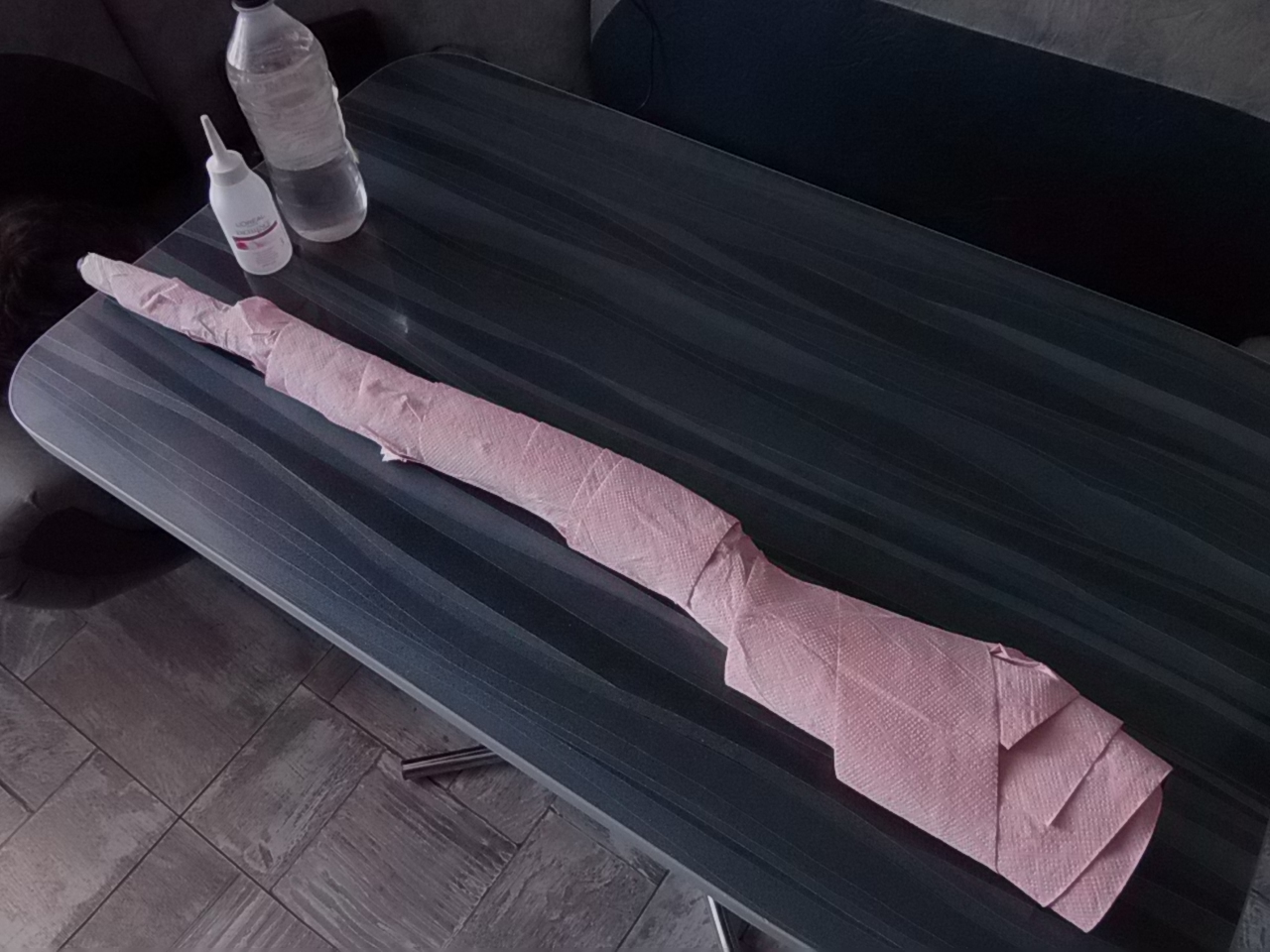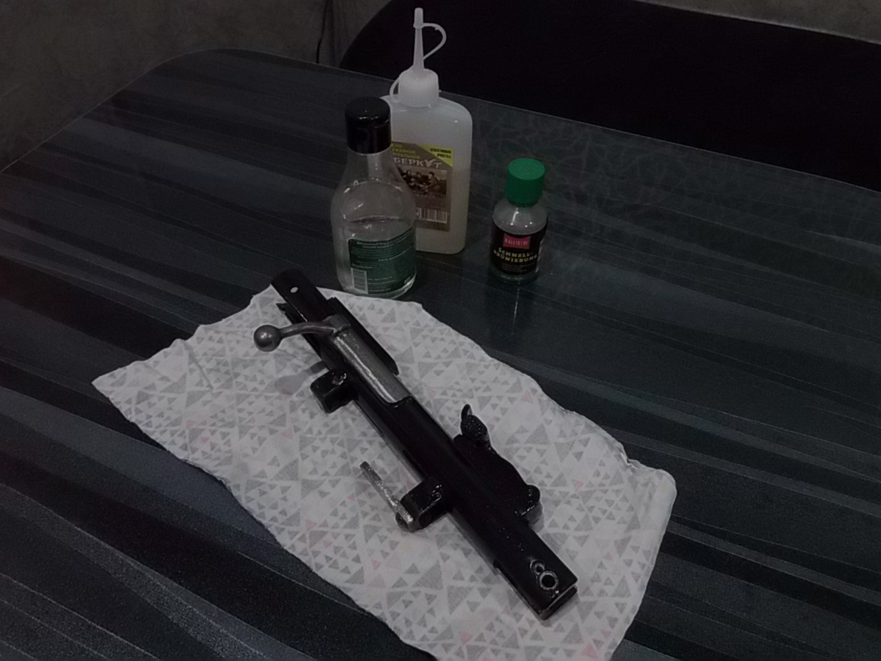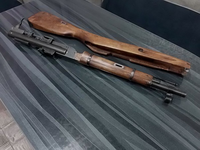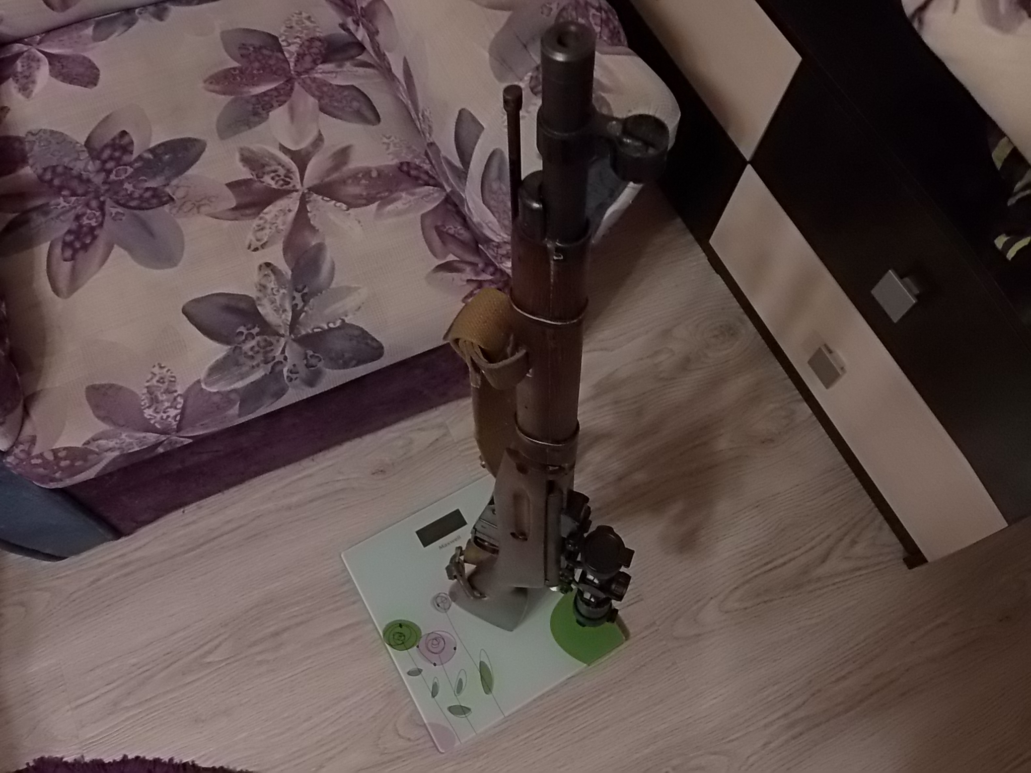 Далее нужно было обрабатывать ложу с накладкой. Складское хранение-видок конечно был не очень хороший. Старое покрытие разумеется с деревяшек нужно было снять. Пропитано дерево было от души какой-то массой напоминающей обычное машинное масло. Попробовал тереть наждачкой-три-четыре раза поёрзал и наждачка наглухо забивалась опилками, пропитанными этой массой. Решил сделать по другому,уже проверенному способу-отмочить старое покрытие в ацетоновой бане. Вот такими были деревяшки после покупки: Первым делом обмотал деревяхи в 2 слоя туалетной бумагой. Потом обернул в 1 слой нетканой салфеткой. Приготовил два пакета,скотч и брызгалку для ацетона. Вот такой вышел свёрток: На балконе(создав сквозняк) вложил свёрток в один пакет прикладом. Хорошенько со всех сторон оросил из брызгалки ацетоном этот участок. Затем второй пакет одел на цевьё,облил ацетоном со всех сторон эту часть, быстренько свернул пакеты воедино и место стыка зафиксировал скотчем туго. Т.е. сделал герметичную камеру чтобы пары ацетона испарялись не так интенсивно. Вот такой «кокон» был: Оставил часа на 3-4 свёрток. Ацетон конечно дырку себе нашёл и на балконе запашок стоял изысканный. Опасался чтобы кто-нибудь сверху мне на балкон «чинарик» не отослал. Ть-фу-ть-фу-ть-фу,но пыхнуло бы как здрасьте! А после распаковки и утилизации свёртка(сжёг на пустыре),дерево за это время подсохло. Весь лак и остальное остались на бумаге и салфетке! Оставалось теперь старательно, и в тоже время особых усилий не прикладывая, зачистить деревянные детали. Итог: Изначально думал что ложа и накладка сделаны из берёзы. Оказалось что они из кедра! Ну и сначала Р80,потом 150,после 220 номером бумаги отчистил дерево до удовлетворительного. Перед зачисткой навершие на цевье снял (откручивается 1 винтик и оно стягивается),пружины ложевых колец также извлёк из цевья (выдавливаются с левой стороны обычным шилом), а навершия на ствольной накладке снять не удалось-они заштампованы на ней. Но зачистке вовсе они и не мешали-заодно и их «освежил»,как и врезанные антабки. Затыльник с приклада снять мне не удалось. Шурупы родные оооочень здорово его держат! Даже при моих неслабых далеко «кисточках»-стронуть их хоть на полмиллиметра не удалось,а срывать шлиц красивого воронёного самореза…..Ну зачем? Жалко ведь,всё-таки оригинал, история!!! Клейма шикарнейшие были на затыльнике. Его чуть подтёр при зачистке приклада-ну не страшно! Потом я подворонил всё что надо было…