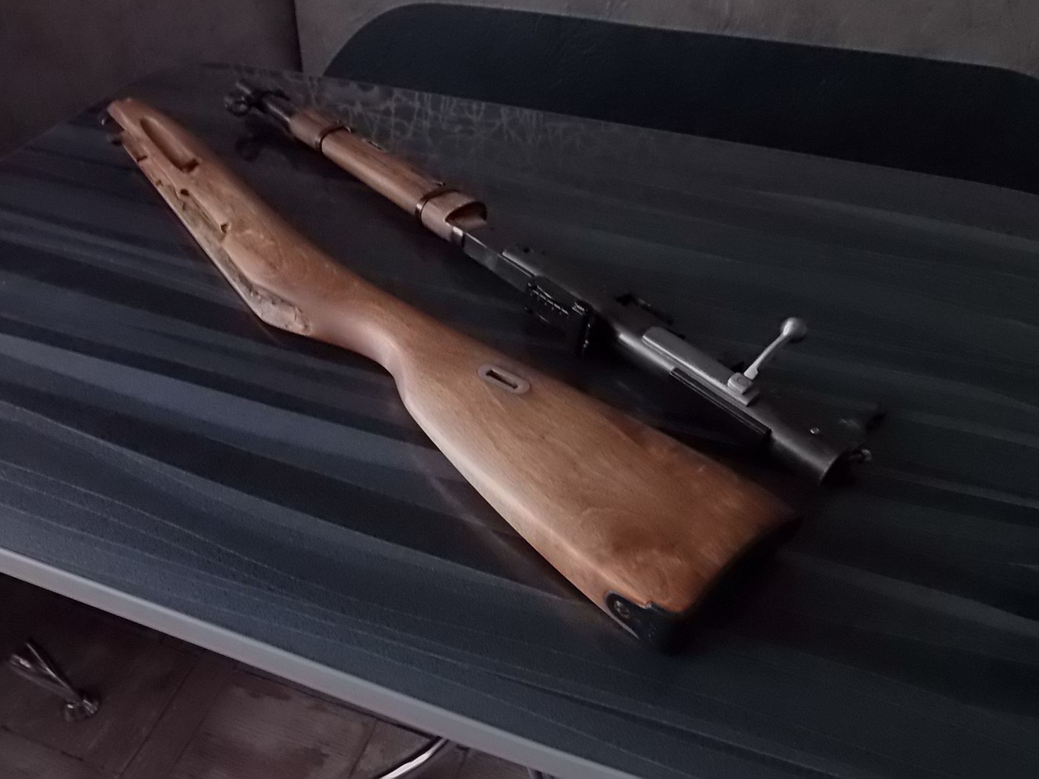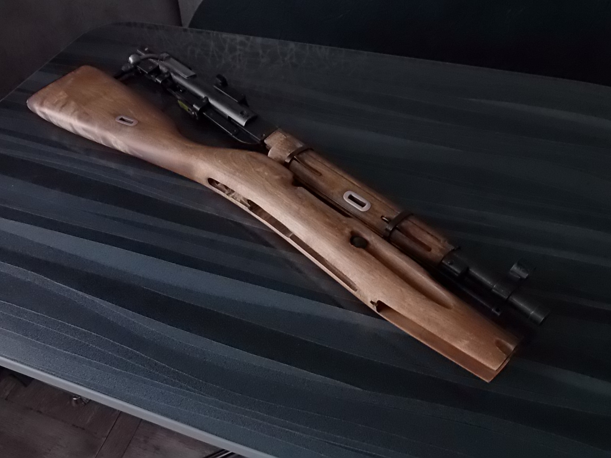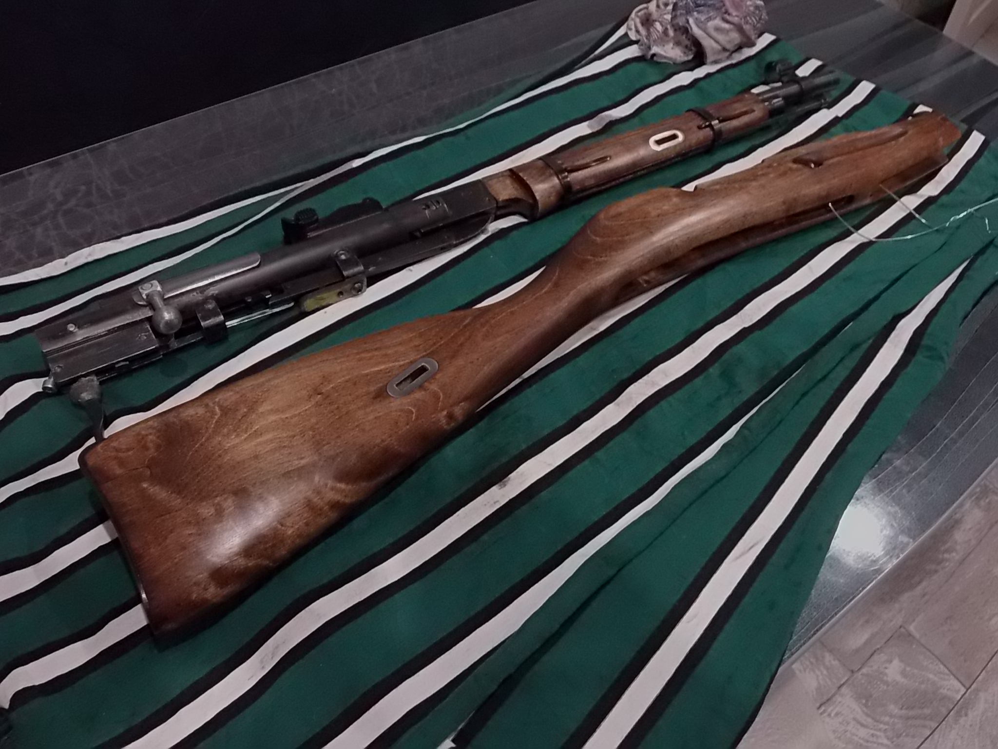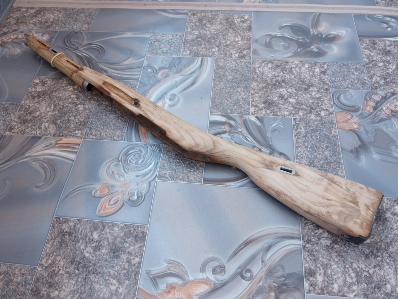 Для работы решил приобрести оригинальный комплект к карабину Мосина обр.1944года. В комплекте были: ложа оригинальная, ствольная накладка, нагель,затыльник,шомпол,ремень в полной комплектации, пружины под ложевые кольца. Антабки в ложу были уже врезаны.Приятно было что на затыльнике,ремне,ложе присутствовали клейма. Это добавляло харизмы и историчности.