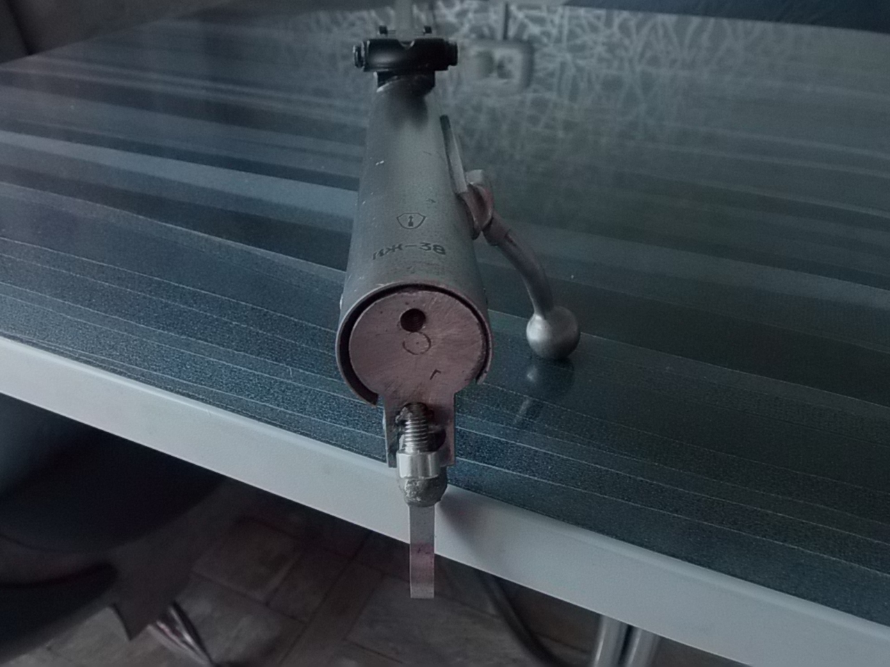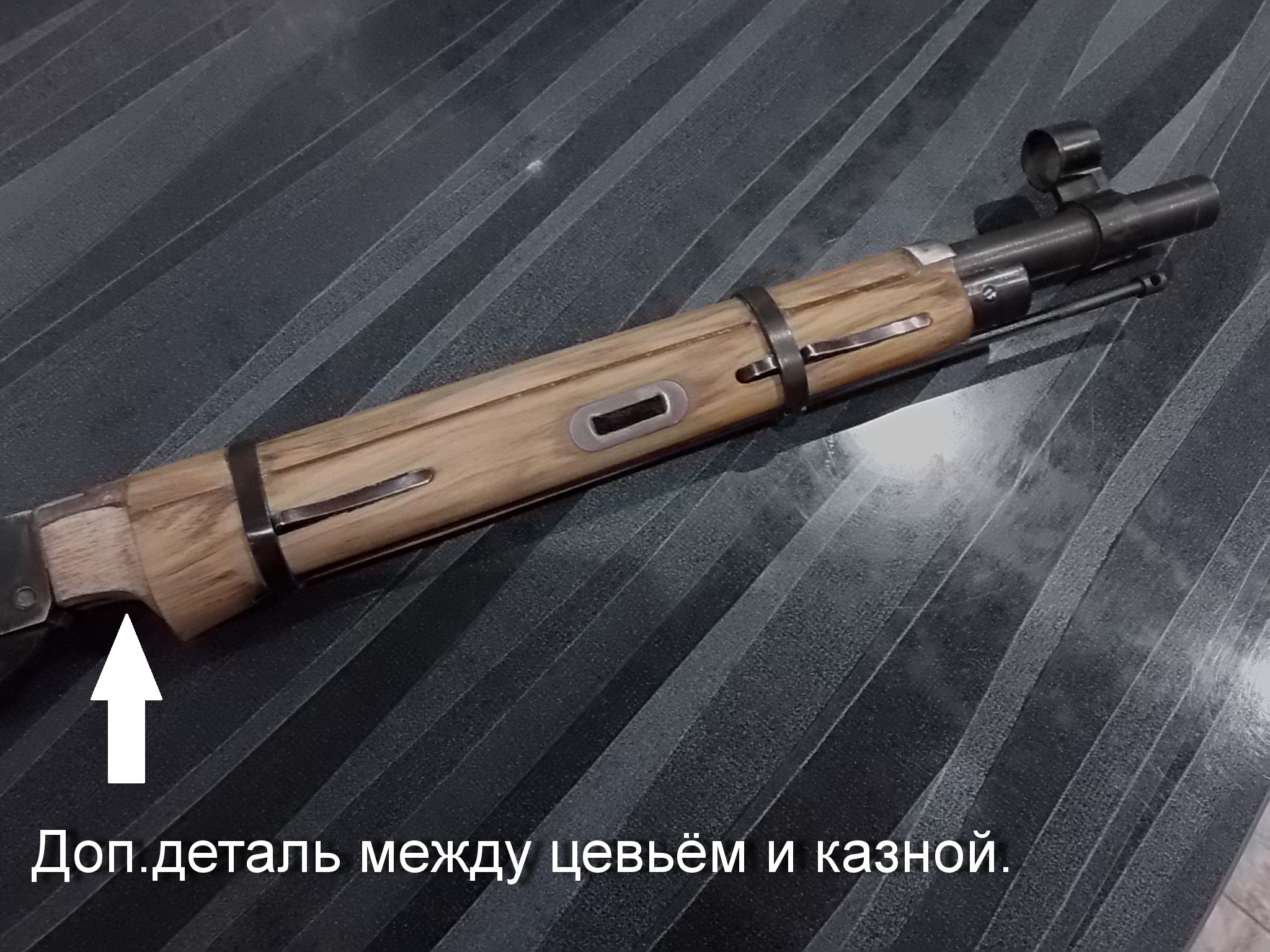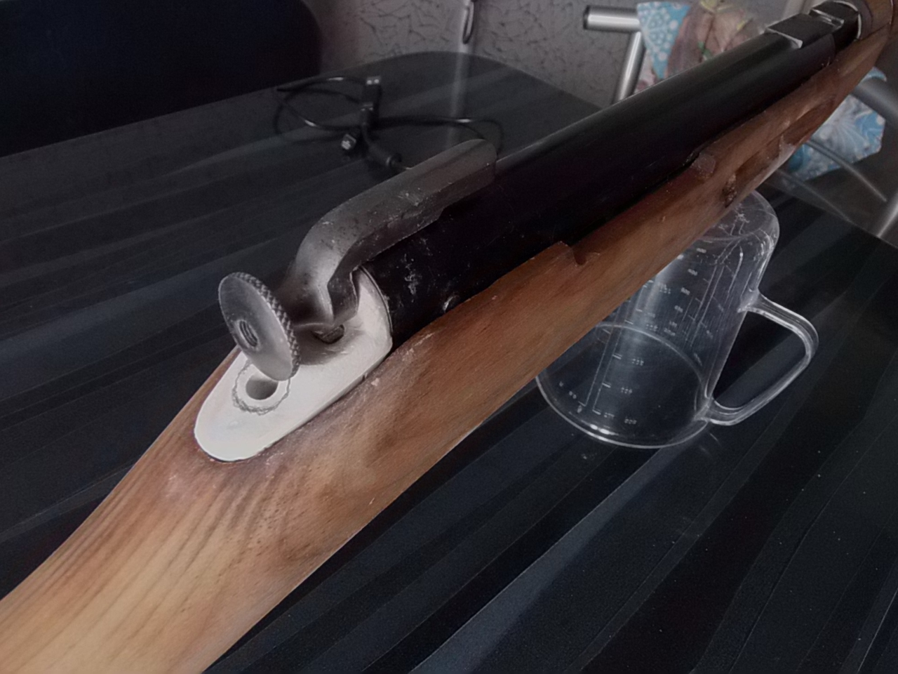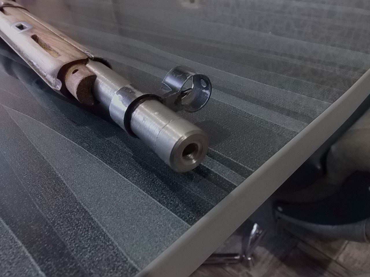 Как вы уже заметили выше-спусковой крючок удлинён. Дело в том, что стоковый крючок ИЖа короткий при вставке в ложу, и сильно! Нарастил его новым-отыскался вот такой крючок: Обработал его, отпилил нужное от родного ижевского крючка, подогнал под него новый и скрепил арамидной нитью на клею ЭДП и металл.опилками. Получилось мёртвое соединение! Отлично стоит крючок удлинённый!!! Компрессор теперь уже заворонил с помощью «Клевера», обработал маслом: Дело дошло до ствола. Родной ижевский ствол решил не воронить. На него будет крепиться фальшствол. С ним помогли также друзья-товарищи Саша и Артём. Выточили мне стальную трубку имитирующую ствол мосинской винтовки и переднюю втулку в этот фальшствол. Она на резьбе вкручивалась в трубку. Передок (втулка) имитировал дульный срез винтовки Мосина, даже дульное отверстие во втулке рассверлил я до 7,62мм. Ну….Так захотелось-пускай будет)))) На фальшствол изготовил кольцевой намушник с мушкой. Хотел именно кольцевой, а не открытую мушку. Сделал его из ижевского стального намушника с небольшой доработкой. Надёжно приклеил в нём мушку. Закрепил его с помощью клея с металл.пылью на фальшстволе,а для пущей надёжности снизу в намушнике просверлил небольшое отверстие и пару раз электродом дотронулся-т.е. приварил его. Место сварки старательно обработал-теперь намушник и при желании не стянешь и не провернёшь на фальшстволе. Примерил: