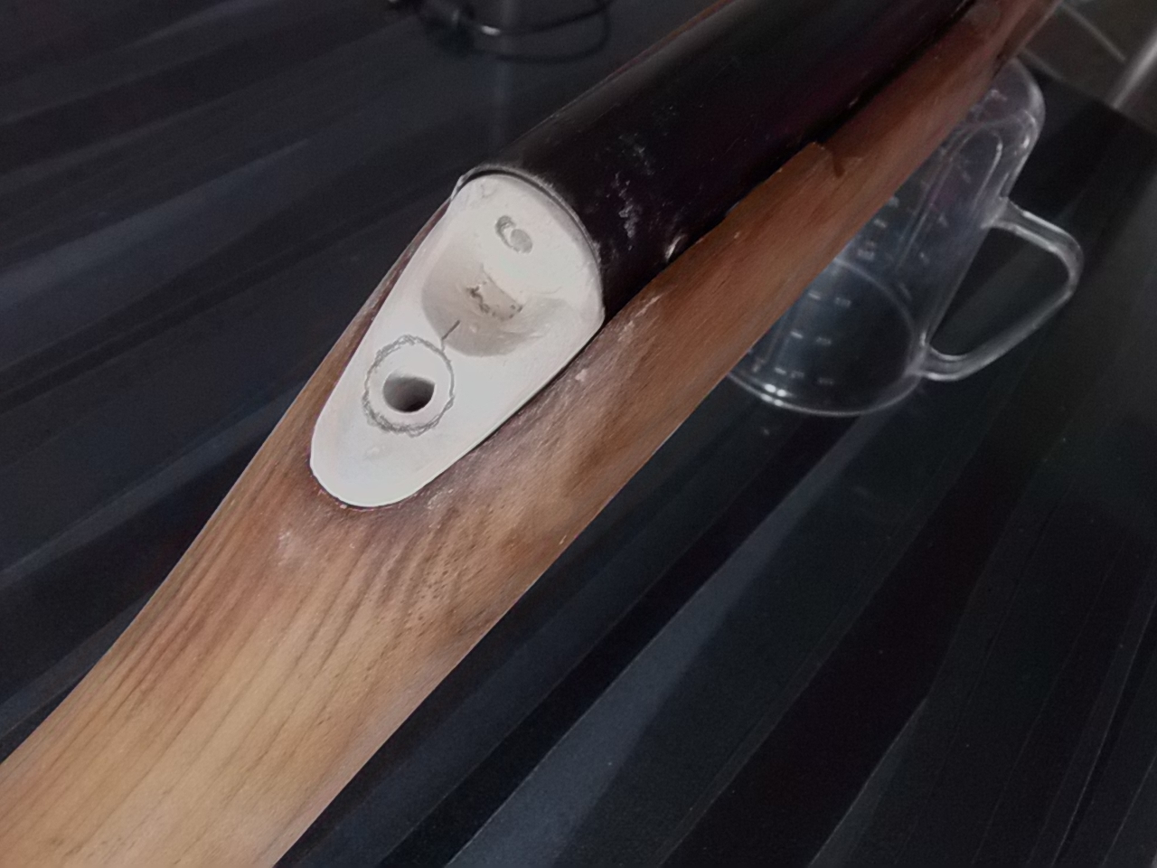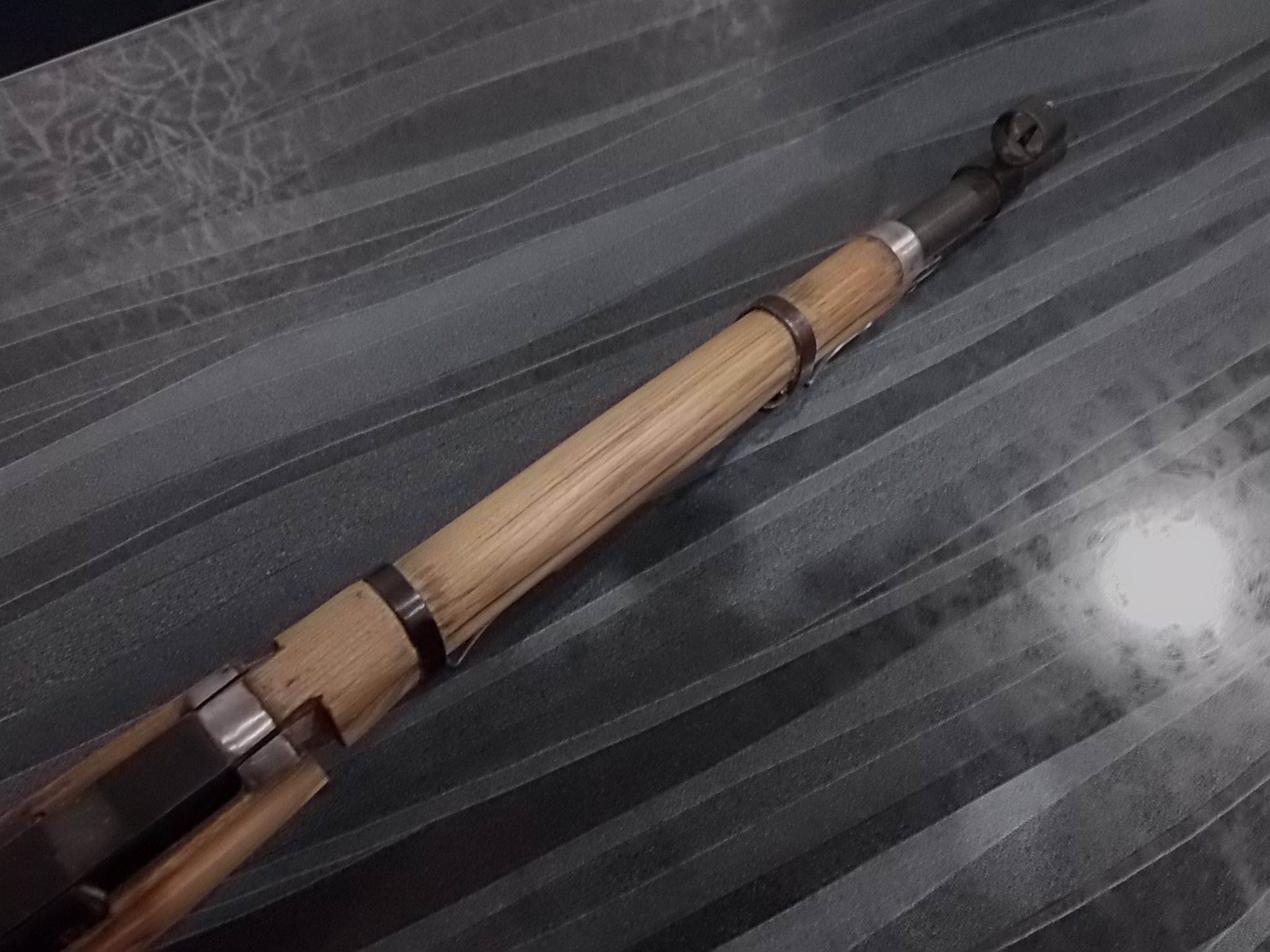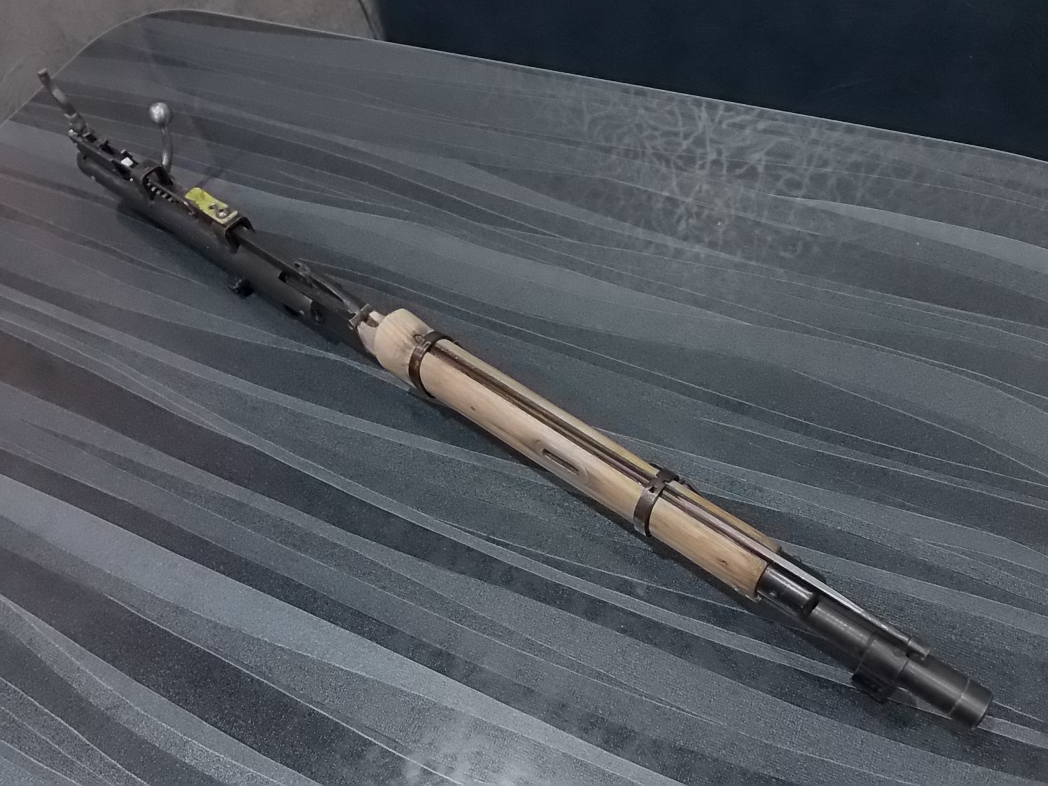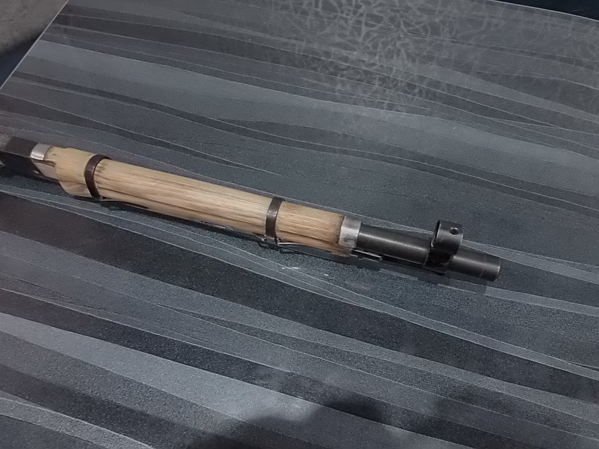 Как вы уже заметили выше-спусковой крючок удлинён. Дело в том, что стоковый крючок ИЖа короткий при вставке в ложу, и сильно! Нарастил его новым-отыскался вот такой крючок: Обработал его, отпилил нужное от родного ижевского крючка, подогнал под него новый и скрепил арамидной нитью на клею ЭДП и металл.опилками. Получилось мёртвое соединение! Отлично стоит крючок удлинённый!!! Компрессор теперь уже заворонил с помощью «Клевера», обработал маслом: Дело дошло до ствола. Родной ижевский ствол решил не воронить. На него будет крепиться фальшствол. С ним помогли также друзья-товарищи Саша и Артём. Выточили мне стальную трубку имитирующую ствол мосинской винтовки и переднюю втулку в этот фальшствол. Она на резьбе вкручивалась в трубку. Передок (втулка) имитировал дульный срез винтовки Мосина, даже дульное отверстие во втулке рассверлил я до 7,62мм. Ну….Так захотелось-пускай будет)))) На фальшствол изготовил кольцевой намушник с мушкой. Хотел именно кольцевой, а не открытую мушку. Сделал его из ижевского стального намушника с небольшой доработкой. Надёжно приклеил в нём мушку. Закрепил его с помощью клея с металл.пылью на фальшстволе,а для пущей надёжности снизу в намушнике просверлил небольшое отверстие и пару раз электродом дотронулся-т.е. приварил его. Место сварки старательно обработал-теперь намушник и при желании не стянешь и не провернёшь на фальшстволе. Примерил: