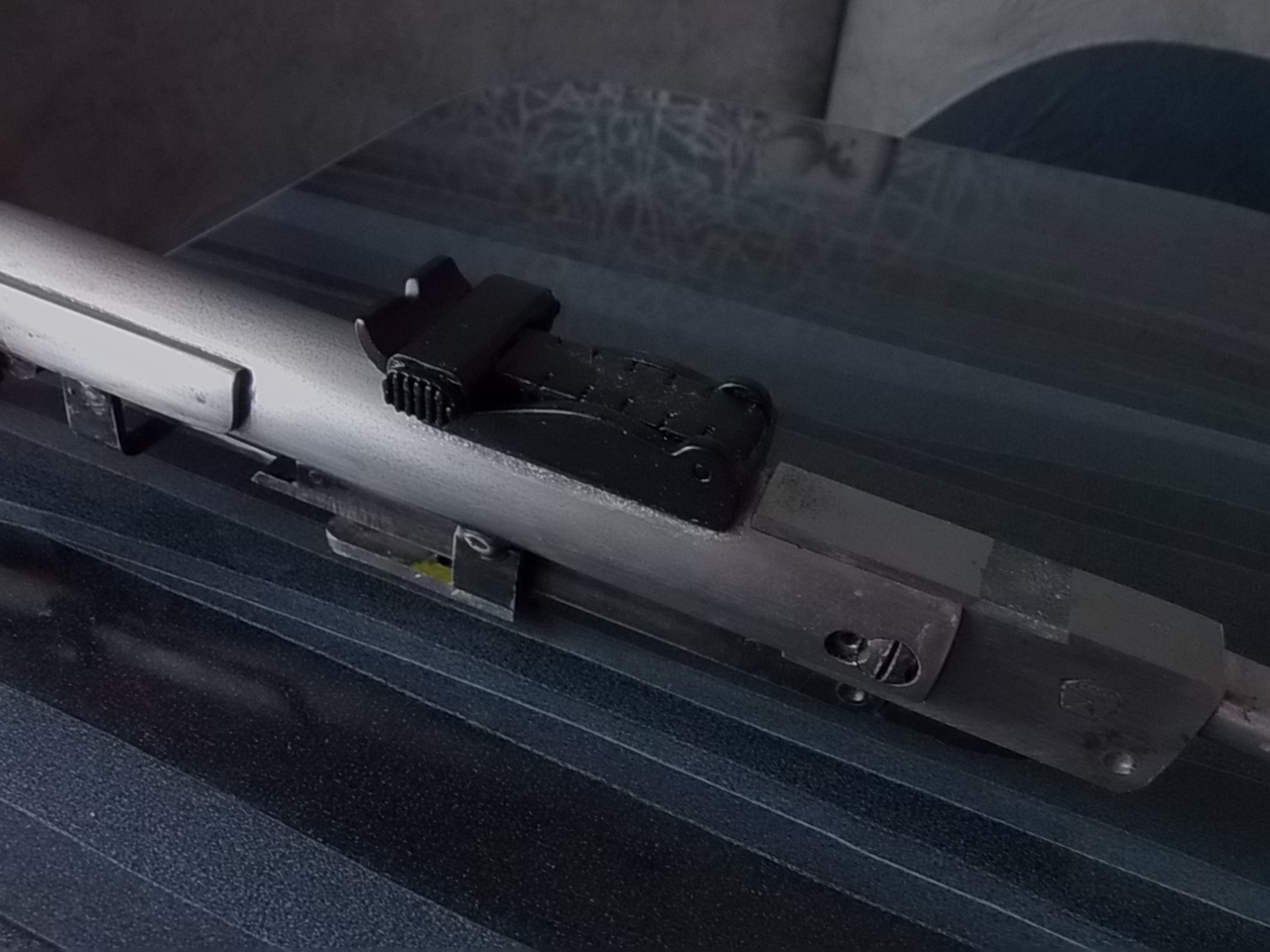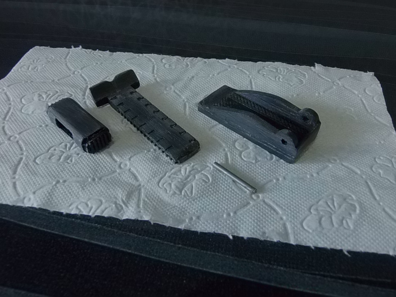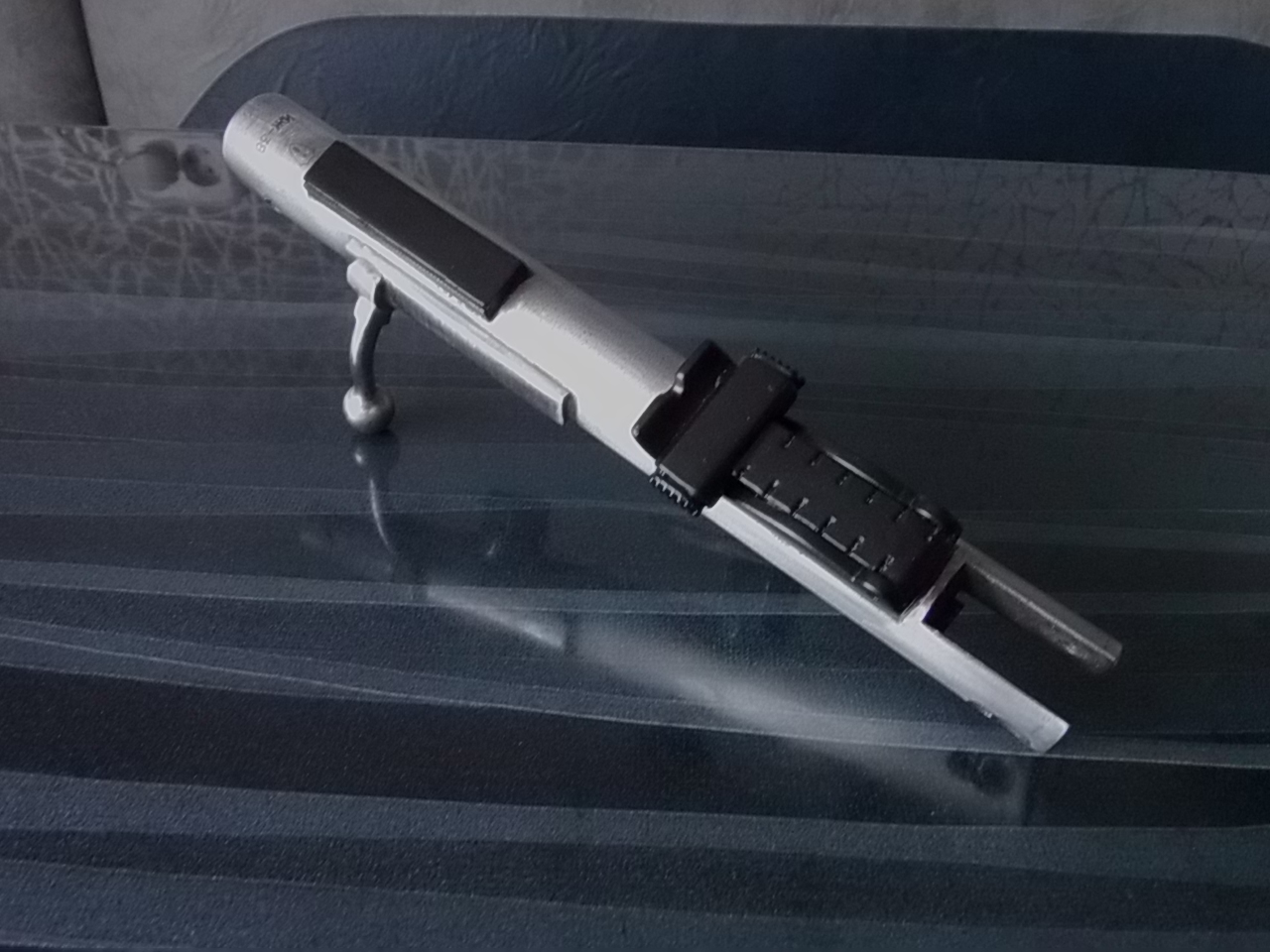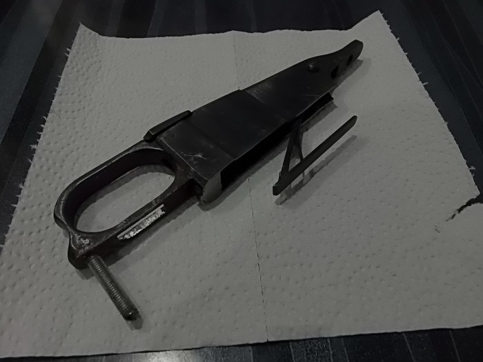 Пока ожидал приезда деталей, занялся магазин.коробкой. С ней мне тоже дружок К. помог, частенько выручает меня всякими «железками» мелкими. Коробка в целом была исправна-хотя это было не так важно. Но всё же исправная кнопка,подаватель и клейма на крышке были безусловно приятны и подчёркивали подлинность её. Резьба к сожалению в заднем крепеже была сорвана. Но это была не проблема! Прежде всего обрезал коробку болгаркой в верней части до нужной мне высоты. Целая коробка упиралась во вставленное в ложу железо. А в заднее крепёжное отверстие врезал на ЭДП с метал.опилками шпильку стальную с резьбой М6. Приготовил для крепежа через «лапку» и втулку. Сделал её из мебельной стяжки чуть доработав её и заворонил. Ну и как раз приехал мне набор из «лапки», комплекта целика. Всё примерил,чуть-чуть доработал «лапку» для более точной посадки, проверил совпадения всех отверстий в ней,просверлился и нарезал резьбу как планировал в заднике УСМ под винт в передней стенке «лапки». Вот такая чудная и надёжная деталька, всё идеально было выполнено Русланом!!! Мне осталось только загрунтовать её после лёгкой зачистки и окрасить чёрной матовой аэрозольной краской. Закрепил краску матовым лаком. Втулка под шпильку как и требовалось в отверстии вставала под некоторым углом. И вот так выглядело и примерно собиралось-втулка на шпильку коробки,винт через «курок» и «лапку» в задник УСМ: Целик с колодкой разобрал, все следы печати зачистил, зашпаклевал смесью ЭДП с метал.опилками, зачистил снова, загрунтовал эпоксидным грунтом аэрозольным и окрасил чёрной матовой краской+лак матовый. После зачистки сразу всё собрал на ЭДП-потому целик и ползун неподвижны. Не планировалось использовать открытые прицельные, а установить оптический прицел в кронштейне. Чтобы надёжно закрепить её на компрессоре, сделал на нём напильником хаотичные риски и после на цианокрилатный клей с латунными опилками приклеил колодку с целиком. Вот почти всё рассказанное: Далее приступил к изготовлению имитации затвора. У меня был кусок затвора от винтовки Мосина, но он был коротким прямым. Учитывая что планировался «снайперский» карабин-стебель нужен был загнутый вниз. Ну так более соответствующе-верно? В закромах отыскался постаревший кусок затвора от тульской мелкашки. Отрезал его, почистил, слегка отполировал и стал он отменно выглядеть. К тому же он был именно загнутый. Из куска подходящей стальной трубы отпилил болгаркой необходимый кусок, обработал,просверлил два небольших отверстия, вставил «железо» в ложу, на компрессоре отметил место крепления «затвора». Прихватил его к компрессору с помощью ЭДП с метал.пылью, через просверленные отверстия приварил, старательно обработал, отполировал. Мест сварки стало практически не видно. Как не пробовал приварить к «затвору» стебель так как надо-не получилось. Потому просверлился в его основании, нарезал резьбу М3, в приваренном «затворе» также отметил место крепления стебля,просверлил отверстие в «затворе» сквозь стенку компрессора и нарезал такую же резьбу. Подобрал подходящий винт М3, притянул стебель к «затвору» на клею с опилками для надёжности. Кончик винта буквально на 0,5мм торчал внутри компрессора-после высыхания клея обработал его надфилями. Ну и шляпку винта соответственно сточил заподлицо с основанием стебля. К сожал