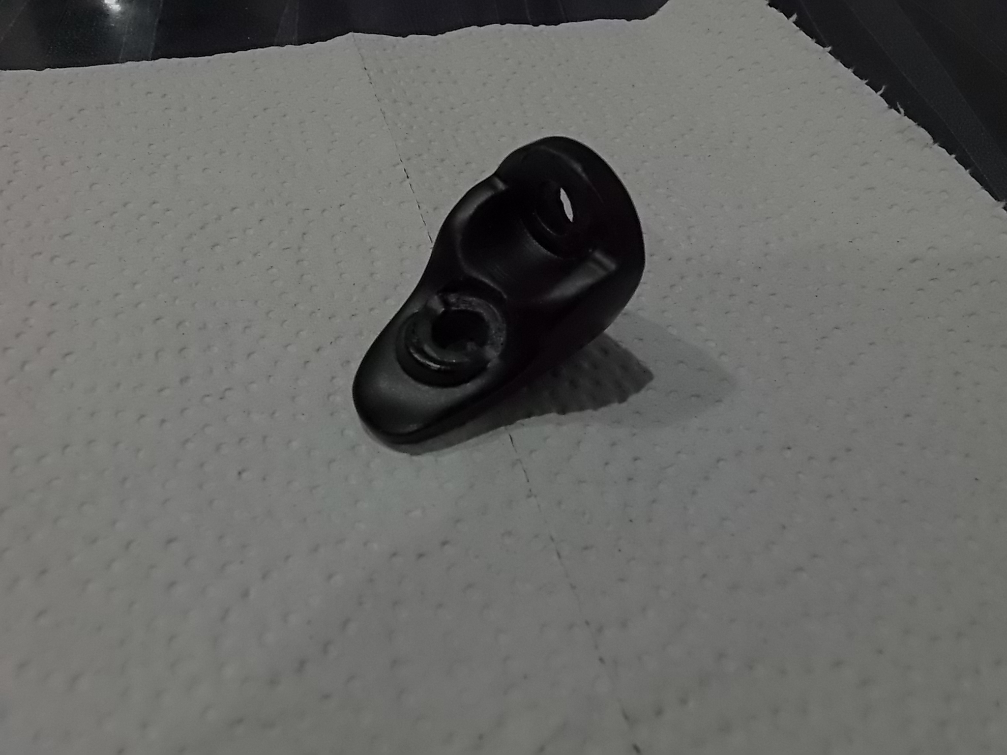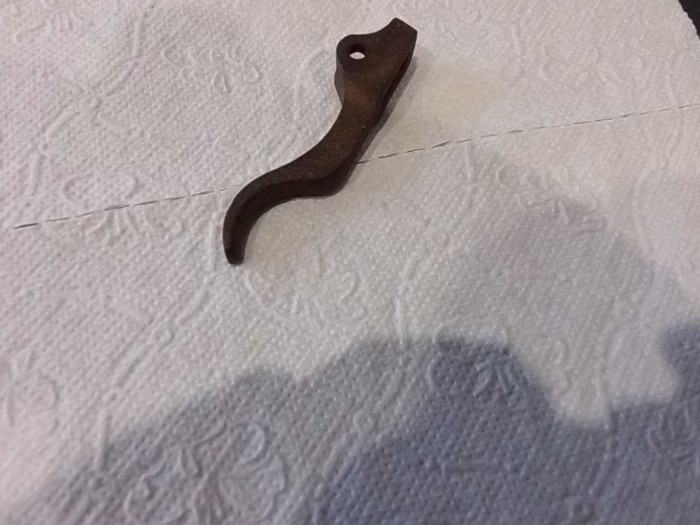 В заднике УСМ ИЖа сверлю отверстие,нарезаю резьбу М5. Устанавливаю «лапку» в выборку под неё за компрессором,в передке отверстие под винт М5,отмечаю на заднике УСМ центр этого отверстия,сверлю там его,нарезаю резьбу М5. Т.е. «лапка» крепится к заднику УСМ жёстко. Но! Кроме этого в это же отверстие крепим и «курок»!!! В основании «лапки» второе отверстие-уже под винт М6. Оно абсолютно точно совпадает с отверстием в ложе для крепежа магазинной коробки сзади. Т.е. принцип практически как в оригинальном крепеже. Ну чуток наоборот-о этом позже. Вкрученный винтик в задней части УСМ снизу-служит для упора железа винтовки в выступ в выборке родной. Он упирается в ступеньку и жёстко держит «железо» винтовки в задней части, помогает точнее надёжно крепиться ему в ложе. Ну а основной крепёж-как сказано выше. Это та самая «лапка» объединённая с задником винтовки и магаз.коробкой. В общем сделал я слепок нужной мне «лапки» в заднюю часть ложи. Решили что будет правильно напечатать эту деталь из отменного пластика со 100% заполнением его. Чтобы была «как камень». Ну и отправил Руслану сделанный слепок: Найти более короткую в отличии от винтовочной карабинную колодку с целиком возможности не нашлось. Потому заодно с «лапкой» попросил дружка напечатать мне на 3D принтере и эти детали-колодку, целик, ползун и….ось целика и ту-он мне тоже к слову положил в набор)))
