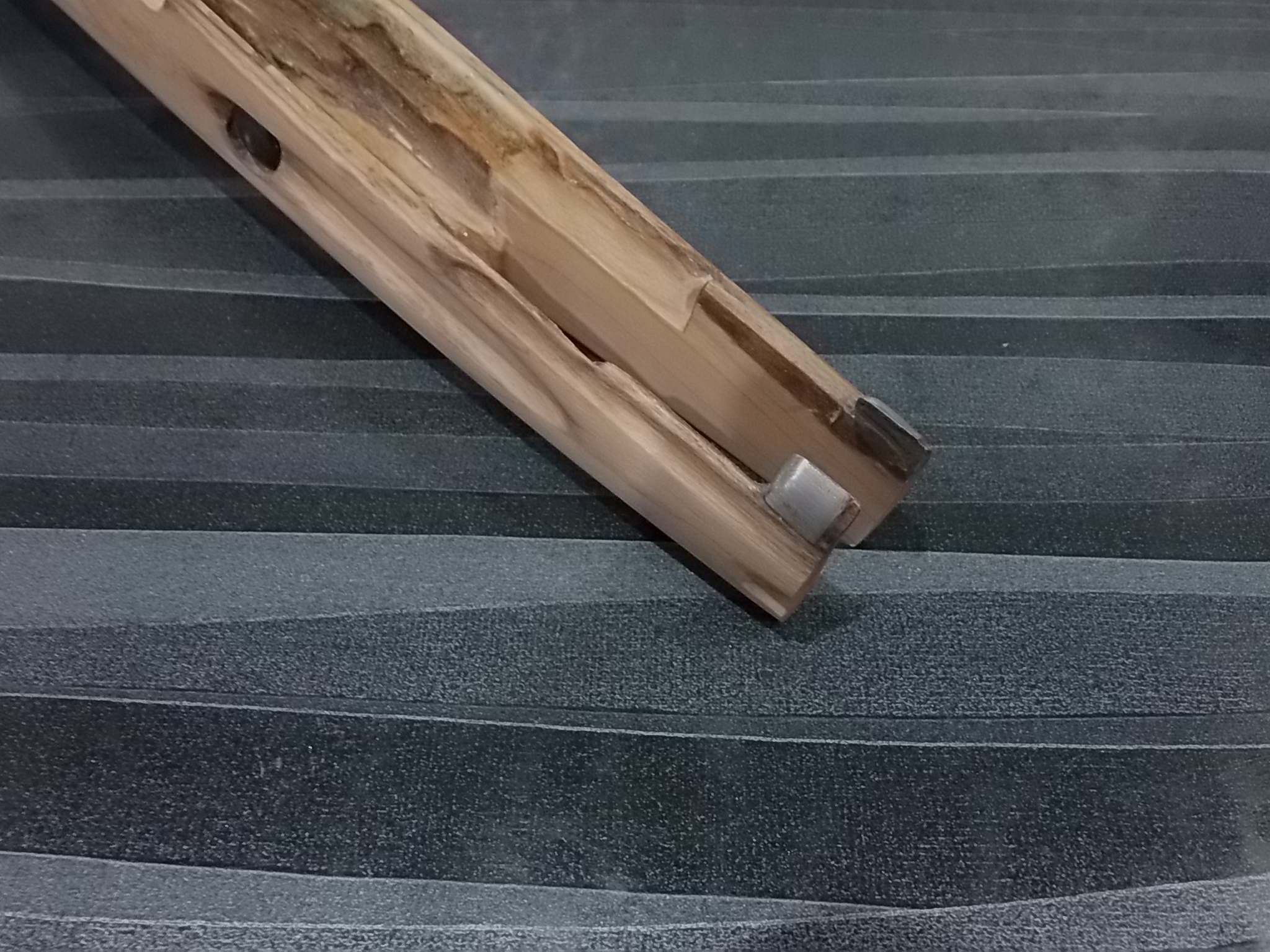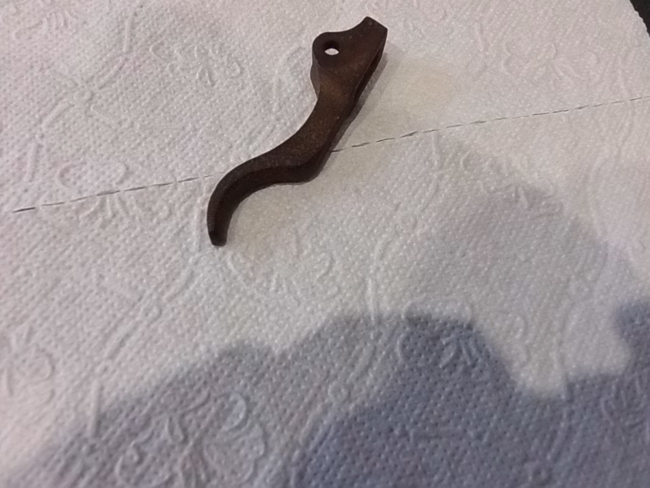 Теперь пришло время подумать о выборке под «донора» в ложе. Предварительно обдумал как буду крепить «железо» ИЖа в ложе. Принял решение использовать оба отверстия крепежа магазинной коробки. Т.е. точки крепления коробки и ИЖа сделать общими. После примерки определил на сколько нужно сместить переднее крепёжное отверстие ИЖа чтобы скрепить его с коробкой. Для этого сделал этакую «лыжу» из 6мм металла. Сделал отверстие в ней, нарезал резьбу М5 в нём и скрепил винтом на ЭДП с металл.опилками.Отверстие резьбовое рядом-это и есть новое крепёжное отверстие,оно общее с передним отверстием крепежа коробки магазинной: В общем ИЖика я в ложу «поселил» постоянно примеряя при обработке. Ну и теперь принялся за задний крепёж. В винтовках и карабинах Мосина под курком есть так называемая «лапа»-она и служит для притягивания винтовки к коробке и таким образом крепится в ложе она в задней части. Решено было повторить это решение. За помощью обратился к дружку Руслану. Ну этого парня я буду хвалить часто-потому как есть за что! Скажу честно-если бы не он, то скорее всего и эта работа, и те которые нынче в стадии старта у меня не вышли бы!!! Необыкновенно талантливый и мыслящий человек-нет пожалуй того, чего он сделать не смог бы! Обрезал и доработал до нужного мне размера родной мосинский деактивированный курок. Принцип был таким!!!