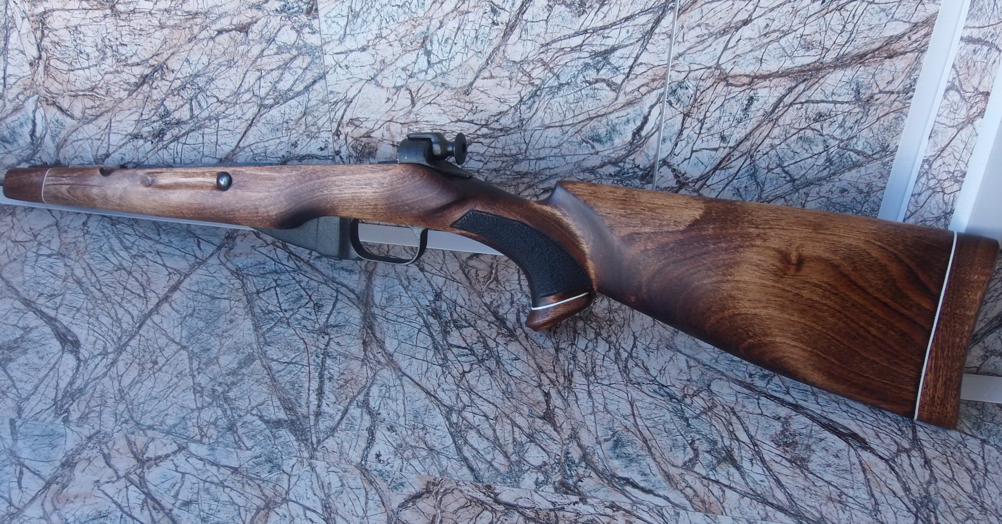 Вот такой стала старательно изготавливаемая ложа для лёгкого карабинчика. На плоскостях всё же и берёзка порадовала и наградила за старания интересной текстурой. Да… Это не орех, не бук и т.д. и т.п. Но всё же и берёза может быть красивой вполне и годной в ложестроении. Даже несколько интересный эффект есть в ложе-«хамелеонит» древесина при осмотре с разных углов. Вроде глянешь на определённое место-кажется темноватым оно,а повернёшь другим углом-становится светленьким это место. Несколько фото ложи и затем получившийся карабин. Отличный внешне, сбалансированный, прикладистый, лёгкий…. Очень шикарное прицеливание по открытым прицельным. При установке оптики не снимая её можно также использовать открытые прицельные-кронштейн этот (ЭСТ-78) с «сквозняком» и ничего не мешает прицеливанию. Одним словом все свои задумки, прихоти я полностью удовлетворил. Карабин будет одинаково удобен и правше и левше, взрослому человеку (даже такому крупному как я), вдвойне интересен и прост он будет и для какого-то начинающего стрелка под родительским присмотром разумеется. Скрывать не буду-данный проект рассчитывался изначально как коммерческий, скорее всего карабин будет искать новые заботливые руки. Если останется у меня-не огорчусь нисколько. Отличная единичка в свою коллекцию. Ну вот что вышло из этой затеи у меня. Пара фоток ложи поближе, общий вид ложи: