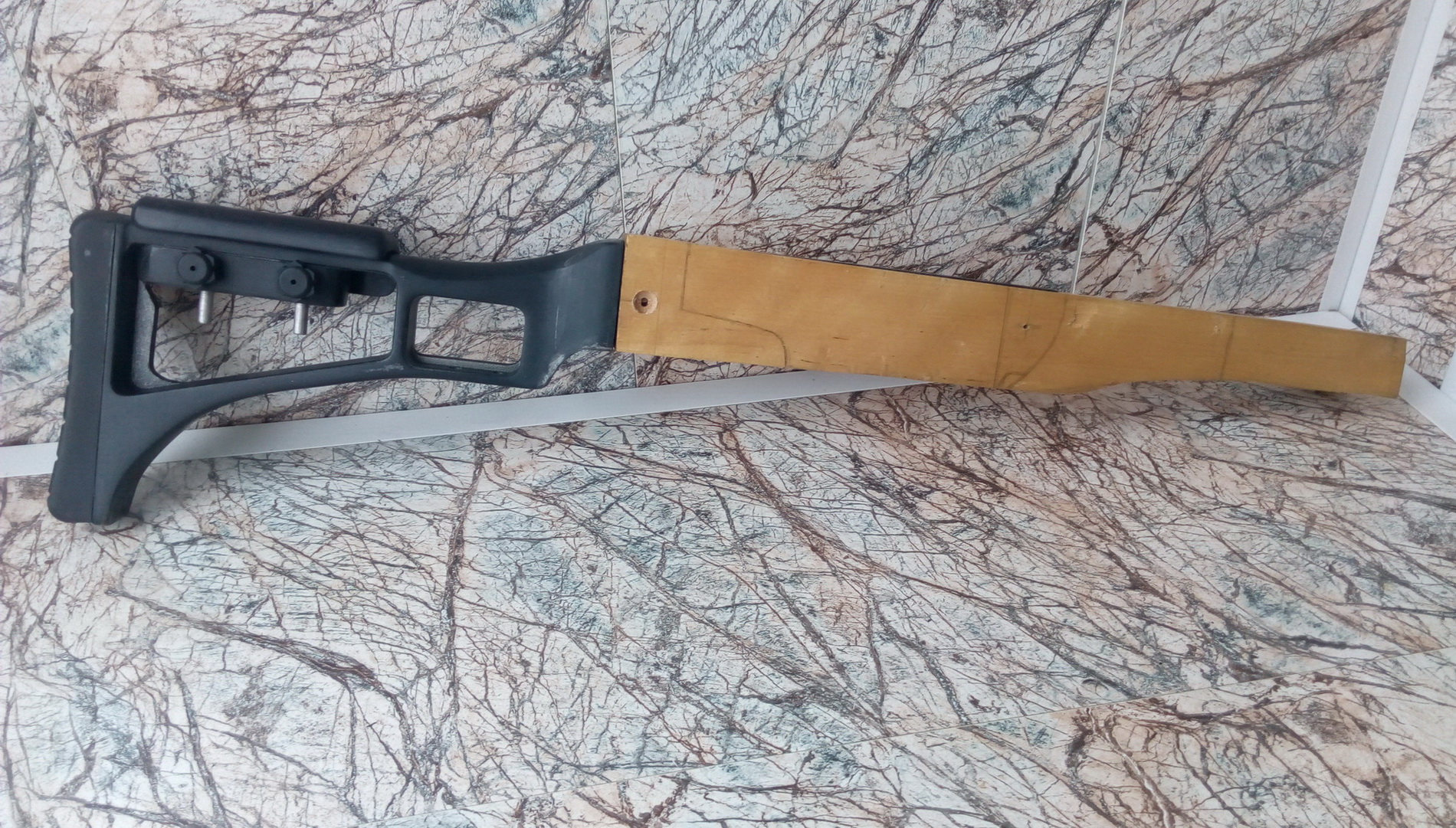 Примерил снова-отлично!!! Пластик плотный и закрутить в него саморез длинный в предварительно засверленное под него отверстие было возможно. Т.е. сверху впереди один саморез через ложу в пистолетную рукоять, второй длинный саморез примерно посередине перемычки закрутить через перемычку в ложу, при этом шляпка самореза пряталась разумеется в этой перемычке чтобы не натирала руку при хвате. Аккуратно насверлил по 2 нужных отверстия в рукояти и ложе. Чтобы спрятать головку самореза в перемычке (сверлить под неё было невозможно)-я нагрел на газовой горелке саморез и вставив его в отверстие с нужной стороны, плоскогубцами втиснул его в перемычку горячим на нужную глубину. Вытащил саморез, после остывания обуглившиеся края отверстия(зенковки под шляпку) аккуратно обработал напильником мелким и бумажками. Вышла аккуратная луночка под шляпку самореза. И используя всевозможный пластик сделал спусковую скобу симпатичную, наклеил по бокам верха рукояти стенки из тонкого пластика-предварительно разогревая выгнул их необходимой формы и вклеил сделанную спусковую скобу. Собирал всё на цианокрилат. Закрепил рукоять со скобой на ложе двумя саморезами-под спусковую скобу в ложе выбрал необходимые формы для вклейки краёв, сделал метку для сверления нижнего крепёжного отверстия «железа» в ложе. Просверлил его-всё совпало точно. Вставил в пустотку между приклеенными стенками от рукояти к скобе пластиковую трубку строго по центру просверленного крепёжного отверстия. В трубку вставил стальную втулку под крепёжный винт М4-она не даст при затяжке винта продавить пластик и древесину. Трубку с втулкой приклеил торцом плотно к ложе. Это чтобы выставить её точно под крепёжный винт и чтобы не пролился внутрь заполнитель. Заполнить оставшуюся пустоту решил смесью клея ЭДП и мелкой пластиковой пыли. Ну и после высыхания всё обработал, подогнал одно к другому. Вот такая рукоять со скобой у меня вышли:
