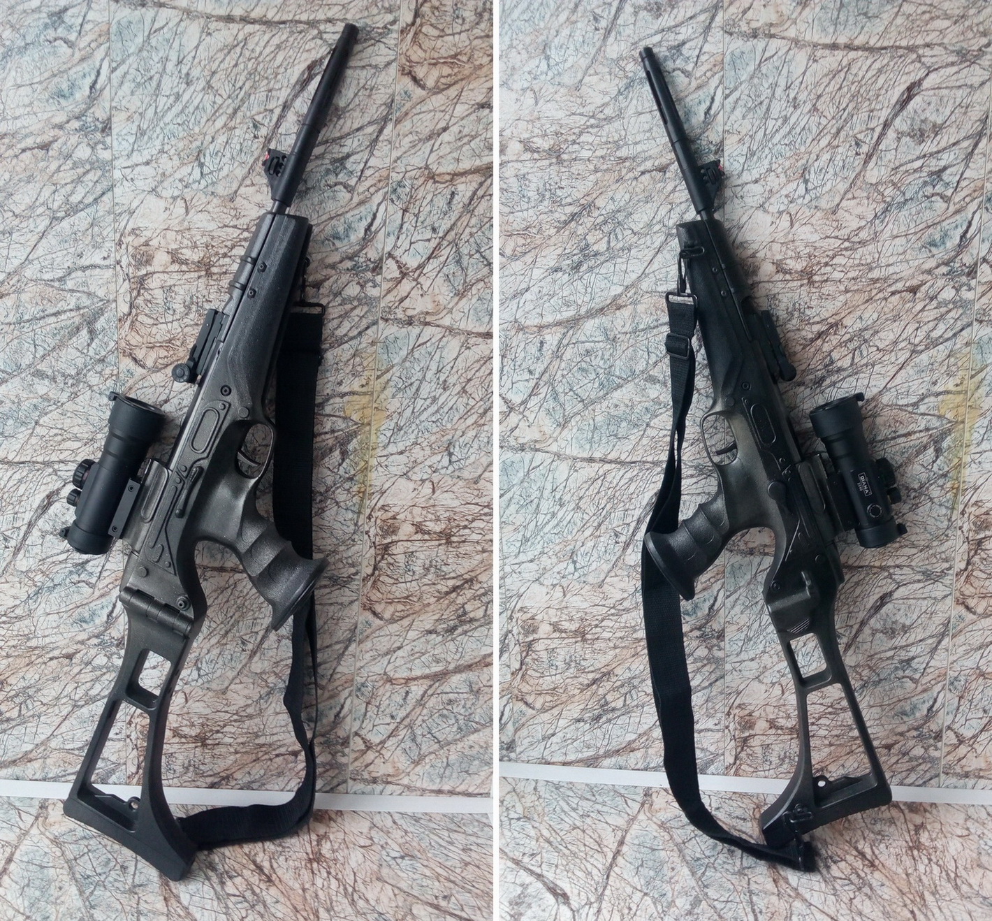 В итоге выходит такой вариант. Владелец доволен вроде и "кулямётом" и прицельными приспособами. Оптику пока не рассматривает-хватает и открытых прицельных и данного коллиматора. Вариант с новым коллиматором: