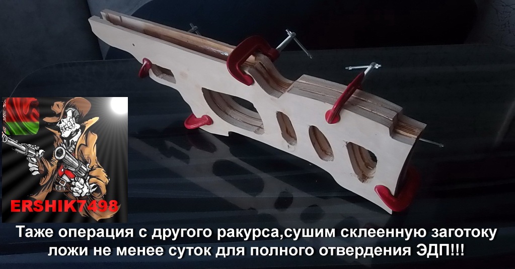Дайте высохнуть склеенным заготовкам как рекомендуют не меньше суток.Затем снимите струбцины,и повторите процесс с приклеиванием второй боковины ложи.К слову,если Вы уверены в себе,можно склеить сразу все заготовки ложи,я клеил поочерёдно каждую чтобы иметь возможность проследить точно за смещениями заготовок а в частности полочек под «железо».Сушим также наше творение не менее суток!Вот: