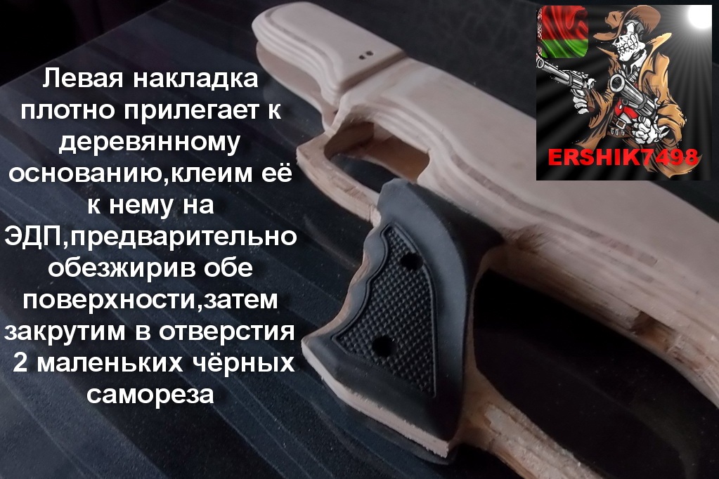 Сразу скажу что на этот винт будет при сборке одет гравер,а на гравер положим шайбу-это поможет чтобы винт с гравером не продавил древесину.Пистолет при взводе достаточно тугой,при взводе мы будем применять усилие на ствол,следовательно задняя часть «железа» будет стремиться поднятся.Винт нужно будет зажать достаточно туго,но без фанатизма,чтобы не наломать дров,сорвав резьбу в «железе».Тоже касается и боковых винтов-под них нужно будет положить обязательно шайбы!Теперь мы подошли к склеиванию заготовок нашей ложи.
