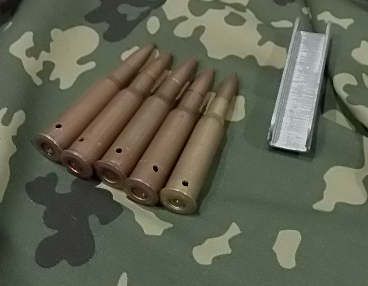 Пока ожидал приезда деталей, занялся магазин.коробкой. С ней мне тоже дружок К. помог, частенько выручает меня всякими «железками» мелкими. Коробка в целом была исправна-хотя это было не так важно. Но всё же исправная кнопка,подаватель и клейма на крышке были безусловно приятны и подчёркивали подлинность её. Резьба к сожалению в заднем крепеже была сорвана. Но это была не проблема! Прежде всего обрезал коробку болгаркой в верней части до нужной мне высоты. Целая коробка упиралась во вставленное в ложу железо. А в заднее крепёжное отверстие врезал на ЭДП с метал.опилками шпильку стальную с резьбой М6. Приготовил для крепежа через «лапку» и втулку. Сделал её из мебельной стяжки чуть доработав её и заворонил.