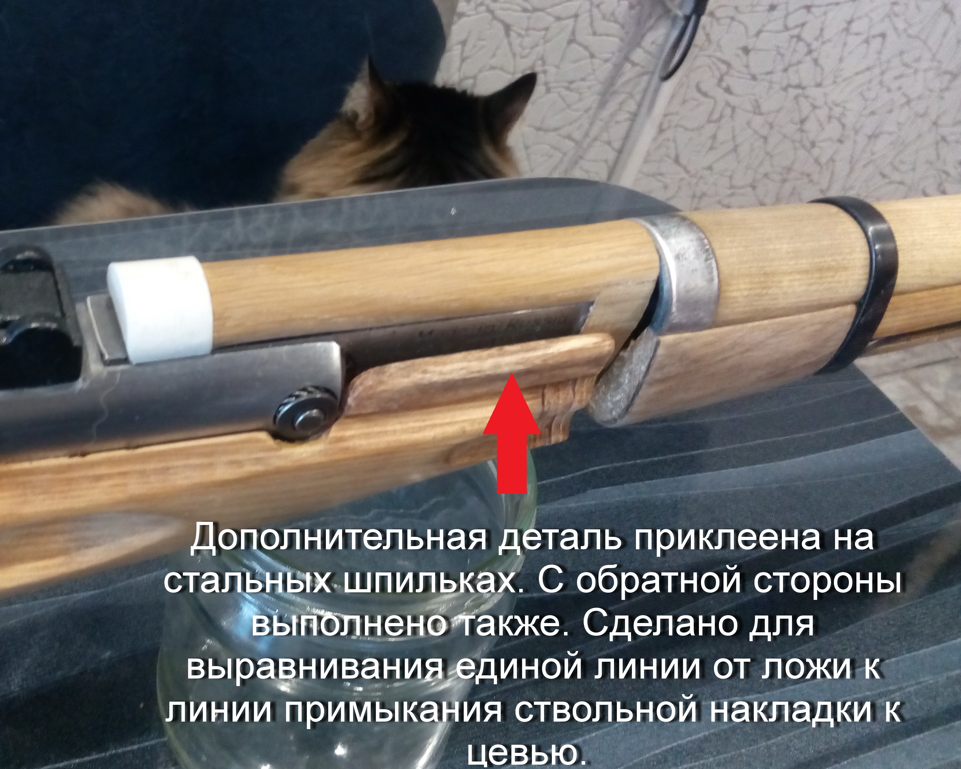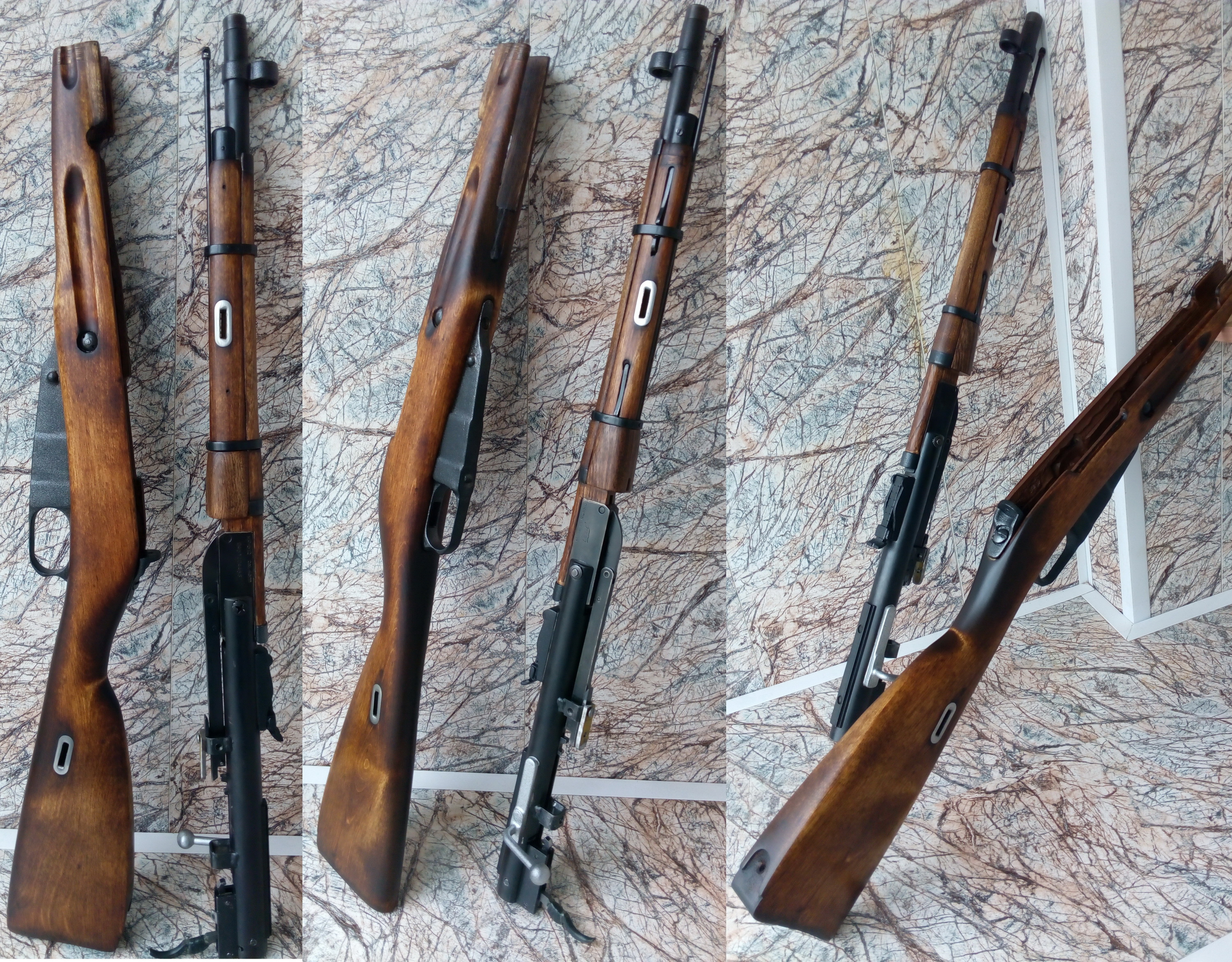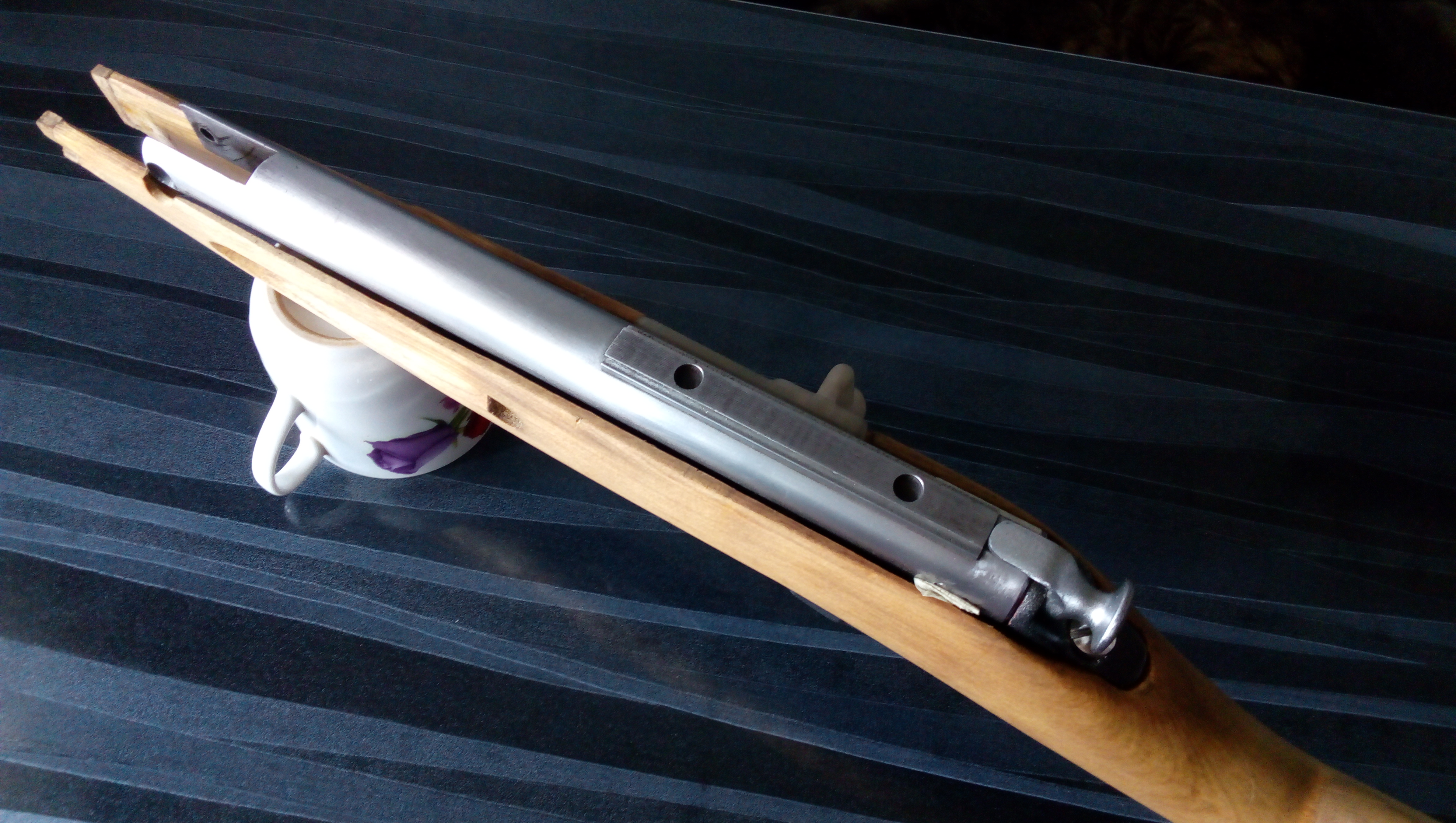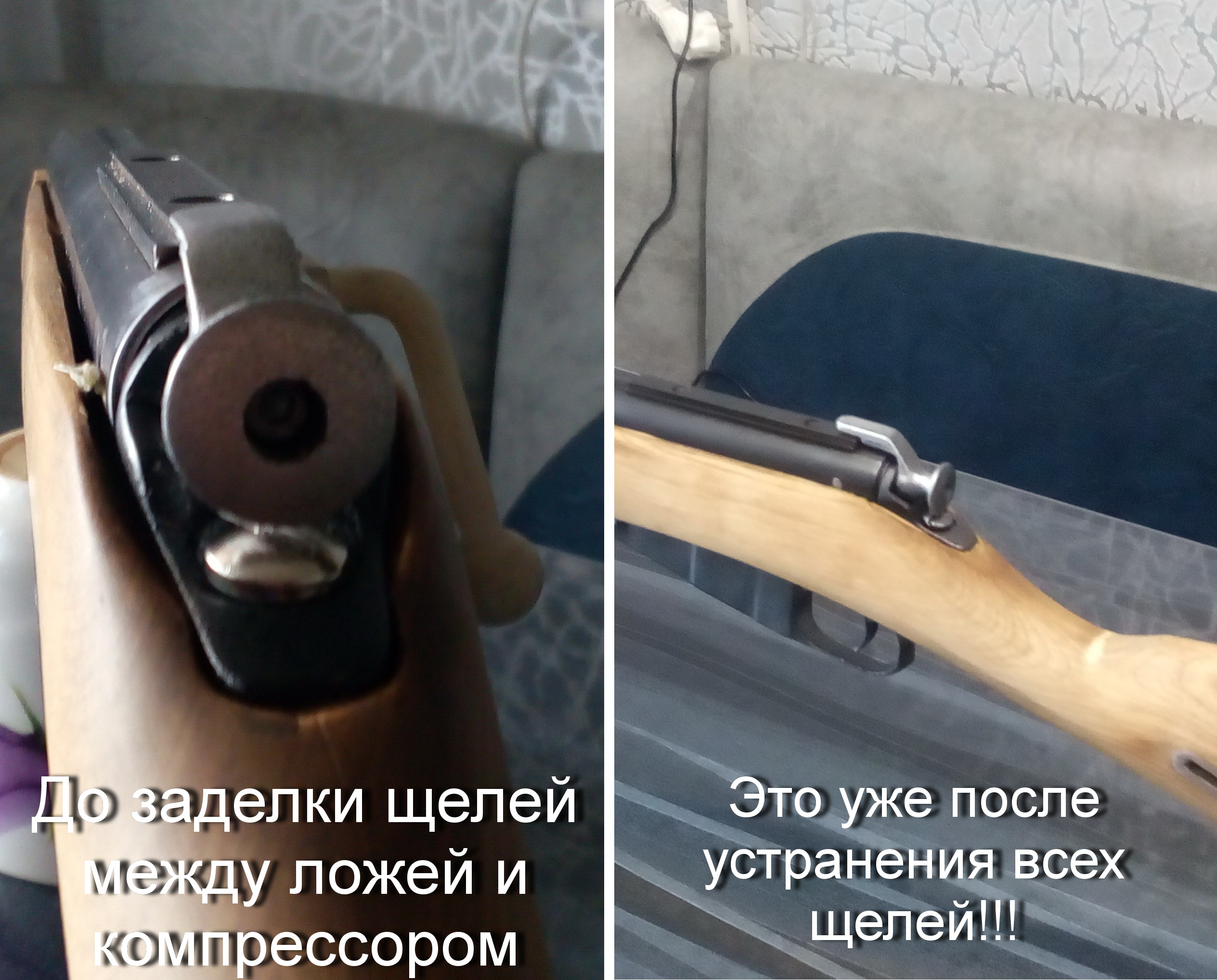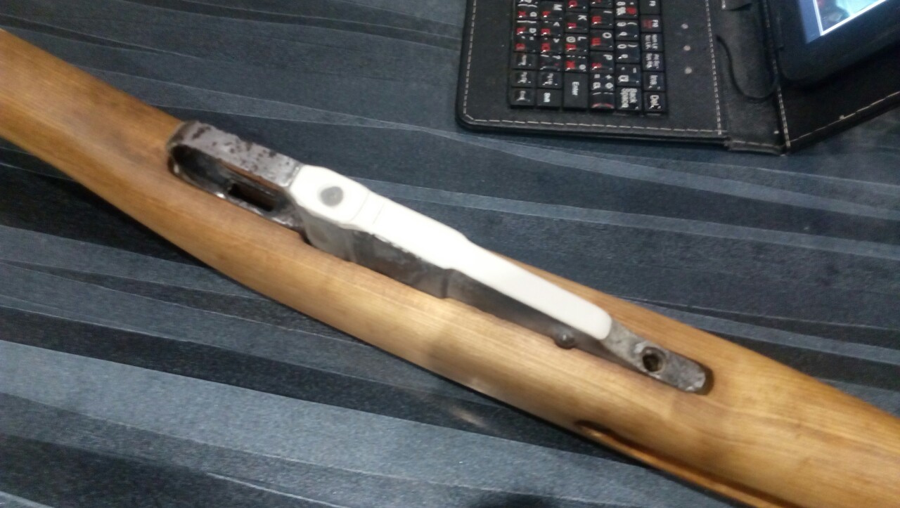 Ну доработать выборку в мосинской ложе для посадки компрессора сложностей не представляет. Нужно только чуток рассверлиться около врезанной в ложе втулке квадратной под фиксацию шомпола, подцепить её и извлечь из ложи. Затем уже доработать аккуратно(особенно впереди) выборку полукруглыми стамесками под компрессор. Требует передняя часть аккуратности т.к. там справа остаётся довольно тоненькая стенка-есть там справа впадина полукруглая для сложенного штыка. Ну а под тягу взвода сделать канавку можно всяким удобным инструментом-прямыми стамесками и косым ножом, тонкой полукруглой стамеской, тем же «Дремелем» с фрезой(бором) или шарошкой по дереву. В общем посадить компрессор особого труда не составило. Неприятность кроется в другом-выборка родная под железо мосинское особенно в задней части ложи шире необходимой выборки под «Мурку» или другую пневматическую винтовку. Потому при вставке компрессора между ним и стенками ложи в этих местах оставались немалые щели. Вот примерно что у меня выходило на тот момент: На имитацию затвора и «курок» пока не обращаем внимания! О них чуток позже. Чтобы ликвидировать эти щели,оклеил обычным скотчем бока компрессора. Вставил компрессор в ложу, зафиксировал его в требующемся положении. Замешал порцию ЭДП, приготовил кусок обычной медиц.ваты. И смачивая кусочки ваты обильно в клее, наталкивал в эти щели тонкой отвёрткой. Наталкивал плотно и не обращая внимания на выступающие кусочки над гранью ложи. Дал застыть этой массе основательно. Затем без труда достал из ложи компрессор-скотч не даёт пристать клею к стенкам компрессора. Получилась ровная полукруглая поверхность из этой застывшей массы. Ну а края неспешно слил с гранью ложи наждачками от Р80 до Р320. Таким образом щели были ликвидированы и компрессор плотно сидел в ложе. Стыдно за такие фото, но поверьте-хорошие утрачены, хоть этими позвольте пояснить: Таким образом с посадкой компрессора в ложе вопрос был решён. Позже эти заделанные ватой с клеем участки были аккуратно окрашены коричневой нитрокраской и слились они в итоге с окрашенной и пропитанной ложей просто здорово! Ну а коль на фотках неоднократно мелькнули целик на колодке и имитация затвора-расскажу про них теперь. Снова в решении данной задачи помог дружище Руслан. Прицельная планка с колодкой и ползунком были выполнены из чёрного качественного пластика со 100% заполнением на 3D принтере. Имитация затвора также выполнена на принтере со 100% заполнением из полиамида. Это ооооочень качественный и прочный материал! Он пластичен, но прочен. Печать выполнена так, что все слои повторяют геометрию детали. Т.е. отломаться или отколоться ничего не может даже при чрезмерном усилии или нагрузке. Да и шлифуется полиамид куда неохотнее какого пластика другого. Выполнено было по модели составленной Русланом-размеры все соблюдены подлинные, как и геометрия данной детали. И детали целика, и эта деталь были тщательно зачищены, слегка промазаны ЭДП, снова зачищены и окрашены позже. Целик с колодкой и ползуном (как и маг.коробка) под воронёный металл, а имитация затвора окрашена металликом и чуть подстарена. Потом колодка целика была закреплена на компрессоре винтами М3+клей с мет.пылью, имитация затвора на те же винтики М3 и тот же клей. Головки винтов были зашпаклёваны на «затворе» и зачищены.