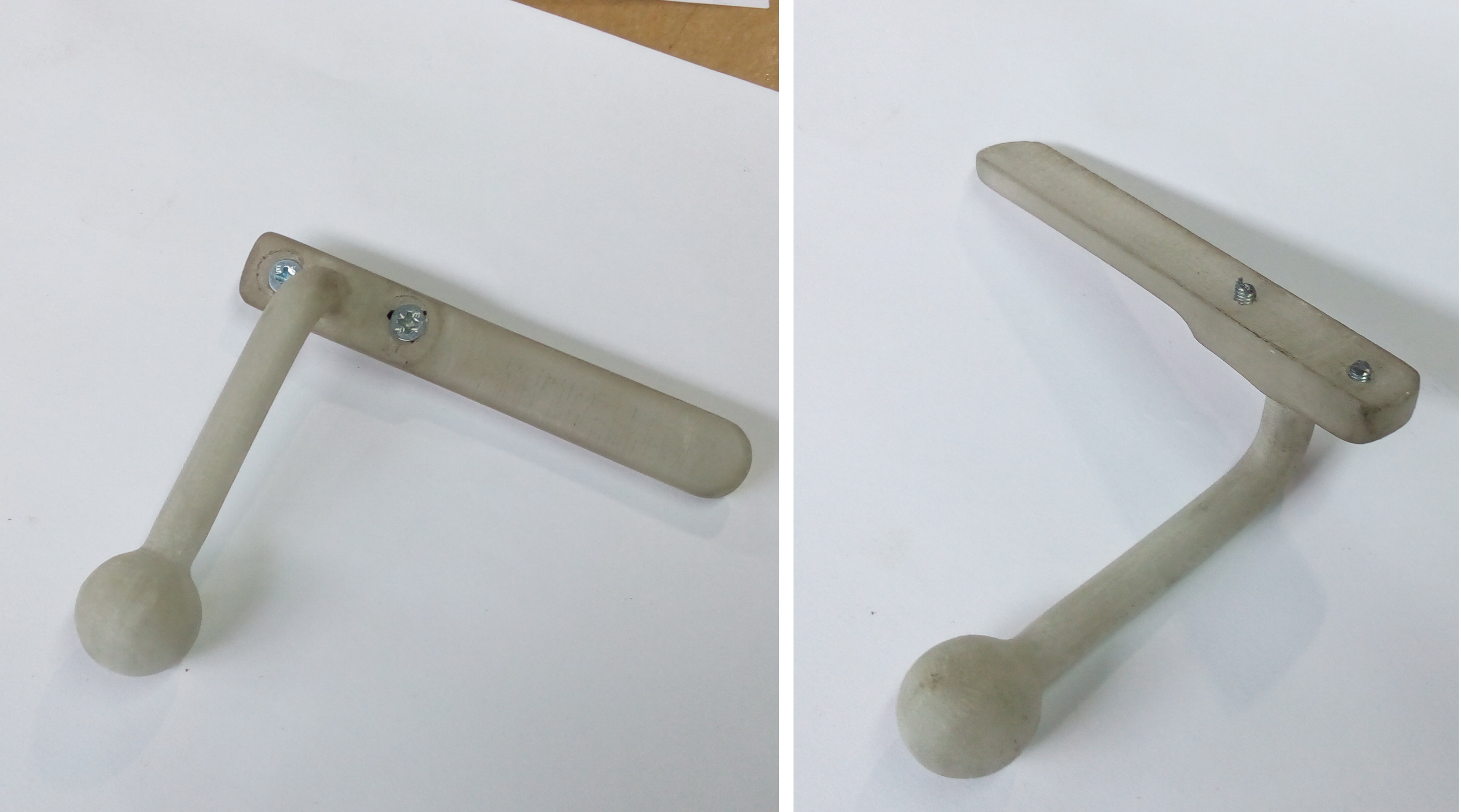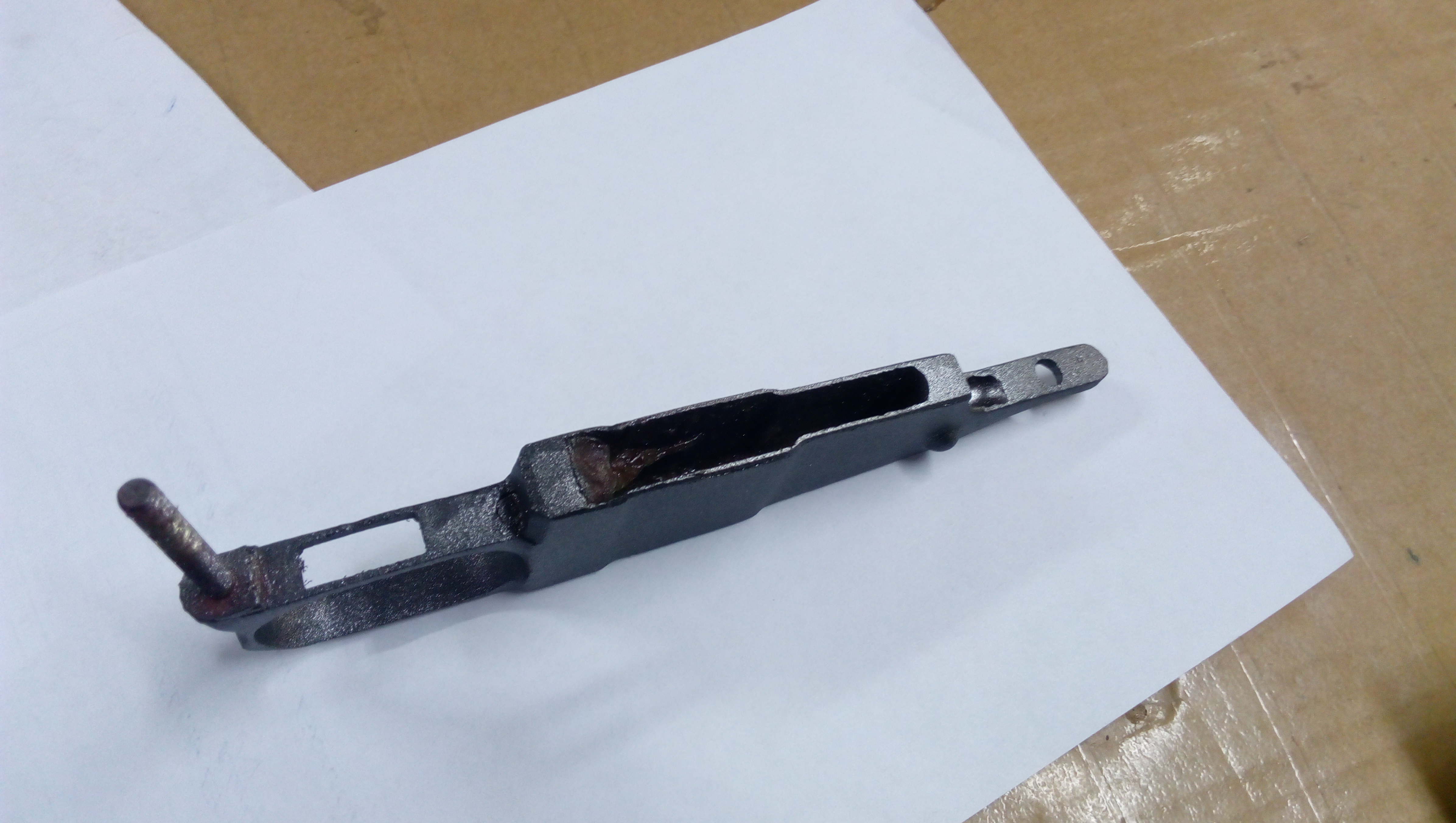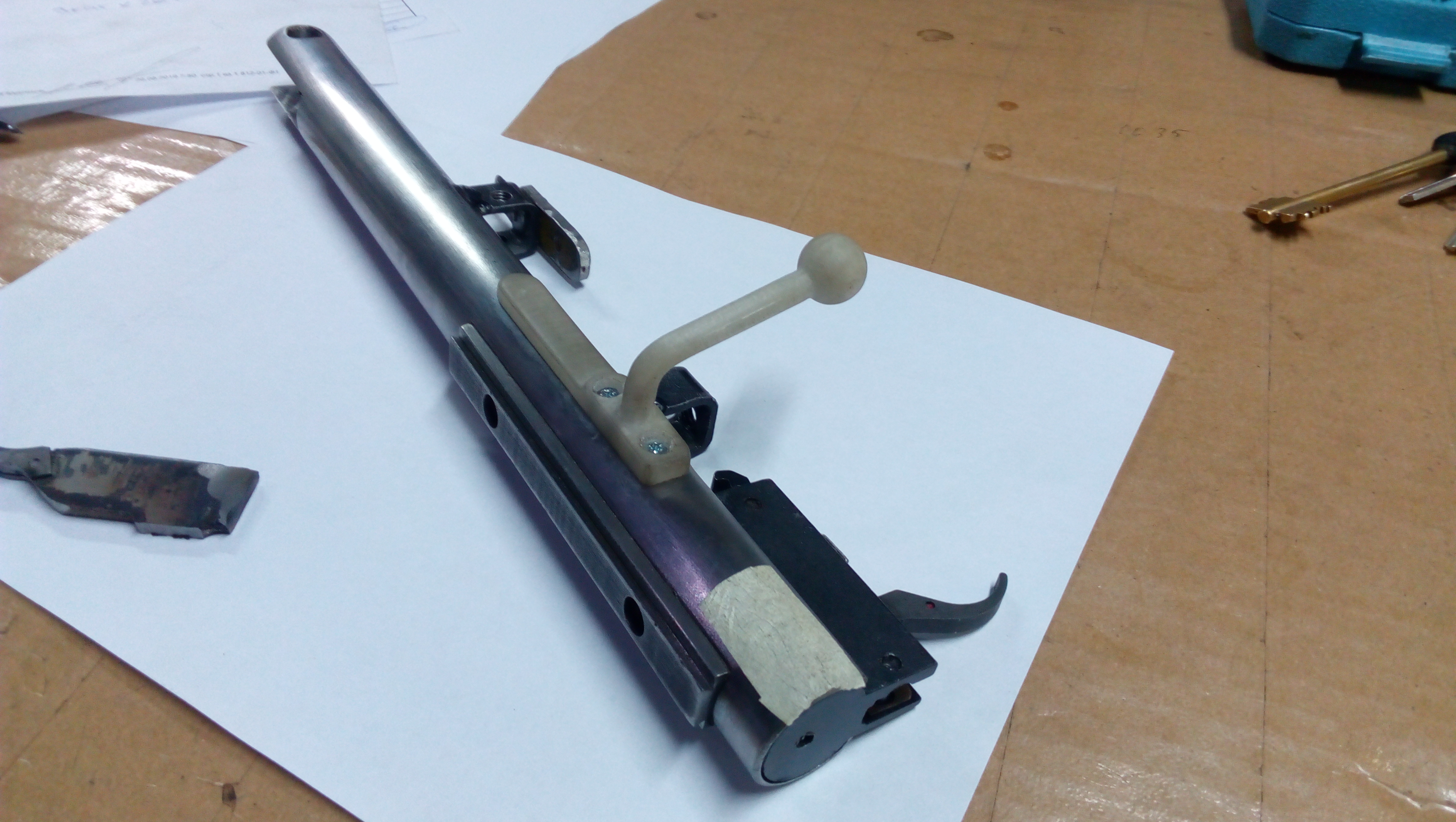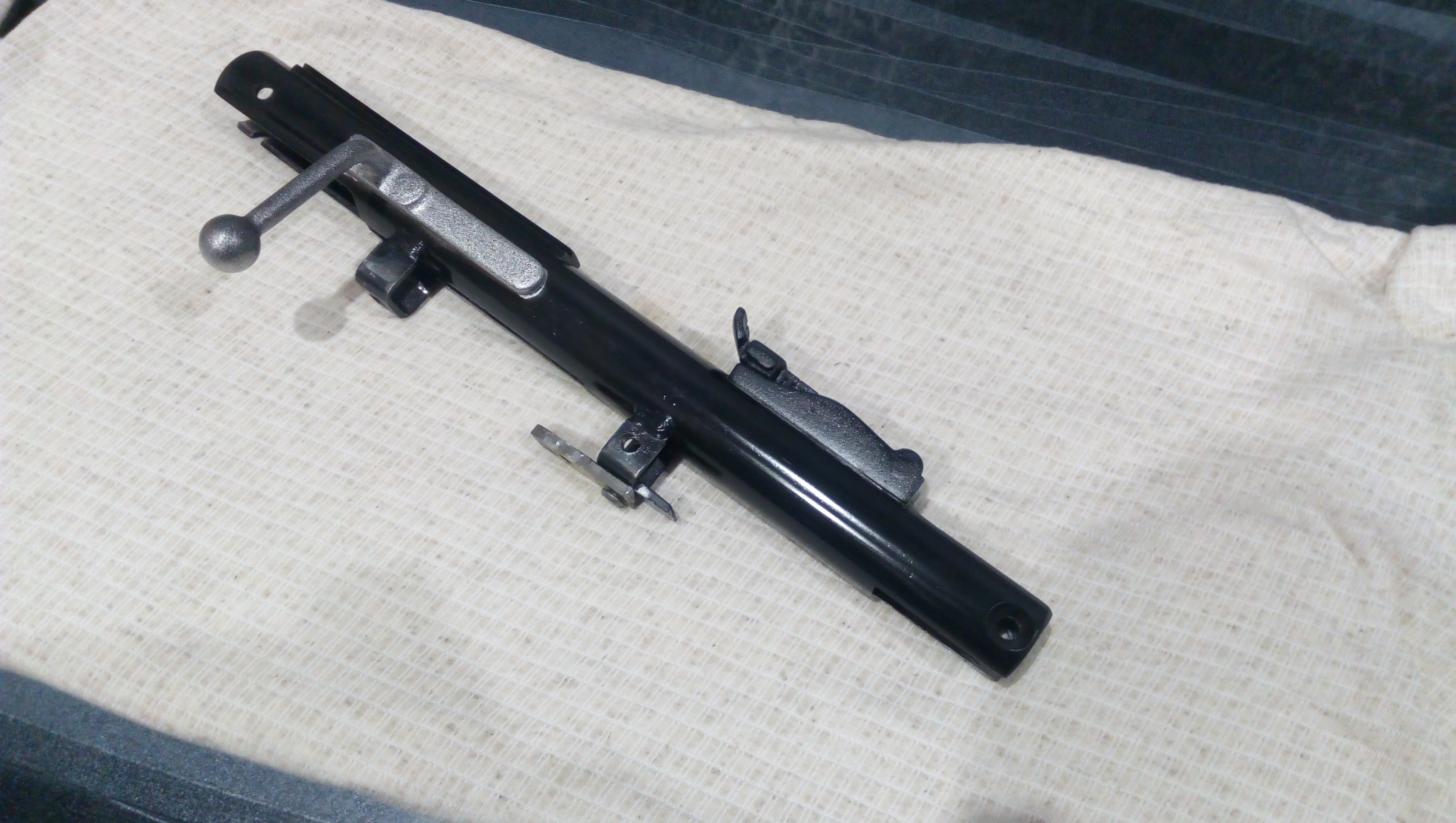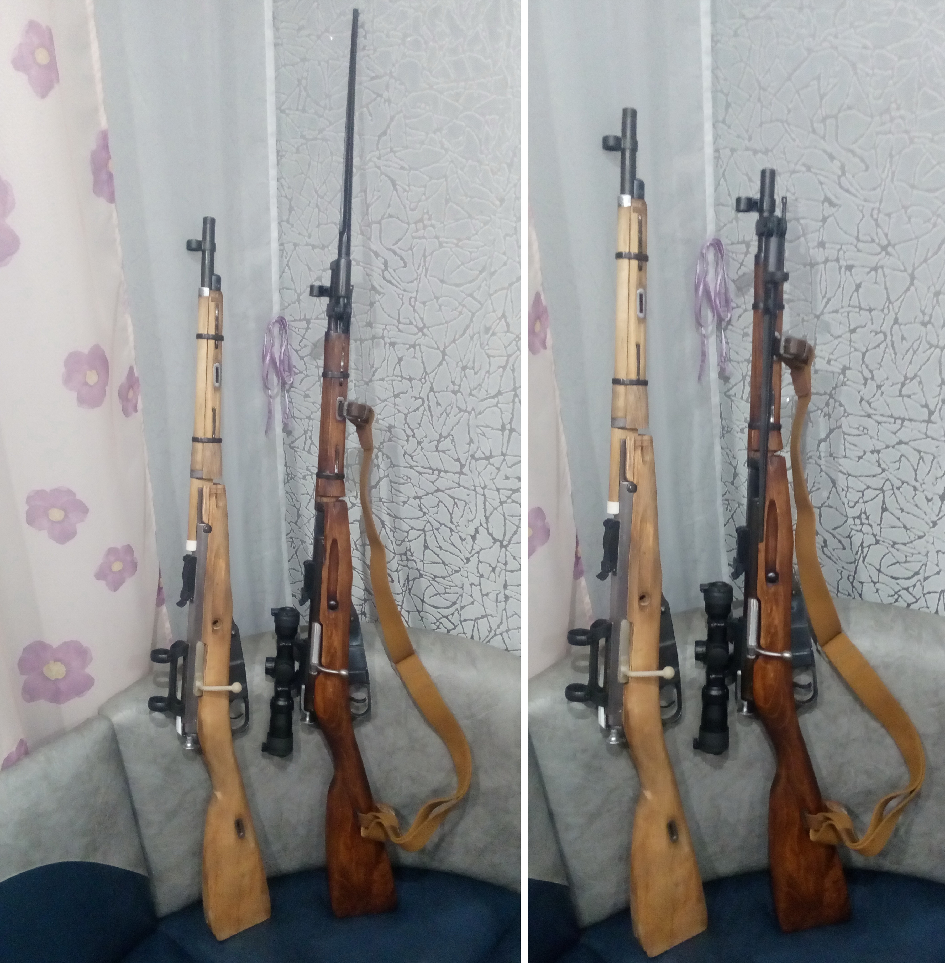 Ну доработать выборку в мосинской ложе для посадки компрессора сложностей не представляет. Нужно только чуток рассверлиться около врезанной в ложе втулке квадратной под фиксацию шомпола, подцепить её и извлечь из ложи. Затем уже доработать аккуратно(особенно впереди) выборку полукруглыми стамесками под компрессор. Требует передняя часть аккуратности т.к. там справа остаётся довольно тоненькая стенка-есть там справа впадина полукруглая для сложенного штыка. Ну а под тягу взвода сделать канавку можно всяким удобным инструментом-прямыми стамесками и косым ножом, тонкой полукруглой стамеской, тем же «Дремелем» с фрезой(бором) или шарошкой по дереву. В общем посадить компрессор особого труда не составило. Неприятность кроется в другом-выборка родная под железо мосинское особенно в задней части ложи шире необходимой выборки под «Мурку» или другую пневматическую винтовку. Потому при вставке компрессора между ним и стенками ложи в этих местах оставались немалые щели. Вот примерно что у меня выходило на тот момент: На имитацию затвора и «курок» пока не обращаем внимания! О них чуток позже. Чтобы ликвидировать эти щели,оклеил обычным скотчем бока компрессора. Вставил компрессор в ложу, зафиксировал его в требующемся положении. Замешал порцию ЭДП, приготовил кусок обычной медиц.ваты. И смачивая кусочки ваты обильно в клее, наталкивал в эти щели тонкой отвёрткой. Наталкивал плотно и не обращая внимания на выступающие кусочки над гранью ложи. Дал застыть этой массе основательно. Затем без труда достал из ложи компрессор-скотч не даёт пристать клею к стенкам компрессора. Получилась ровная полукруглая поверхность из этой застывшей массы. Ну а края неспешно слил с гранью ложи наждачками от Р80 до Р320. Таким образом щели были ликвидированы и компрессор плотно сидел в ложе. Стыдно за такие фото, но поверьте-хорошие утрачены, хоть этими позвольте пояснить: Таким образом с посадкой компрессора в ложе вопрос был решён. Позже эти заделанные ватой с клеем участки были аккуратно окрашены коричневой нитрокраской и слились они в итоге с окрашенной и пропитанной ложей просто здорово! Ну а коль на фотках неоднократно мелькнули целик на колодке и имитация затвора-расскажу про них теперь. Снова в решении данной задачи помог дружище Руслан. Прицельная планка с колодкой и ползунком были выполнены из чёрного качественного пластика со 100% заполнением на 3D принтере. Имитация затвора также выполнена на принтере со 100% заполнением из полиамида. Это ооооочень качественный и прочный материал! Он пластичен, но прочен. Печать выполнена так, что все слои повторяют геометрию детали. Т.е. отломаться или отколоться ничего не может даже при чрезмерном усилии или нагрузке. Да и шлифуется полиамид куда неохотнее какого пластика другого. Выполнено было по модели составленной Русланом-размеры все соблюдены подлинные, как и геометрия данной детали. И детали целика, и эта деталь были тщательно зачищены, слегка промазаны ЭДП, снова зачищены и окрашены позже. Целик с колодкой и ползуном (как и маг.коробка) под воронёный металл, а имитация затвора окрашена металликом и чуть подстарена. Потом колодка целика была закреплена на компрессоре винтами М3+клей с мет.пылью, имитация затвора на те же винтики М3 и тот же клей. Головки винтов были зашпаклёваны на «затворе» и зачищены.