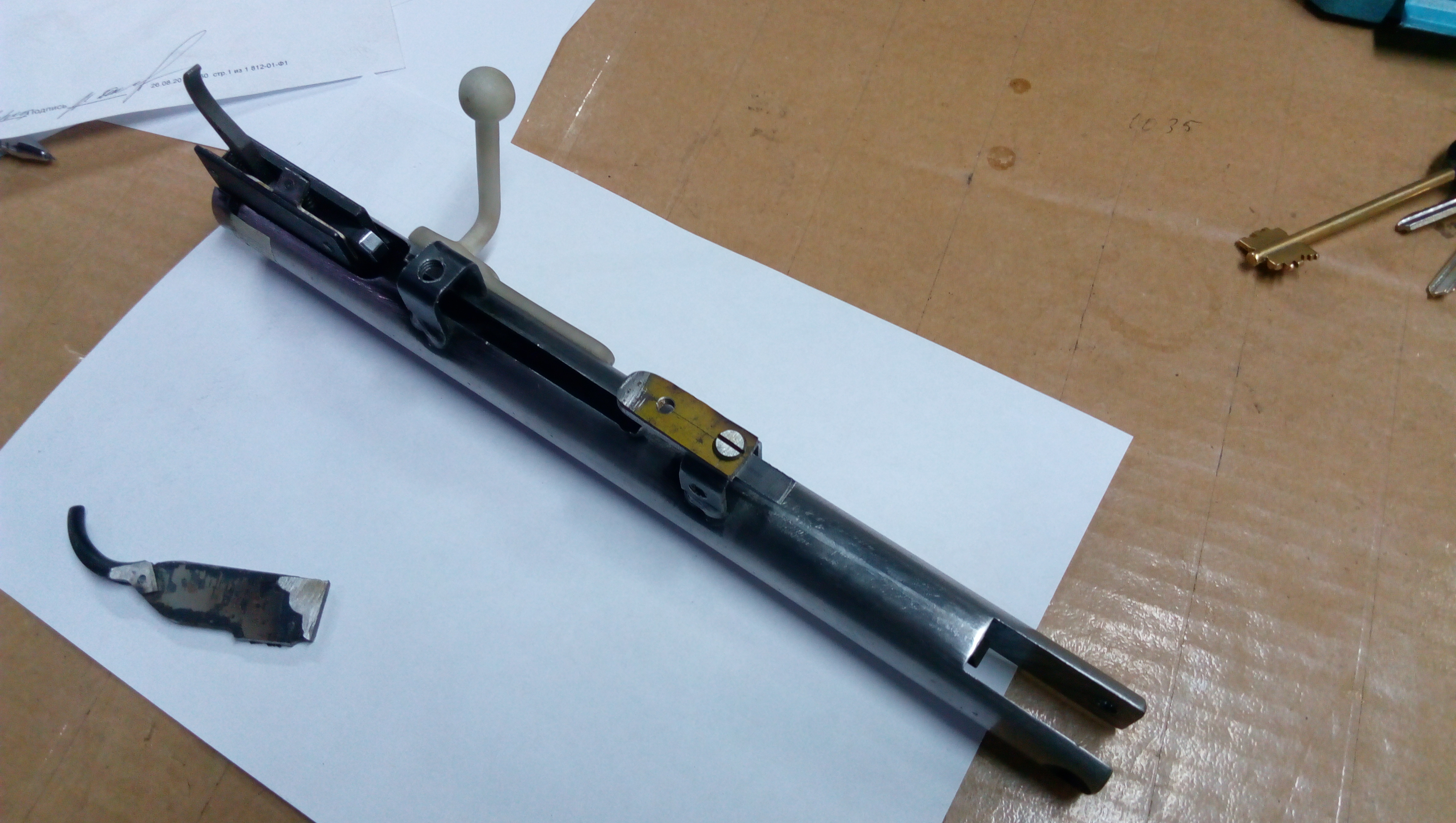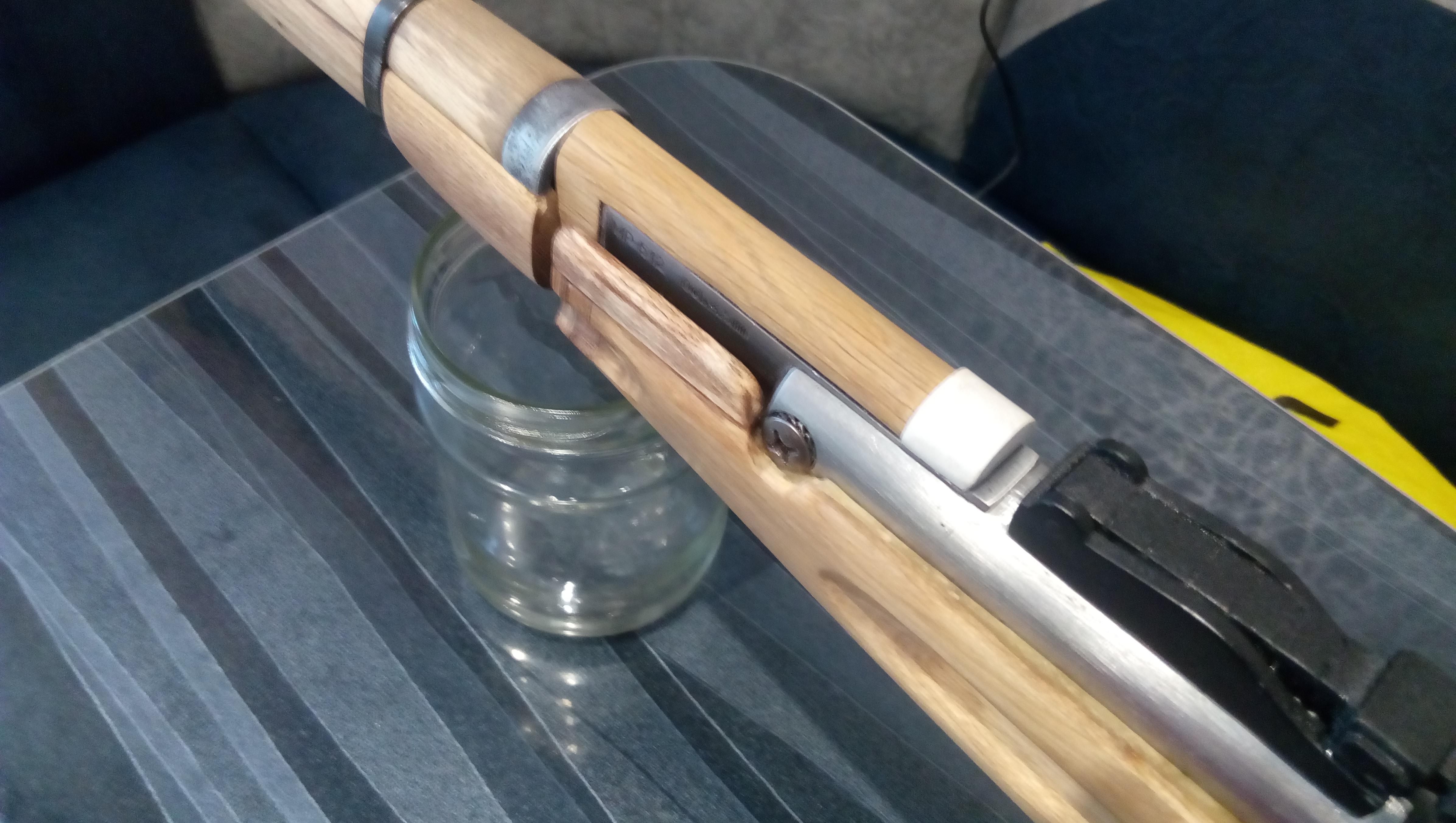 Теперь поговорим о крепеже железа «Мурки» в ложе. Тут решил пойти тем же путём что и со своим карабином. Решил для крепежа впереди использовать переднее отверстие крепежа магазинной коробки. Для этого в передней опоре компрессора просверлил отверстие, нарезал резьбу М5. Выпилил пластину из 6мм стали для переноса крепежа, просверлил и в ней отверстие, нарезал ту же резьбу М5. Закрепил эту пластину на передней опоре винтом накрепко. Вставил компрессор в ложу, через отверстие крепежа коробки наметил отверстие на пластине переноса крепежа. Просверлив отверстие, нарезал и тут резьбу М5. Вот что рассказал: Таким образом при креплении магаз.коробки впереди винтом М5-притягивается и компрессор «Мурки». И жёстко крепится и коробка, и компрессор впереди. А для крепежа компрессора сзади также сделал идентичный своему крепёж. Русланом была напечатана на принтере из качественного пластика со 100% заполнением лапка как и для моего карабина. Чуть больше в размере для точной подгонки. Эта лапка крепится за компрессором на шпильку врезанную в магаз.коробку сзади мебельной стяжкой. Также жёстко и надёжно как и передний крепёж. Также была изготовлена имитация мосинского курка. В нём сквозное отверстие под винт М4. Креплю лапку стяжкой, вставляю компрессор в ложу, креплю передним винтом М5 через ушко в коробке. Прикладываю к передней стенке лапки этот «курок», отмечаю отверстие на лапке, сверлю его сверлом Ф4,2мм-одновременно на заднике «Мурки» намечаю такое же отверстие. Использую керн, точно сверлю отверстие в заднике сверлом Ф3,2мм,нарезаю резьбу М4. Подобрал винт нужной длины под шестигранник. Отверстие в «курке» чуть растачиваю сверлом для шляпки-чтобы она пряталась в «курке». Вставляю в «курок» винт, прикладываю его к лапке и закручиваю шестигранником до упора. Всё-компрессор очень надёжно закреплён в ложе!!! И вид весьма достойный. Похожая лапка есть и в винтовках/карабинах Мосина. Лапка была окрашена после обработки под воронёный металл, «курок» требовалось чуть доработать в геометрии из-за упора в планку «ластохвост» на компрессоре. Он в последствии был окрашен в серебристый металлик и подстарен. Шляпку мебельной стяжки заворонил «Клевером». Кое-что могу показать: Далее был изготовлен фальшствол почти в размеры мосинского. Он стальной, также был Русланом напечатан отличный кольцевой намушник. После обработки мушка была вклеена по месту. Сделана была из обычного гвоздика подходящего. Окрашено после грунтовки под воронёный металл. Фальшствол одевался на ствол «Мурки» и фиксировался впереди на резьбовую втулку на конце фальшствола. После всех подгонок и т.д. эта втулка была кроме резьбы посажена на ЭДП с мет.пылью. Намертво!!! Теперь даже при желании снять фальшствол невозможно!!! Напоследок после крепления на нём намушника он был заворонён «Клевером». Отверстие на дульном срезе (на втулке) рассверлено до 7,62мм. Ну так захотелось)))) Втулку рассмотрите чуть позже. Пока так: Теперь нужно было заняться спусковым крючком. Родной крючок «Мурки» был конечно коротким-еле торчал из ложи он. Решено было нарастить крючок спусковым крючком карабина Симонова. Чуть доработал его-вварил в краешек стальную пластину для подгонки к крючку «Мурки».Обрезал болгаркой лишнее от «муркиного», приложил заготовку с крючком СКС, очертил, обработал на наждаке необход