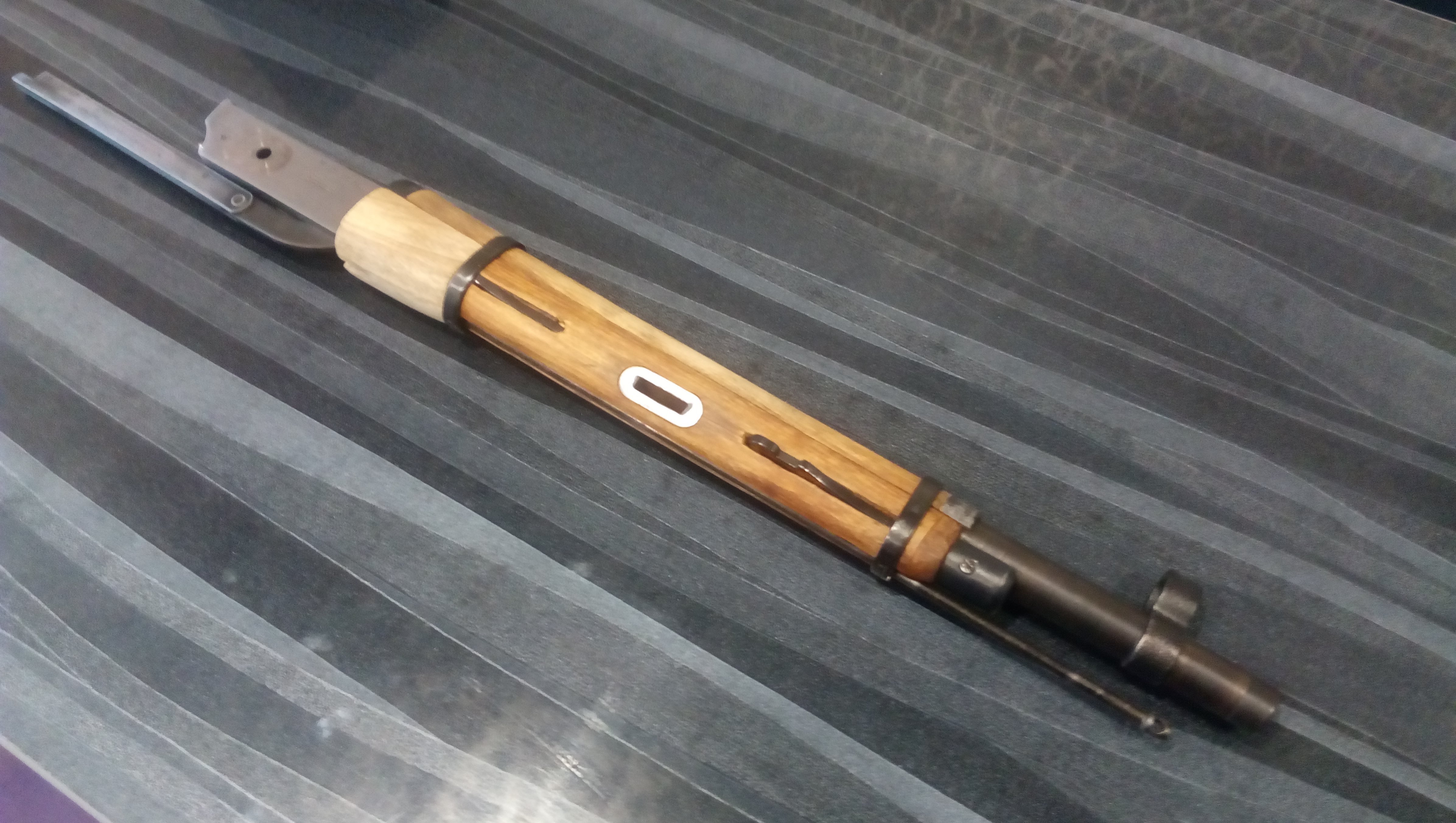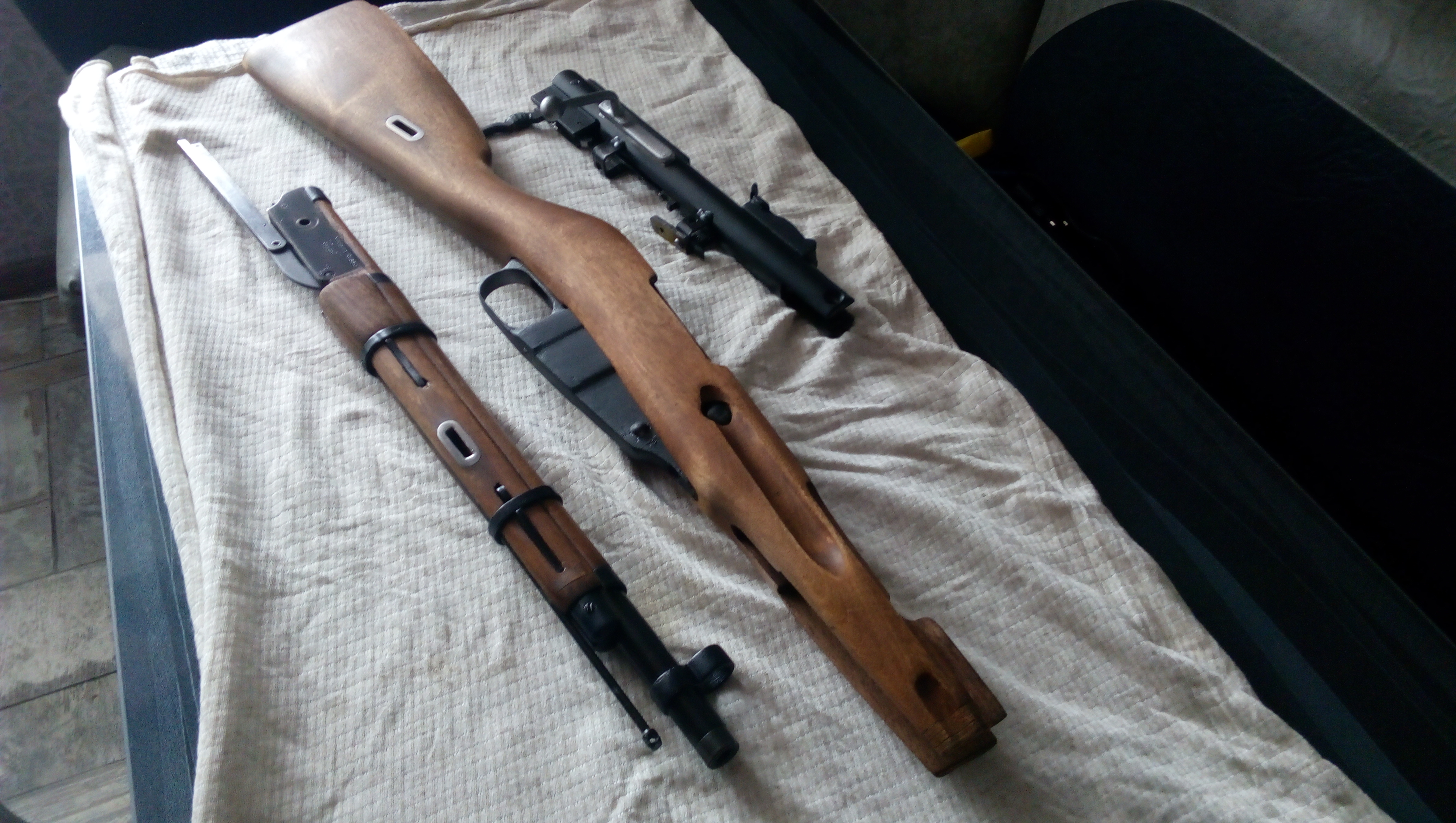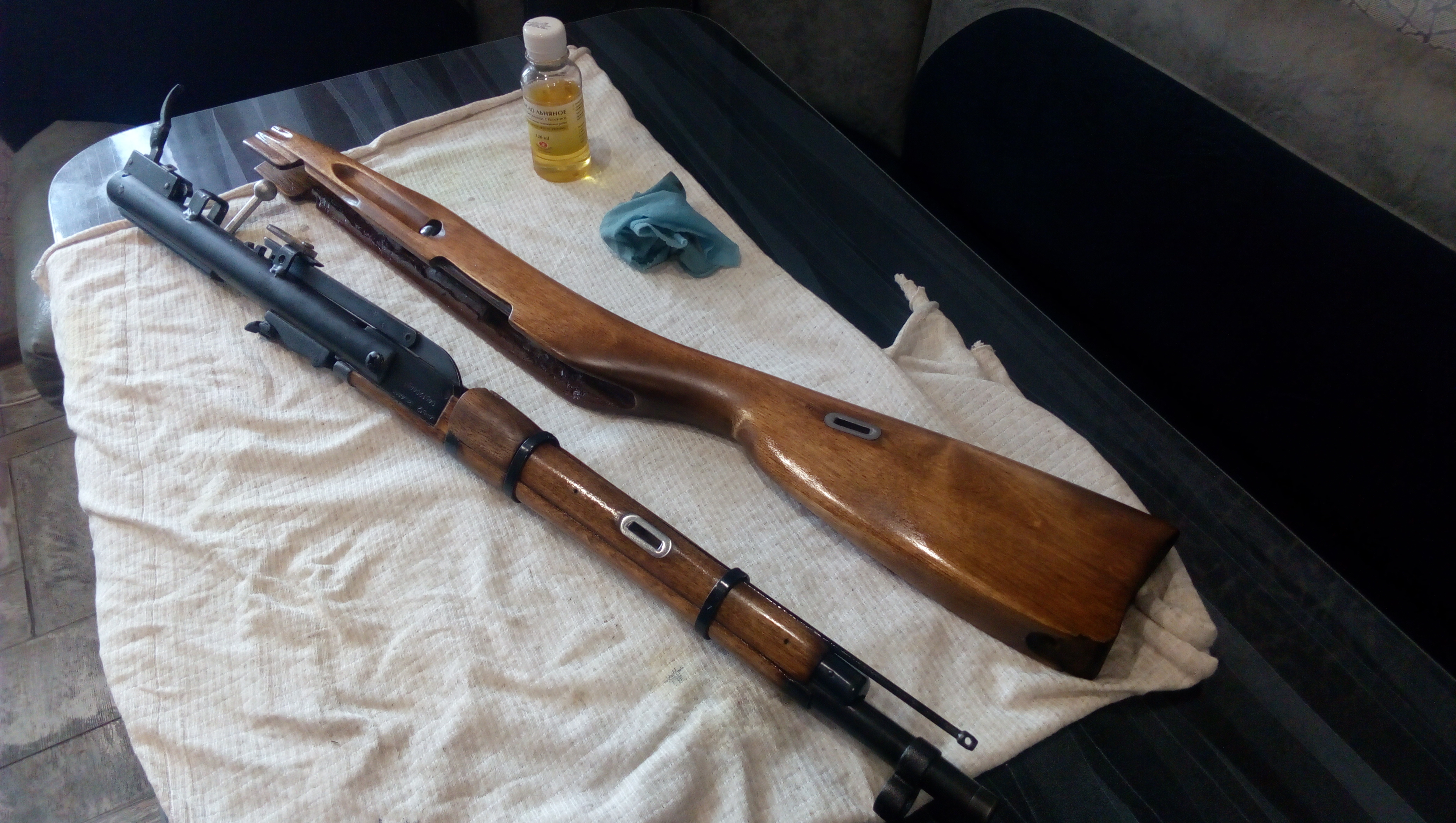 Мой карабин как помните (кто не видел-ссылка: Cсылка скрыта. Для просмотра необходима регистрация на форуме или войдите на форум. ) выполнен на базе «ИЖ-38С»,ну а этот предстояло смастерить на базе «Мурки». Разумеется был готов что карабин выйдет несколько большей длины. Компрессор 512-ой винтовки как и ствол конечно длиннее 38-го ИЖа. Как и для моего был куплен комплект от карабина Мосина обр.1944 года-он с характерной впадиной справа на ложе под складной штык. В комплекте была ложа,ствольная накладка, ложевые кольца, пружины под них, шомпол, ремень с подремешками, нагель в ложу был вкручен также, антабки врезаны. Комплект этот также был со складского хранения,от души дерево было намазано какой-то непонятной субстанцией схожей с солидолом или основательно припылившимся машинным маслом. В общем конечно предстояло в первую очередь привести дерево к нормальному состоянию-очистить комплект от этой грязи и отшлифовать.