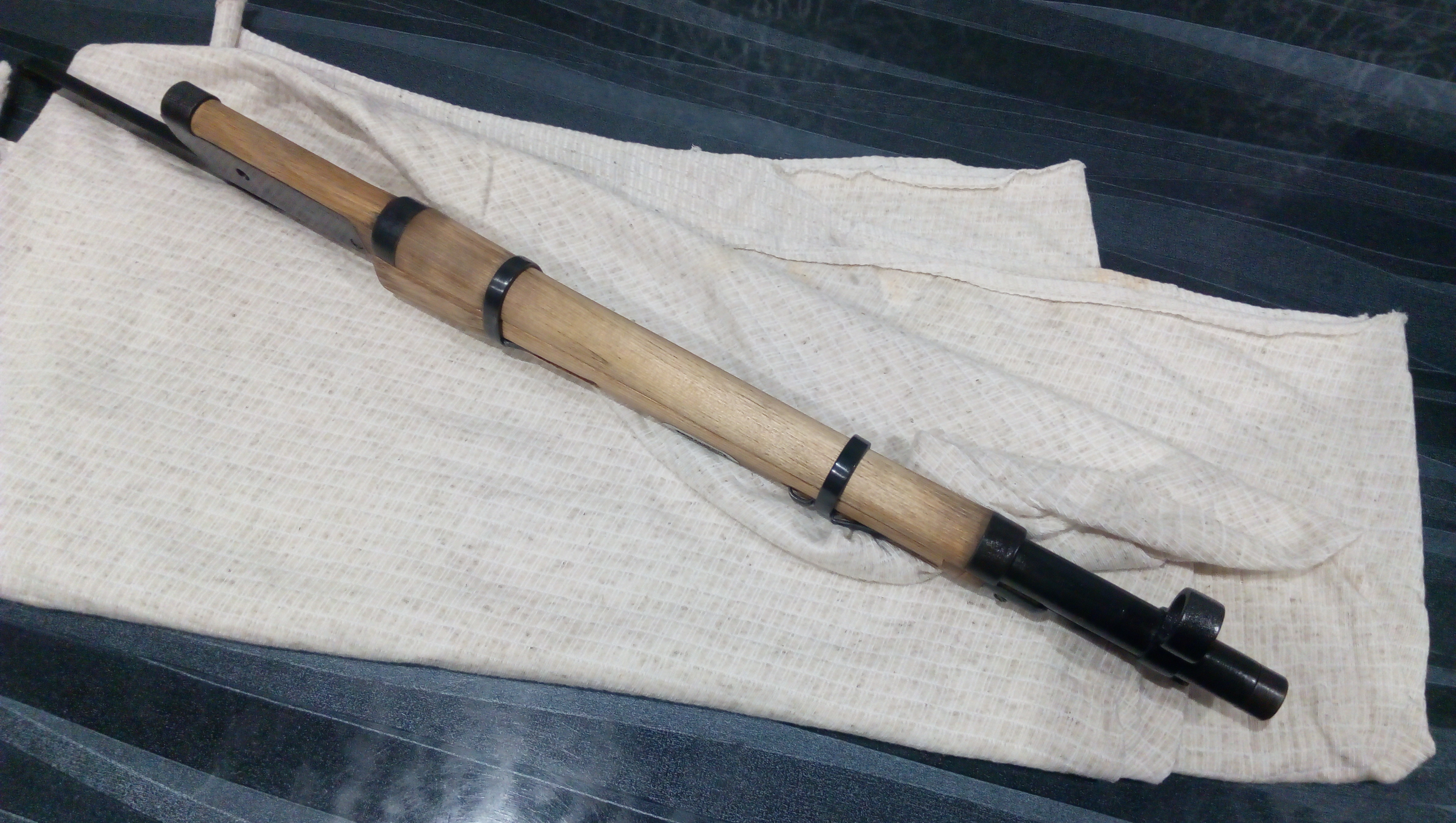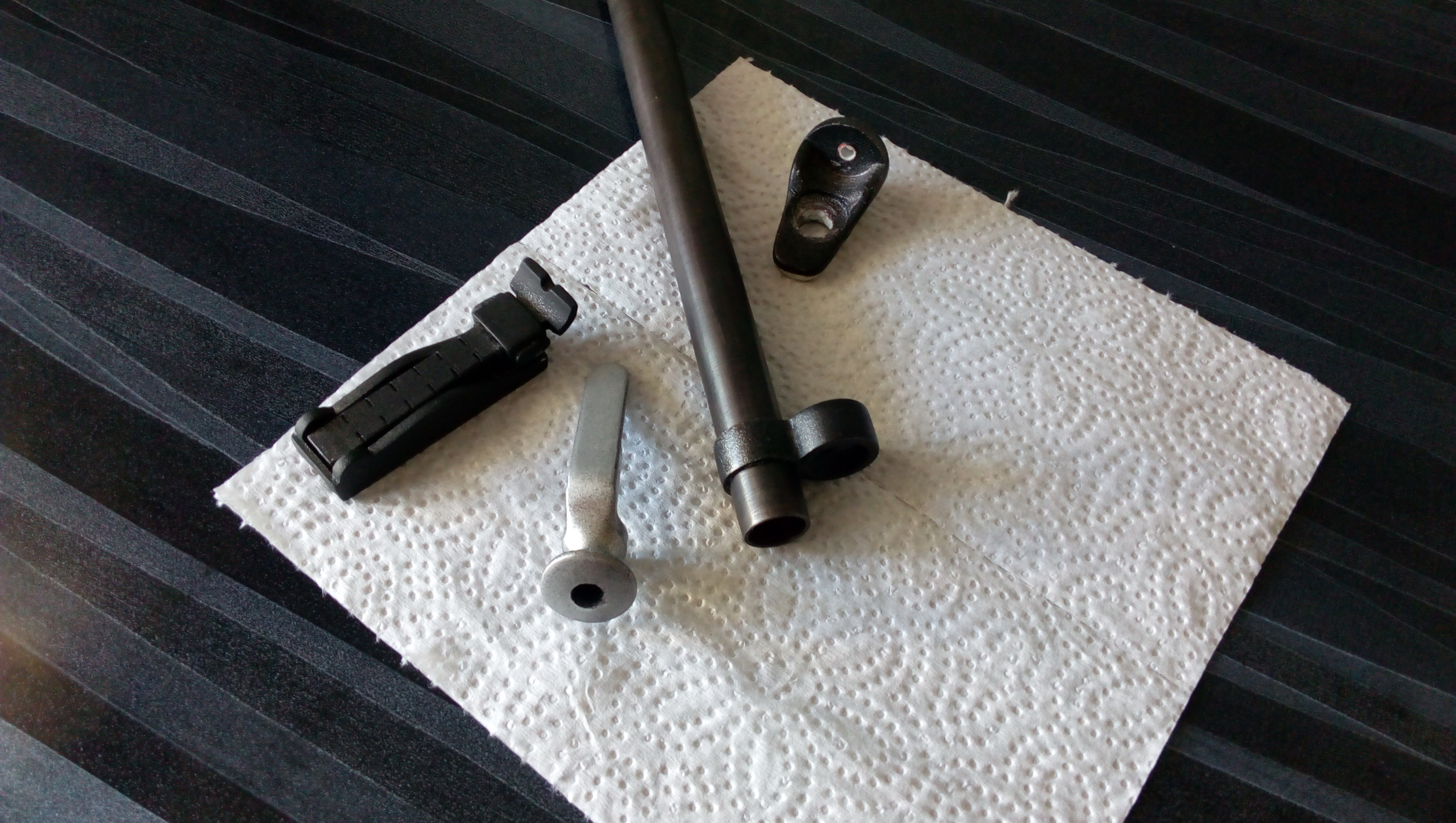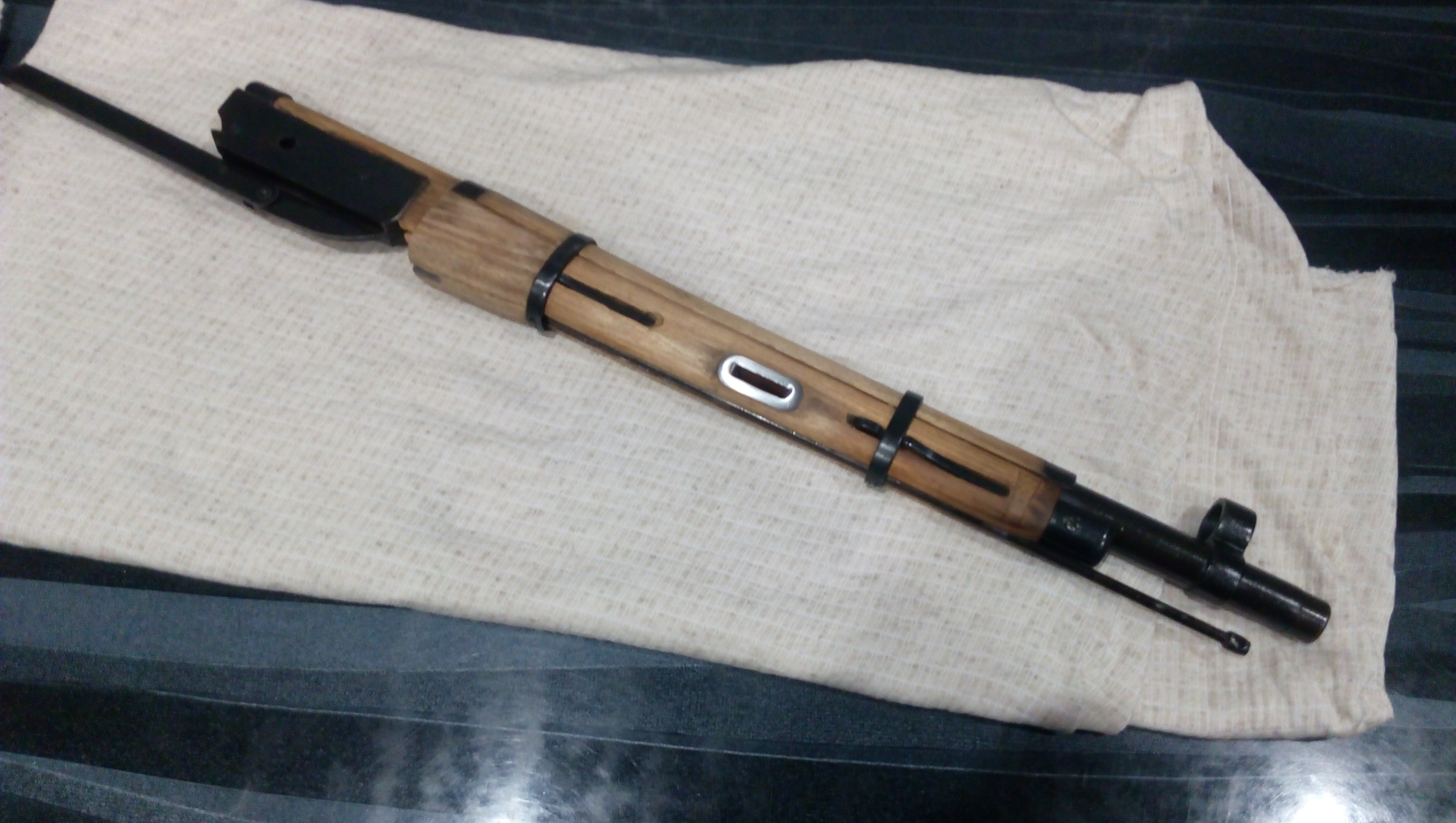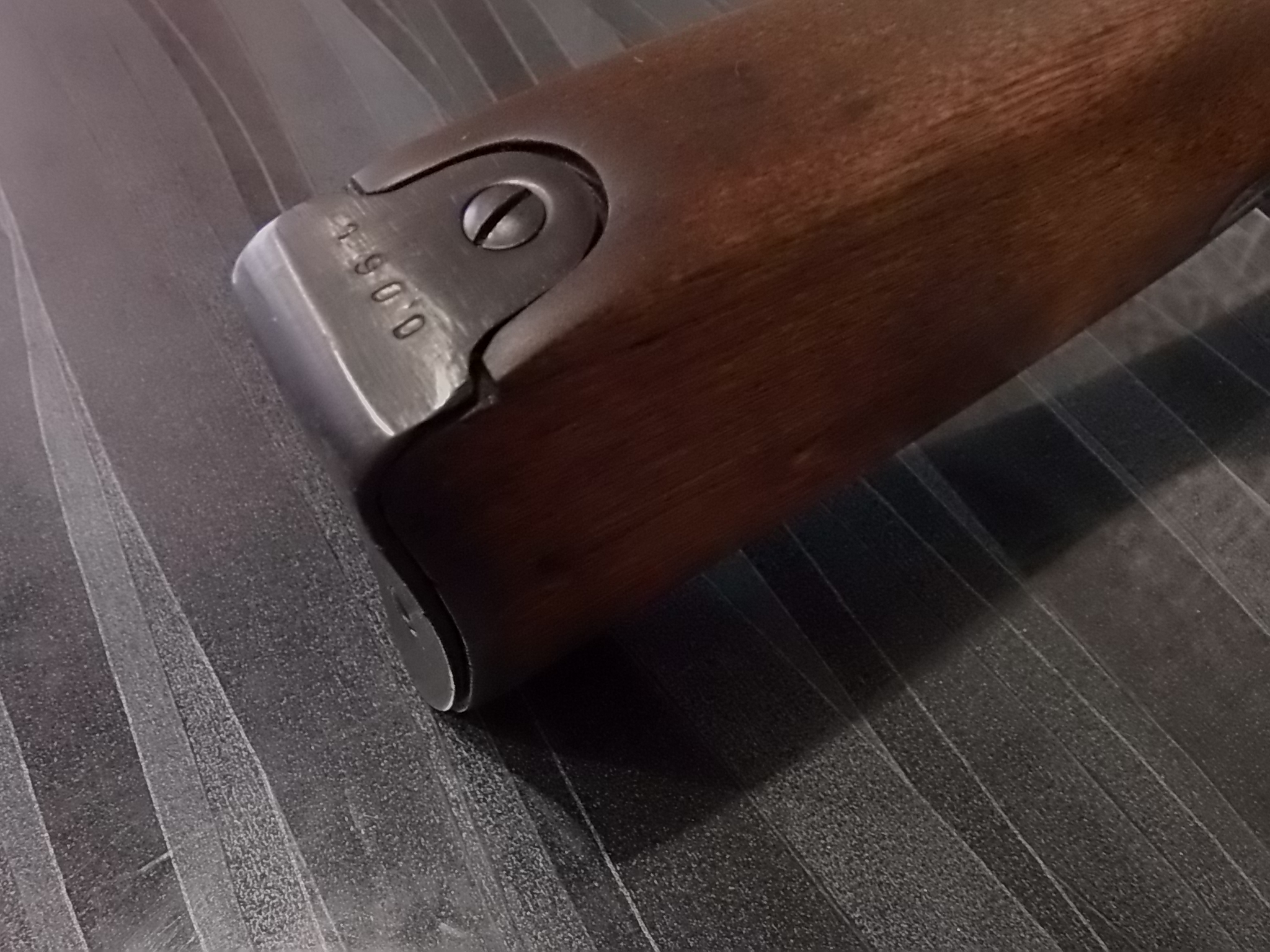 Мой карабин как помните (кто не видел-ссылка: Cсылка скрыта. Для просмотра необходима регистрация на форуме или войдите на форум. ) выполнен на базе «ИЖ-38С»,ну а этот предстояло смастерить на базе «Мурки». Разумеется был готов что карабин выйдет несколько большей длины. Компрессор 512-ой винтовки как и ствол конечно длиннее 38-го ИЖа. Как и для моего был куплен комплект от карабина Мосина обр.1944 года-он с характерной впадиной справа на ложе под складной штык. В комплекте была ложа,ствольная накладка, ложевые кольца, пружины под них, шомпол, ремень с подремешками, нагель в ложу был вкручен также, антабки врезаны. Комплект этот также был со складского хранения,от души дерево было намазано какой-то непонятной субстанцией схожей с солидолом или основательно припылившимся машинным маслом. В общем конечно предстояло в первую очередь привести дерево к нормальному состоянию-очистить комплект от этой грязи и отшлифовать.