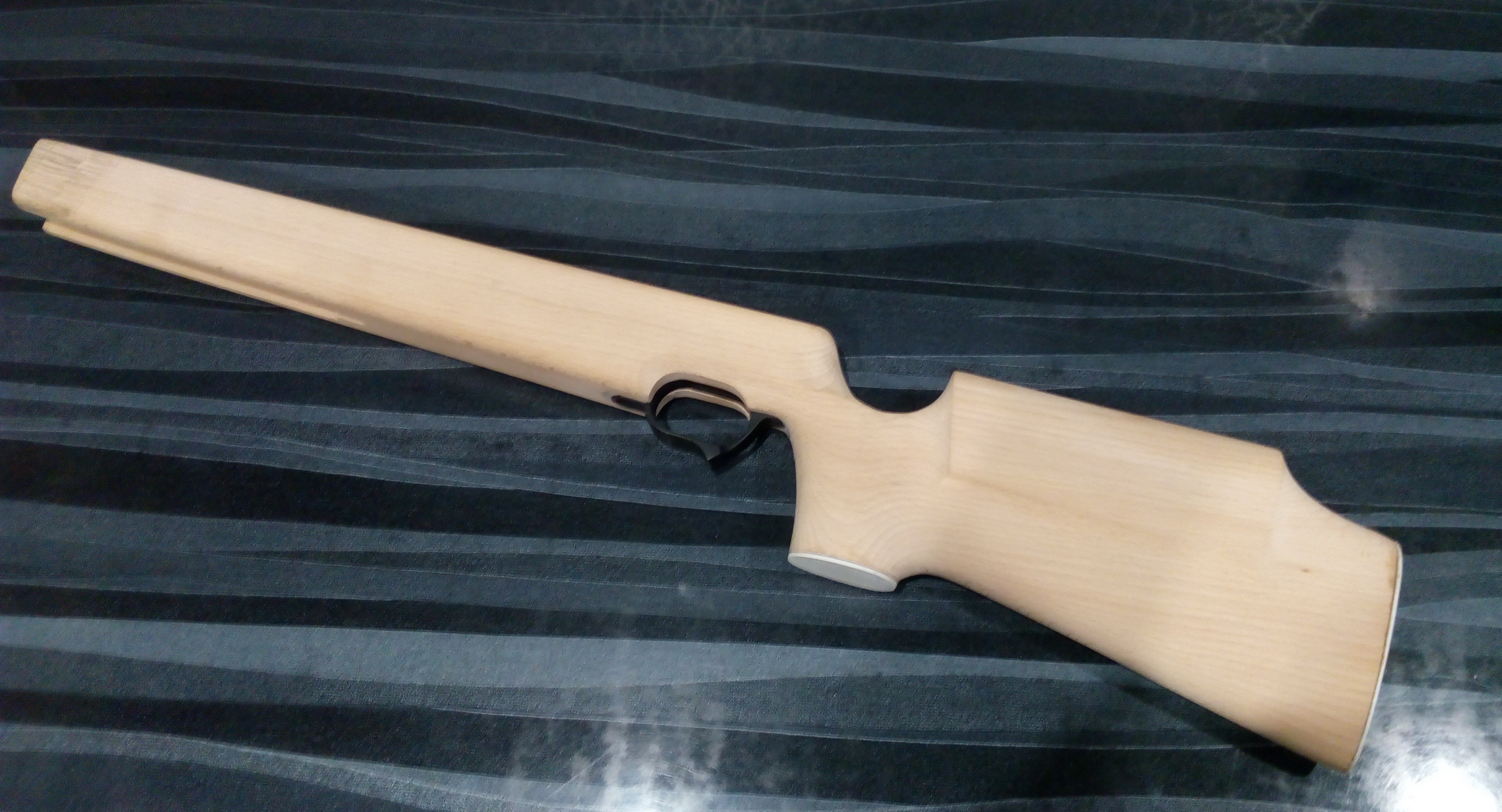 Далее была изготовлена ложа. Хотелось придержаться форм именно Дианы. Исключение составила высота цевья-сделано было чуть меньшей высоты. Это было предусмотрено формой спусковой скобы которую хотел применить. А именно скобы «Зуль-312». Повторю-мне очень нравятся эти скобы и я уже неоднократно применял их на своих работах. Благо дружище Руслан на принтере напечатал мне их в достаточном количестве. После на затыльник была изготовлена белая прокладка из ПВХ пластика, также и на рукоять. Сразу была задумка сделать затыльник винтовки, пятку на рукоять и нос цевья из красивой породы дерева. Вот такая получилась буковая ложа с пластиковыми прокладками и скобой: