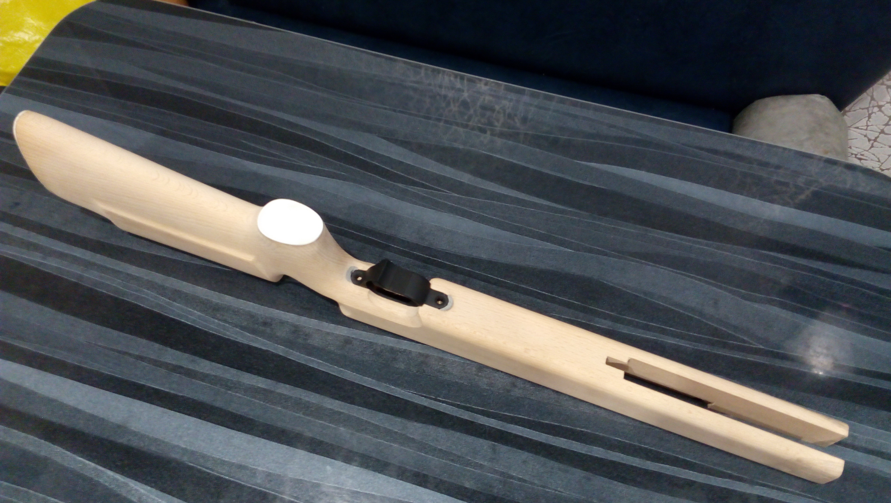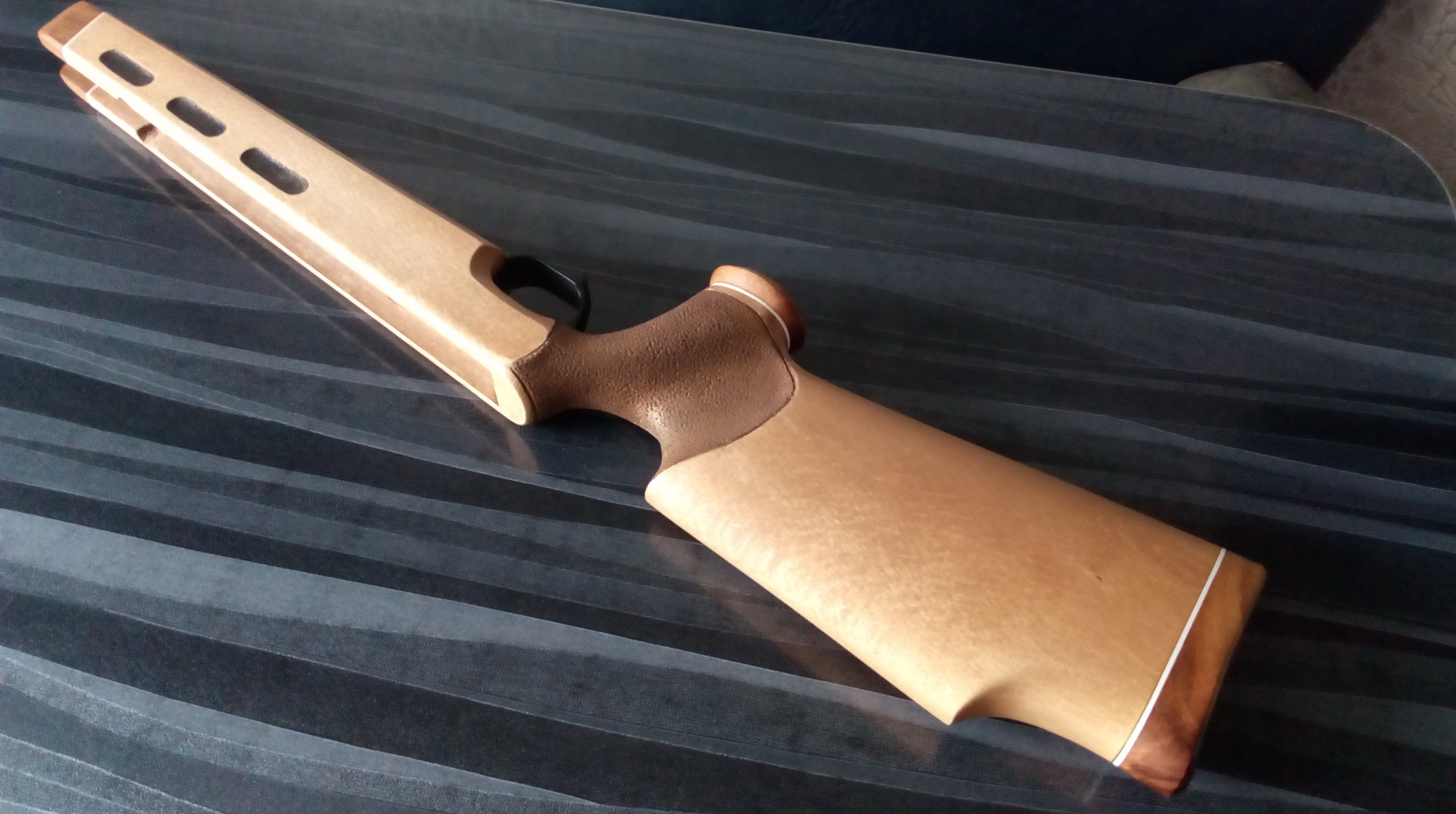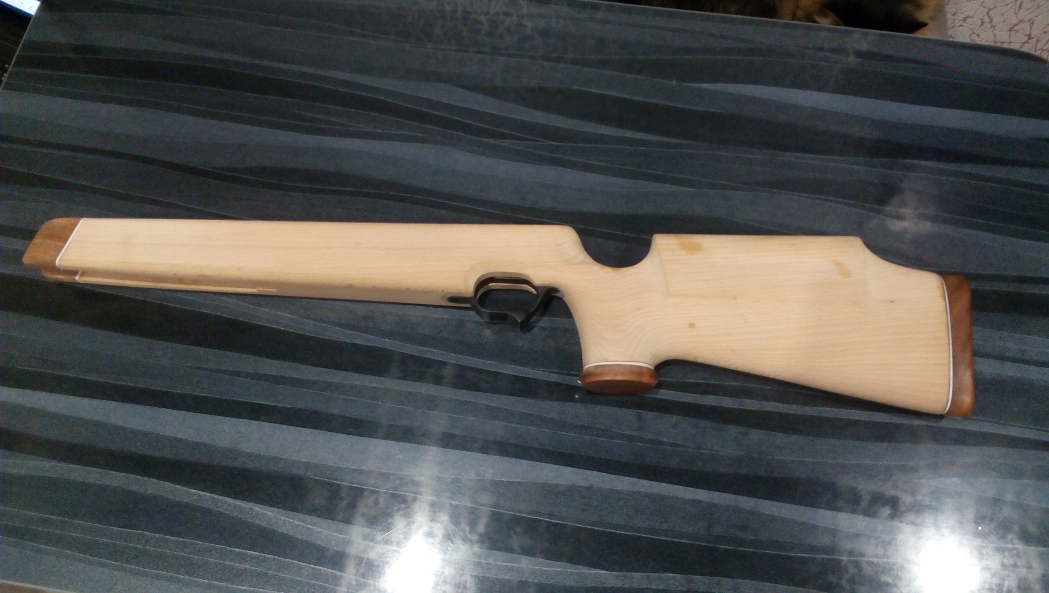 На фото носиков цевья видно как отлично сливается этот декор после зачистки с основной ложей. Позже так были подогнаны остальные элементы. Ну а на тот момент уже вот такой облик приняла буковая ложа с декоративными элементами из экзотической породы. Скоба пока не закреплена: