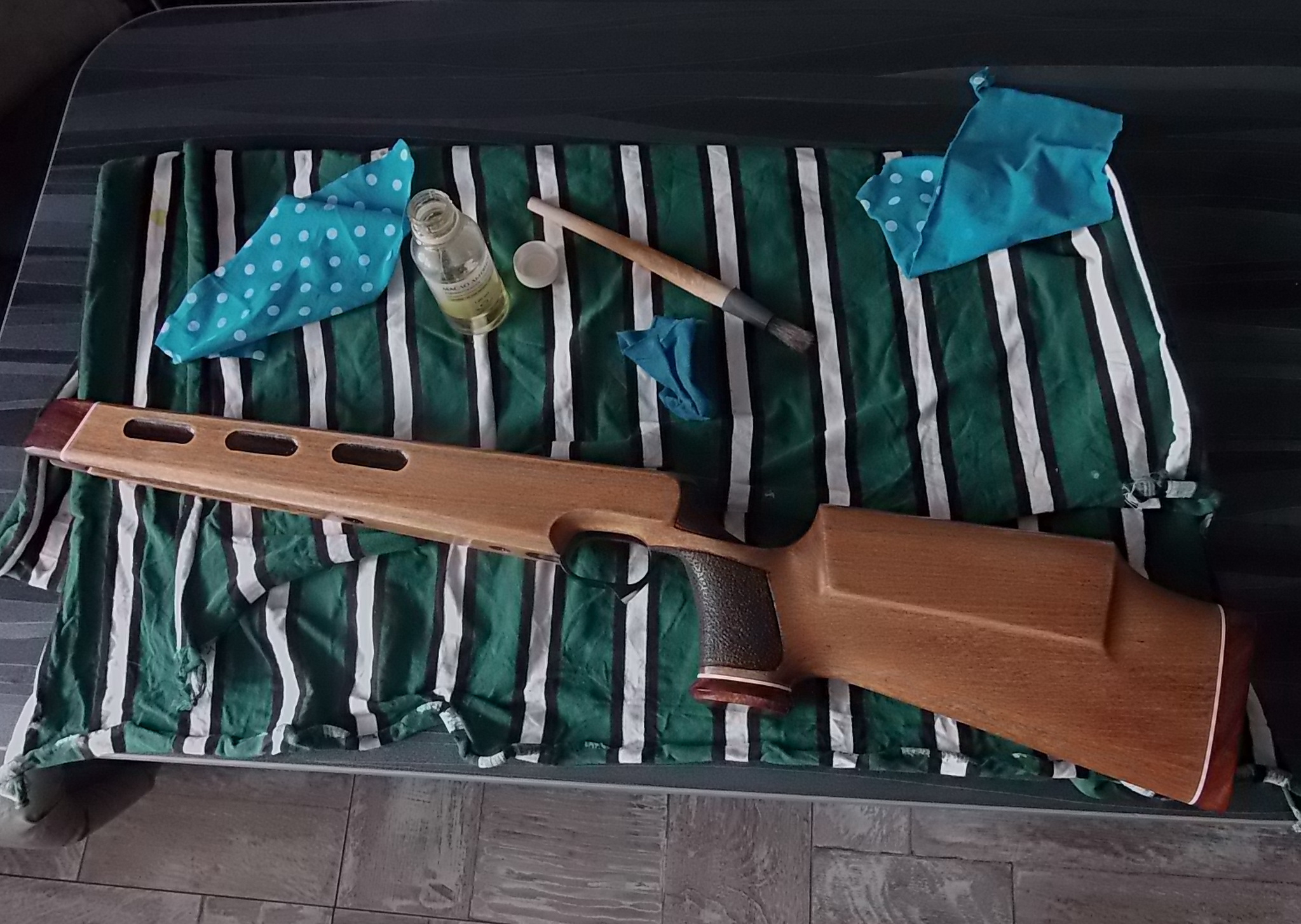 А ещё очень мне хотелось сделать справа на прикладе какую-либо лазерную гравировку. Как примеру мы делали «Орлана» на ложе под «Зуль-312». Но….Обещания помочь мне в этом вопросе лишь остались обещаниями. Потому из этой затеи ничего не вышло… Но признаться позже я осознал-той самой «татуировки» после пропитки пожалуй и видно не было бы. Как всегда говорят- «Чем проще-тем лучше»!!! Ну а так как всё было готово к пропитке-к ней и приступил. На старте применил льняное отбеленное масло. Для нанесения на гладкие поверхности применял тряпочку, а там где пористые участки-втирал масло кисточкой. Это чтобы возможные ворсинки с тряпочки не сыпались в эту пористость. В общем за один подход втёр я в ложу практически весь флакончик масла. Обтёр немного погодя ложу насухо и отправил на основательную сушку в подвешенном состоянии в тёмной кладовке. А начало перед вами: