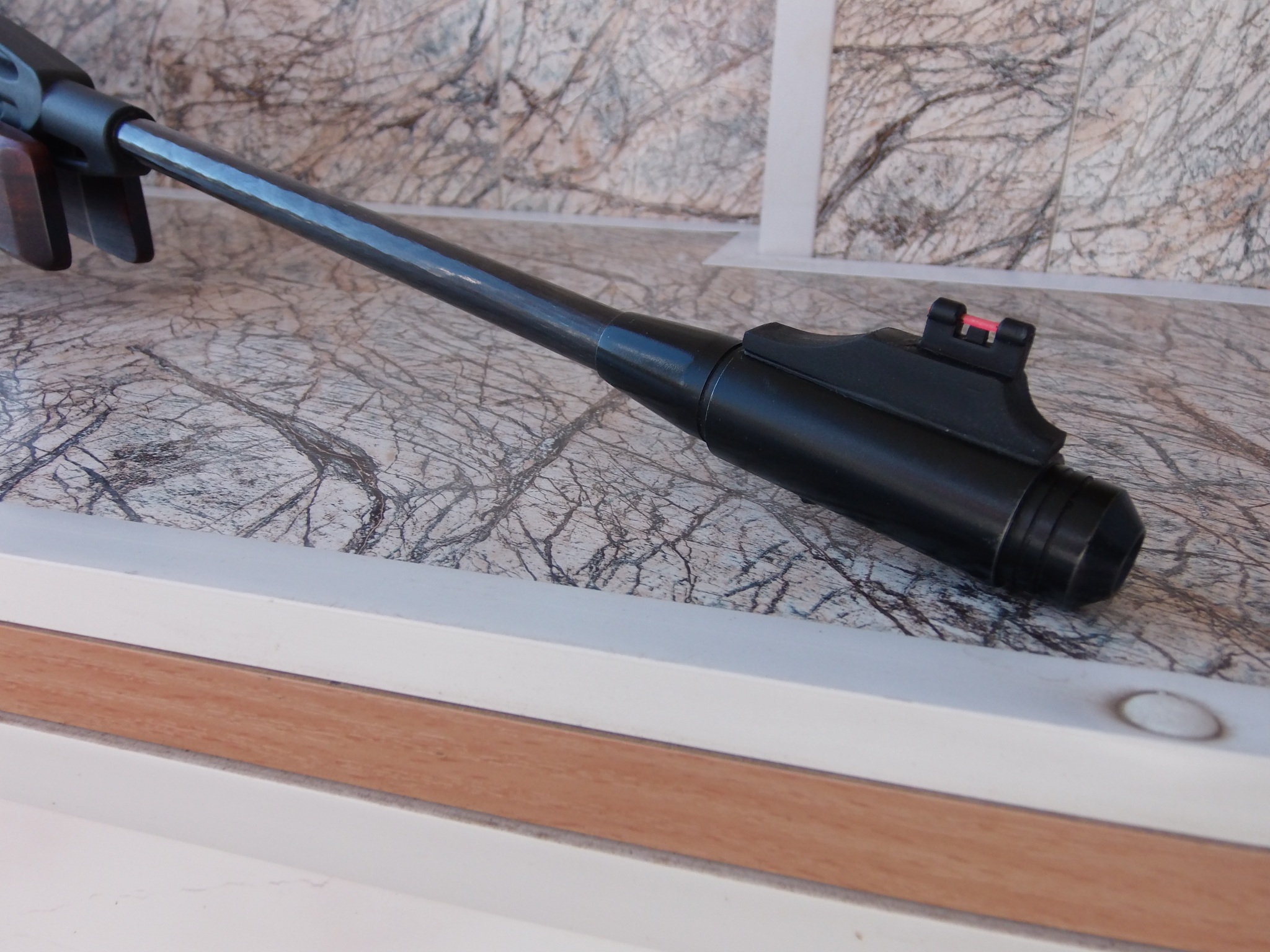 Сделал только на токарном станке новый надульник для «Мурки» и оснастил его мушкой с красной фибронитью. Мушка надёжно закреплена на этом стальном надульнике двумя винтами+ЭДП. А потом заворонил его и уже по воронёному после обезжиривания окрасил его ружейным лаком «Нигрозин». Получилось здорово. Длину ствола изготовленный надульник увеличивает на жалких 5-7мм, не более. Результат вот такой:
