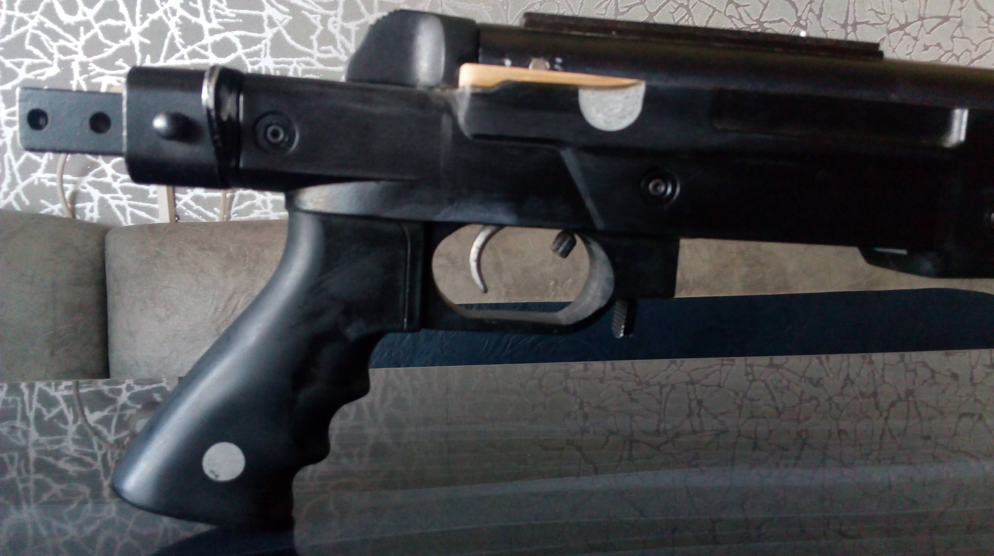 Ну согласитесь? Неплохо! А отбросьте его? Не так закончено выглядело бы! Ну ниже увидите-действительно нужен он был. Ну да ладно! Далее!!! А далее был конфуз! После примерки выяснилось-спусковой крючок весьма короткий! Предохранителя вообще не видно было. Следовало их удлинить. Дружище Дима отыскал мне целых три крючка! Идеально для наращивания подходил такой же крючок от «Мурки». Опять же проверенным путём-крючки я наращивал уже не раз таким способом, а именно: от родного отпилил ненужное, «имплантанту» придал нужную форму на наждаке, наделал на обоих болгаркой лёгких рисок, развёл ЭДП с метал.пылью, обезжирил детали, намазал их клеем и с помощью рук моей жены стянули это дело на клею арамидной нитью. Нить при обматывании также пропитывалась клеем. После высыхания-БРОНЯ!!! Намертво-не оторвёшь при желании. Ну и предохранитель доработал. Нет! Его конечно можно было и удалить, но порешил пущай будет! Хотя заказчик после сказал что не следовало мне заморачиваться им, а просто ампутировать. Просверлился я «троечкой» в пяточке где пружинка, нарезал резьбу М4, вкрутил винтик туда. Примерил, вычислил как мне его надо загнуть для удобства, обрезал излишек,на кончик нашлась в коробке весьма опрятная пластмасска в плане головки-её закрутил на винт на супергель. После последней примерки винтик закрутил уже на ЭДП после обезжиривания и для надёжности облепил вокруг смесью ЭДП и метал.пыли. Вышло всё отлично,а главное удобно и функционально. И крючок в правильном положении, и с предохранителя снять винтовку стало раза в 3 легче чем родной кнопкой! Ей богу! Вот как всё скрепилось и как всё стало на места: