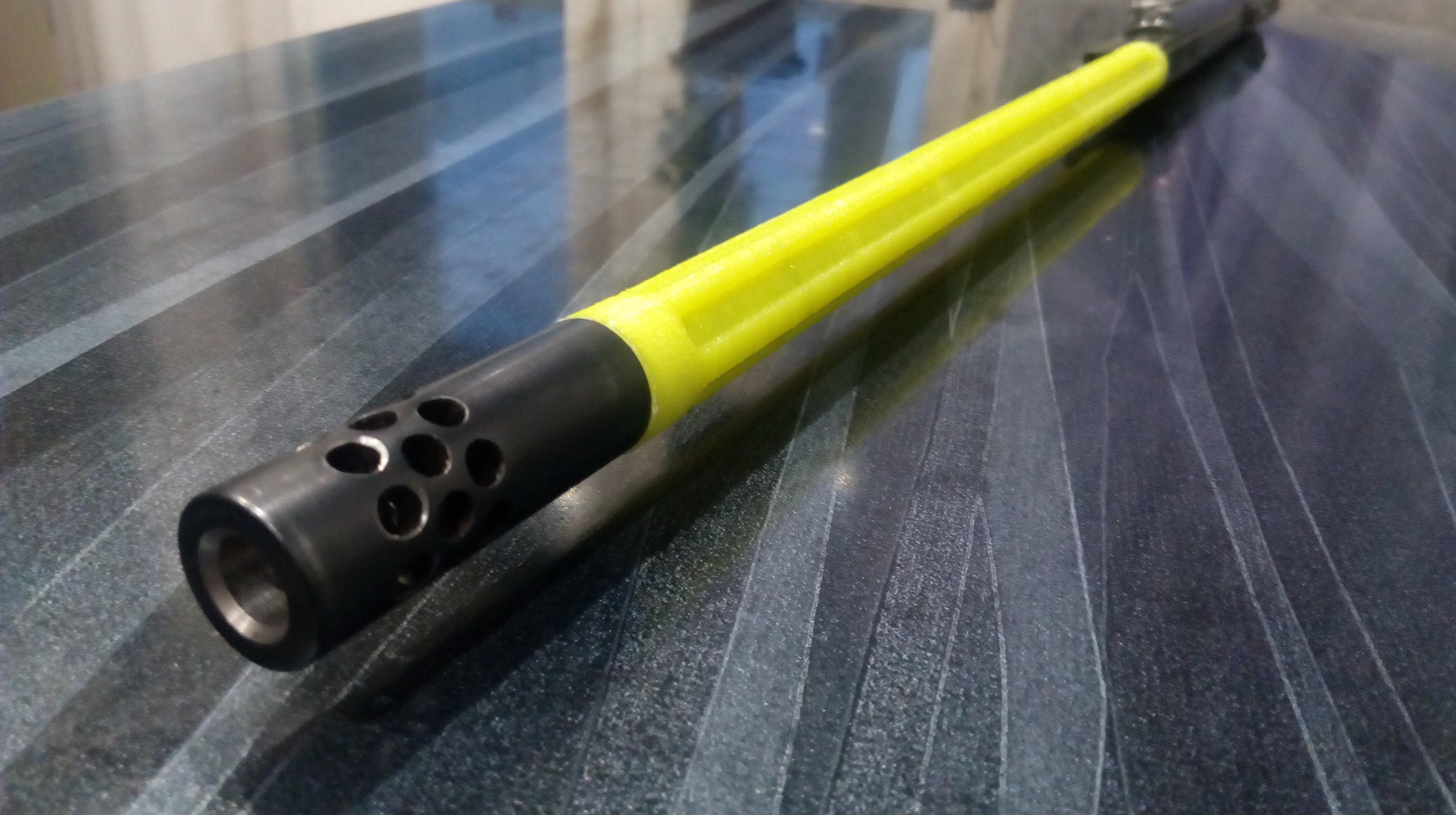 После окрашивания разумеется всё это выглядело по-другому. Ну потом увидите!!! А далее расскажу о фальшстволе с долами. Его после обезжиривания ствола снаружи посадил до упора в муфту ствола на ЭДП. Специально для этого проекта в качестве бонуса заказчику изготовлен был шикарный дульный тормоз. Длина фальшствола была расчитана так, чтобы резьба на стволе оставалась для его крепления. Ну и вот так на тот момент всё получалось: