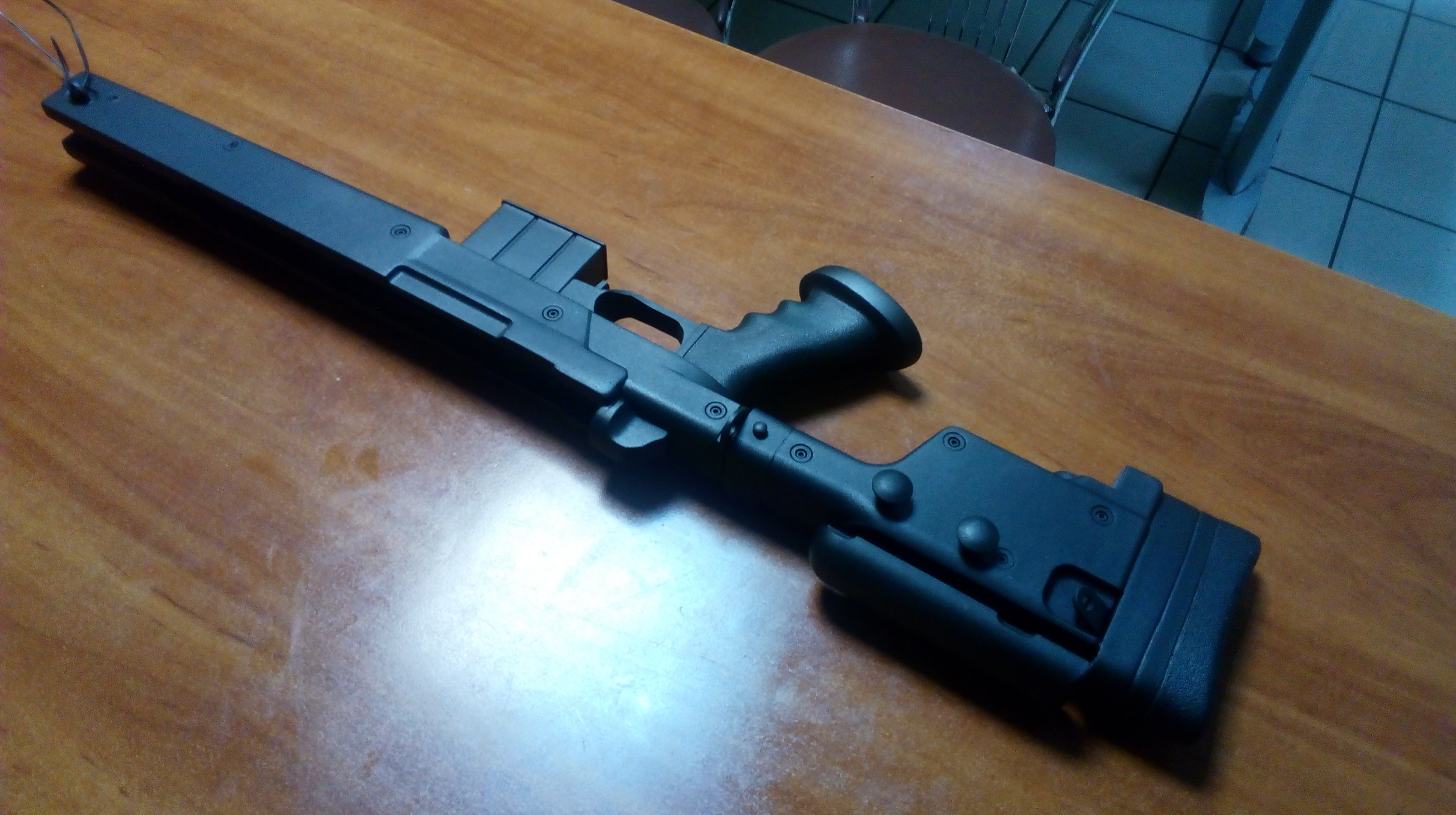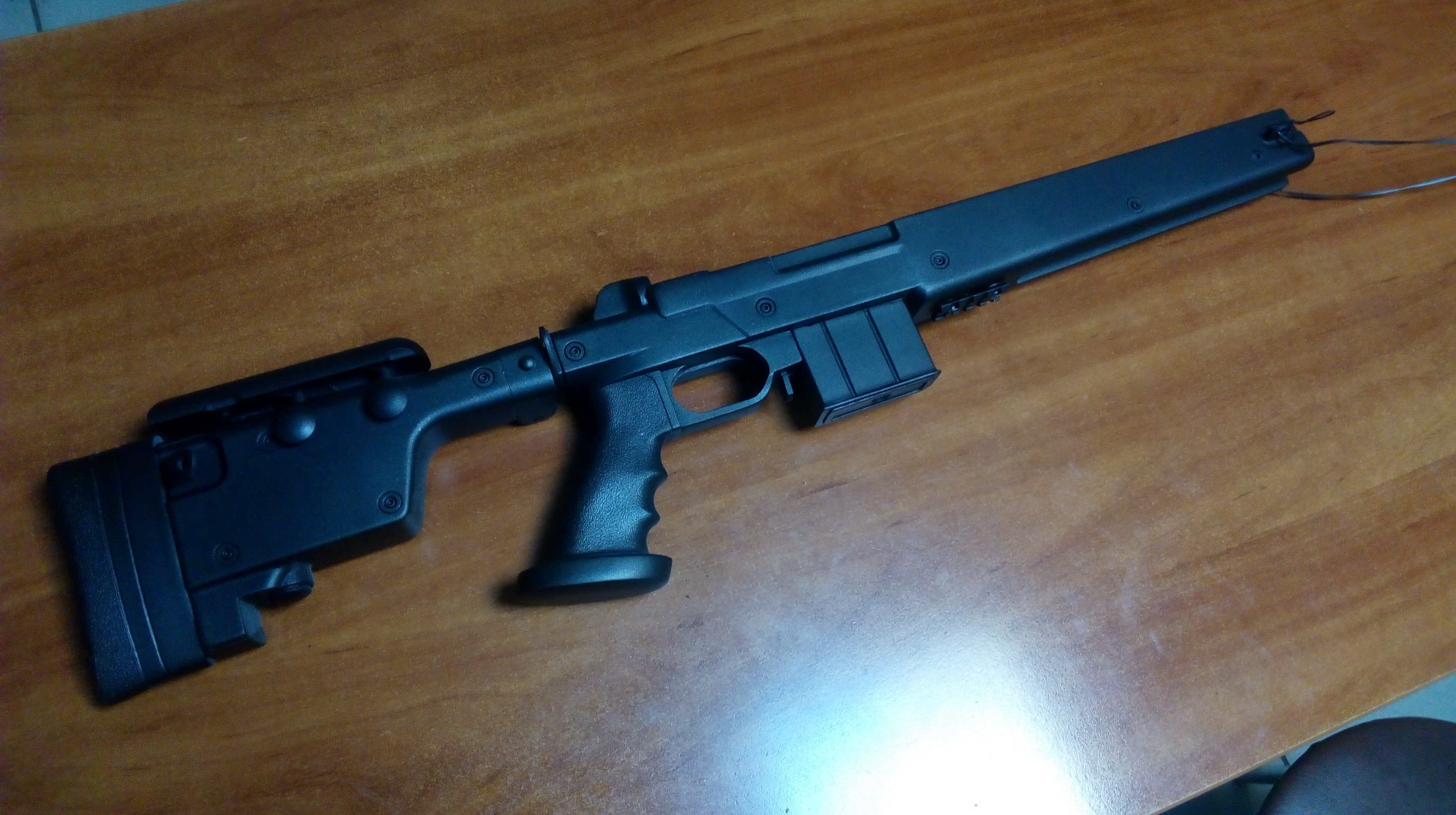 Всем привет!!! С наступающим Новым Годом!!! Ну и как итог уходящего 2019 года, представлю Вам новую работу по стилизации пневматики. Так уж вышло что именно стилизацией стал этот проект. Обратился с просьбой один из форумчан изготовить ему что-то необычное для его «Мурки»-в частности ложу. Но после перенесённой травмы руки, пользовать винтовку в ложе с полупистолетной рукояткой было ему неудобно. Потому была просьба изготовить что-то именно с пистолетной рукоятью. Наморщил ум, порисовал, прикинул….. Ну не нравились мне идеи. И тут вспомнилось что дааааавно прикупил «на всякий случай» ложу от страйкбольной модели снайперской винтовки типа «AWP». Предложил гражданину именно в неё попытаться вкорячить его «512»-ю. Согласие принял незамедлительно. Честно говоря и самому стало интересно что выйдет из этого. Ну и понеслось…Правда медленно неслось)))))))) Вот такую ложу планировал использовать в проекте: