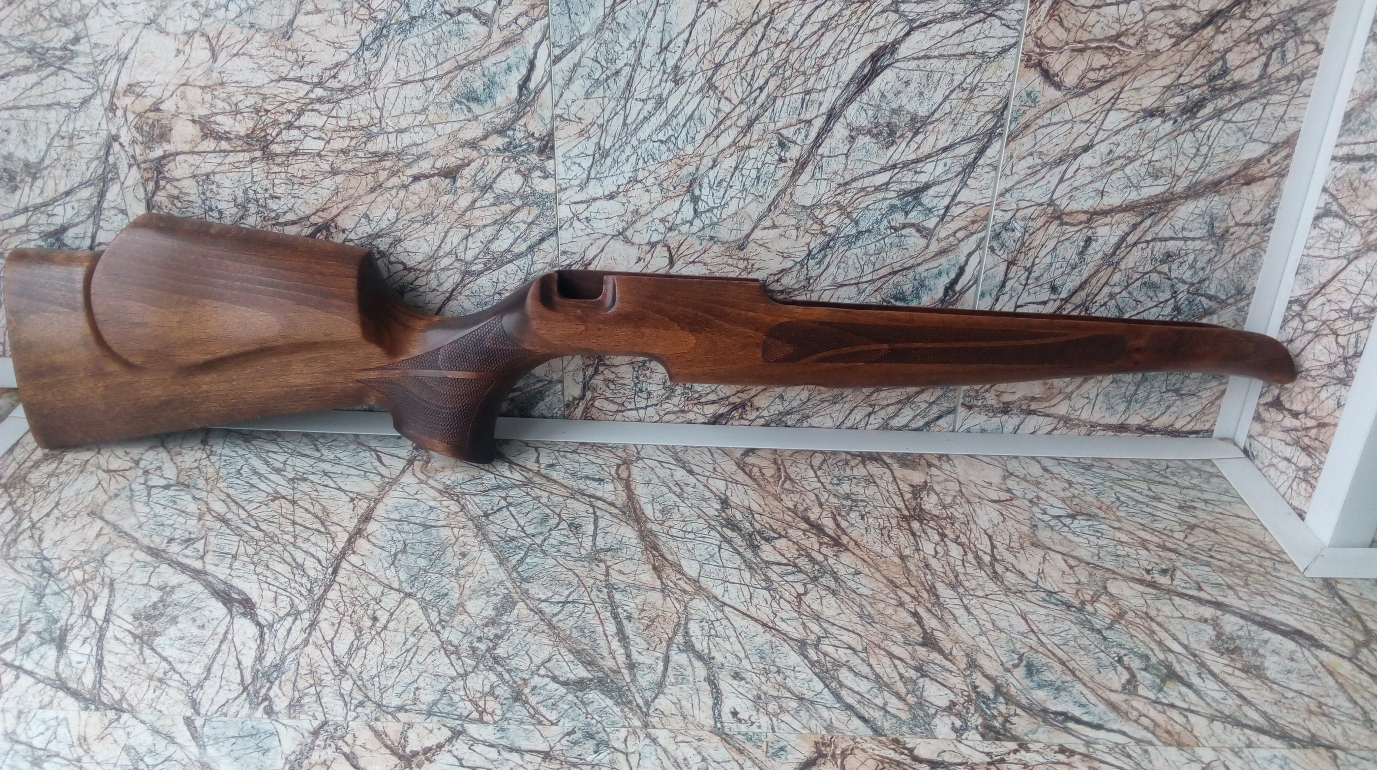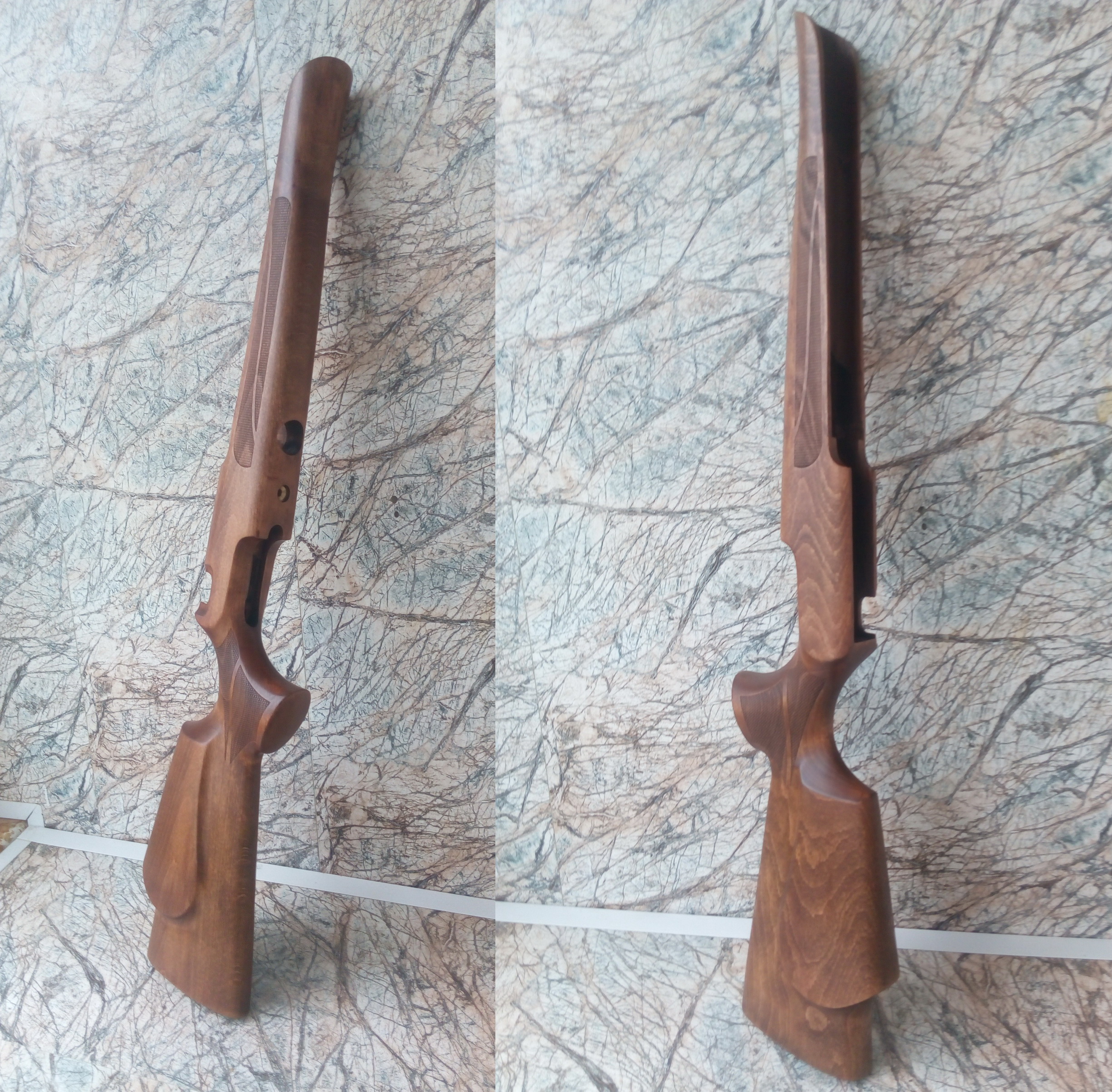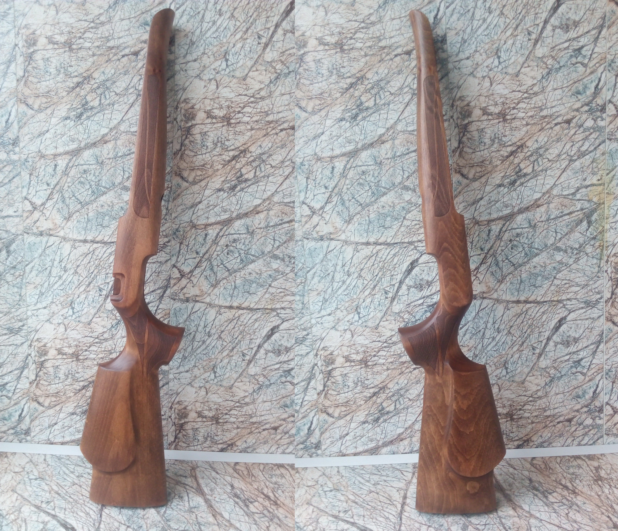 Прежде всего окрасил ложу морилкой водной "Дуб",добавив немного "Палисандра". Владельцу как и мне нравятся ложи более класического цвета. Окрашивал с помощью тряпочки-т.е. ложу натирал смоченной в морилке и хорошенько отжатой тряпкой. Сделал два подхода,не ожидая полного высыхания,взял чистую мягкую тряпочку и смочив в гор.воде,хорошенько отжав,растёр нанесённую морилку. Это помогает удалить лишнюю морилку,разводы,открыть лучше текстуру дерева тем самым и сделать цвет более равномерным. После по высохшей ложе прошёлся "Миркой" с зерном 2000-2200. Дерево стало едва ли не зеркальным. Вот таким: Теперь можно было приступить к пропитке. Применялось масло льняное отбеленное в этих целях. Натёр несколько раз ложу-дерево охотно питало масло,потому не жалел его. Немного дал в подвешенном состоянии деревяшке напитаться маслом. И после растёр ложу мягкой тряпочкой,отправил на трёхдневную сушку в подвешенном состоянии в тёмной кладовке. Вот высохший первый слой: Как видите текстура стала уже более отчётливой в сравнении после нанесённой морилки. С периодичностью в сутки нанёс ещё два слоя. Третий в принципе можно было и делать,но сделал. В итоге уже такой оттенок приобрела ложа: Далее пришло время Дэниш Ойл. Был остаток как раз на одну ложу-цвет неопределённый,смесь масел Дэниш. Там и светлый и тёмный орех+чёрного ореха немного. Наносится равномерно растирая на 30 минут,затем той же тряпочкой чуть оживляется нанесённое масло. Оставляем на 15 минут ещё и после чистой мягкой тряпочкой хорошенько растирается деревяха. Надо убрать все подтёки,разводы,оставленные пальцы обязательно! Т.е. практически насухо растереть ложу необходимо! Первый слой нужно также посушить пару-тройку дней. Так первый слой Дэниш Ойл сработает на манер грунтовки-закристализуется в порах и последующие слои постепенно будут приносить полуглянец. Вот после первого слоя Дэниш ложа: Как видите текстура после этого масла стала ещё красивее и выразительнее. Было сделано ещё 3 прохода-по одному в сутки. Технология такая же как и с первым слоем.Последний слой нужно основательно высушить не менее 4-х дней! И после этого вот такой оттенок имела ложа "Крала": А теперь шерстяной старый шарф и хорошенько необходимо натереть пропитанную ложу. Ну чтобы добиться приятного бликования. Ну конечно! Не должна быть ружейная ложа как скрипка Страдивари. Но какую-то элегантность должна и она иметь. Верно? Ну и вот-покрасивше стала палочка: Ну и в таком вот виде ложа была отправлена владельцу на дополнительную полировку и окончательную сборку. В общем и целом думаю он остался доволен итогом,лично мне итог понравился. Особенно когда увидел "Крал" в сборе. Вот собственно и финальные фото-дома и на свежем воздухе. Красиво мне кажется и практично: