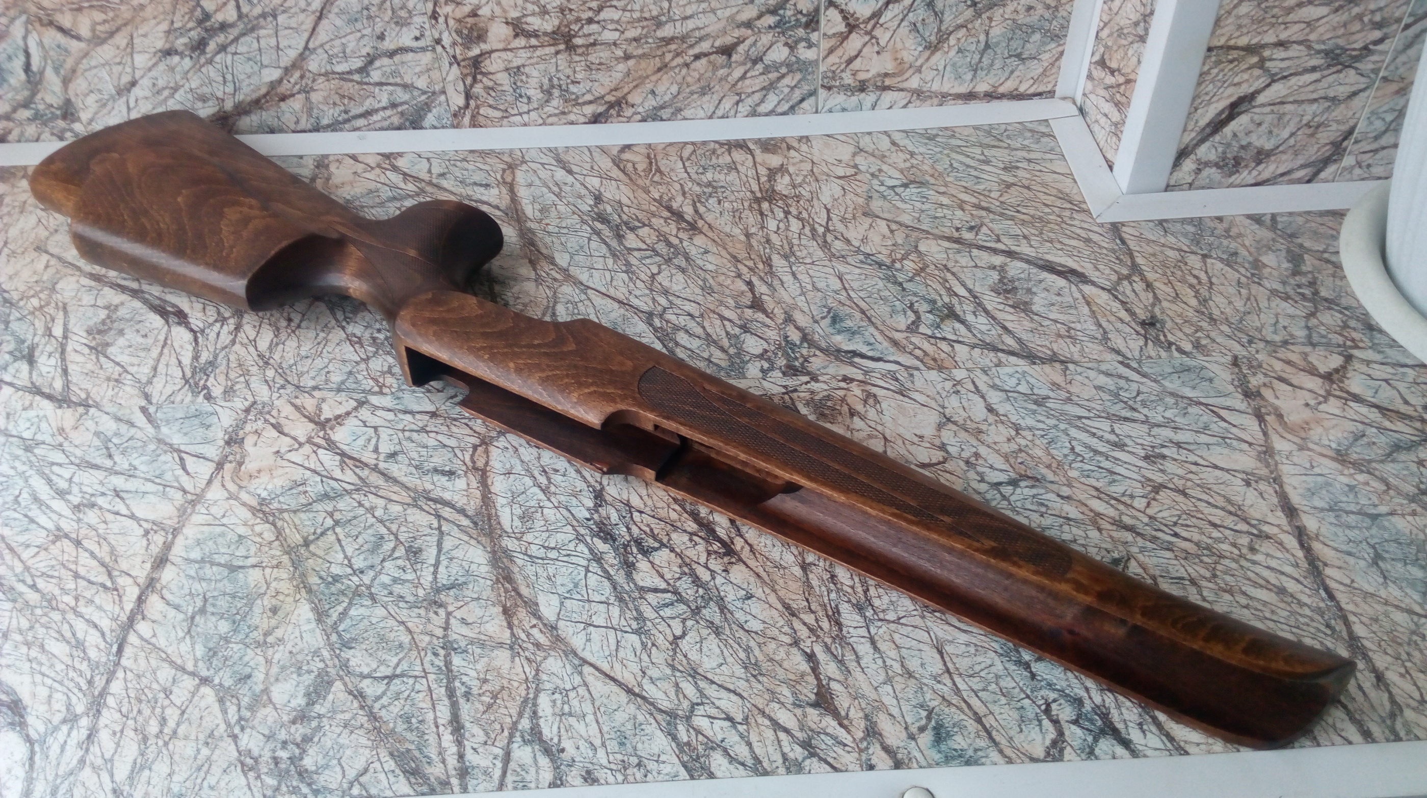 Ну а попутно с той работой выполнял потихоньку и эту. В общем была просьба от форумчанина помочь ему с пропиткой ложи винтовки советом. Купил он новенький "Крал". Цвет ложи был очень светлым и покрыта она была лаком. Хотел он сделать её более практичной-пропитанной маслами. В чём я с ним совершенно согласен! Лакированная ложа и пропитанная-это две абсолютно разные вещи. Вмятинку на ложе если она пропитана можно удалить за пару минут не испортив покрытие. Я имею в виду с помощью влажной салфетки и утюга. А вот на лакированной ложе гарантированно останется пятно и не слабо заметное! На пропитанной достаточно будет обработать легонько маслом место ремонта и она