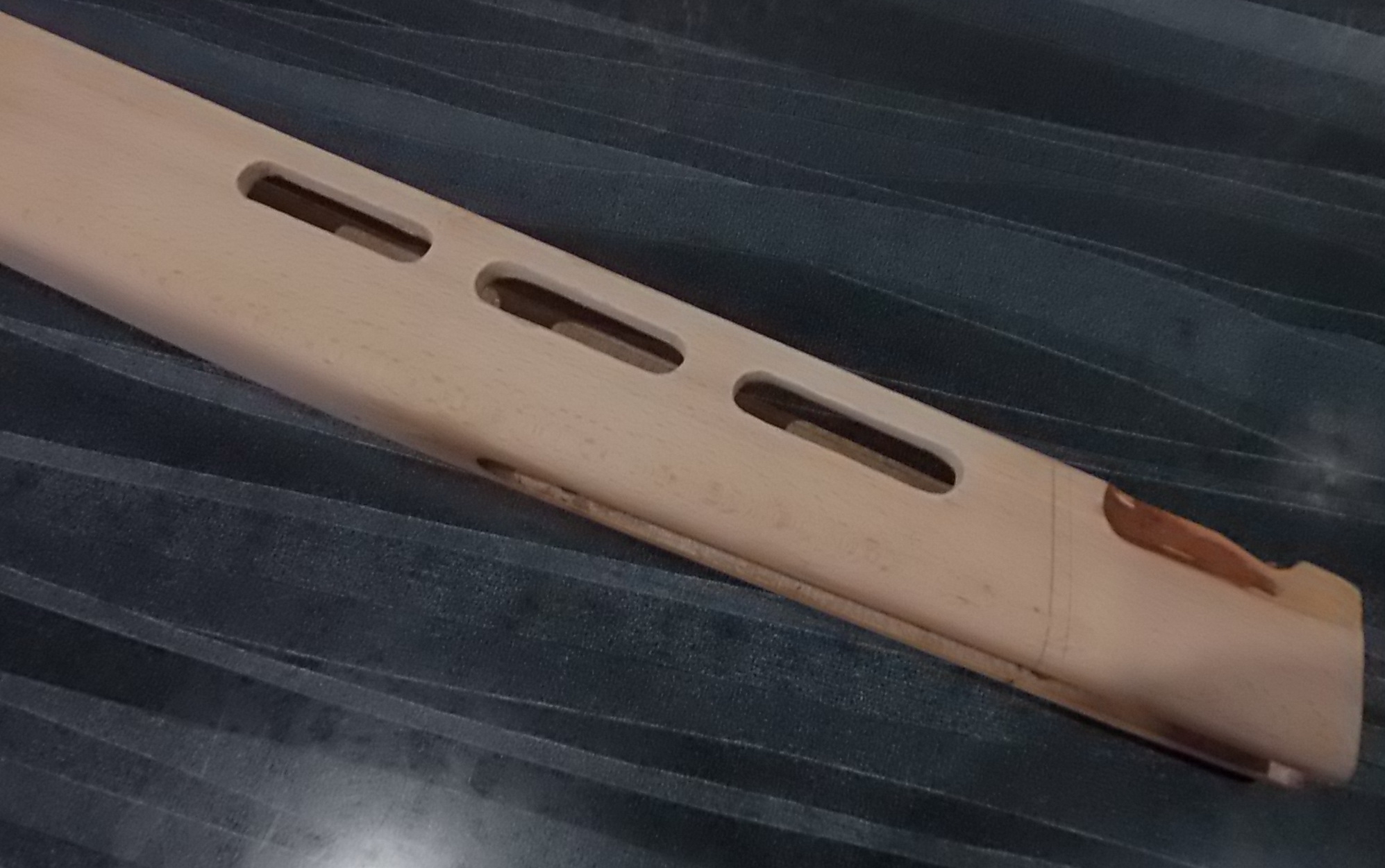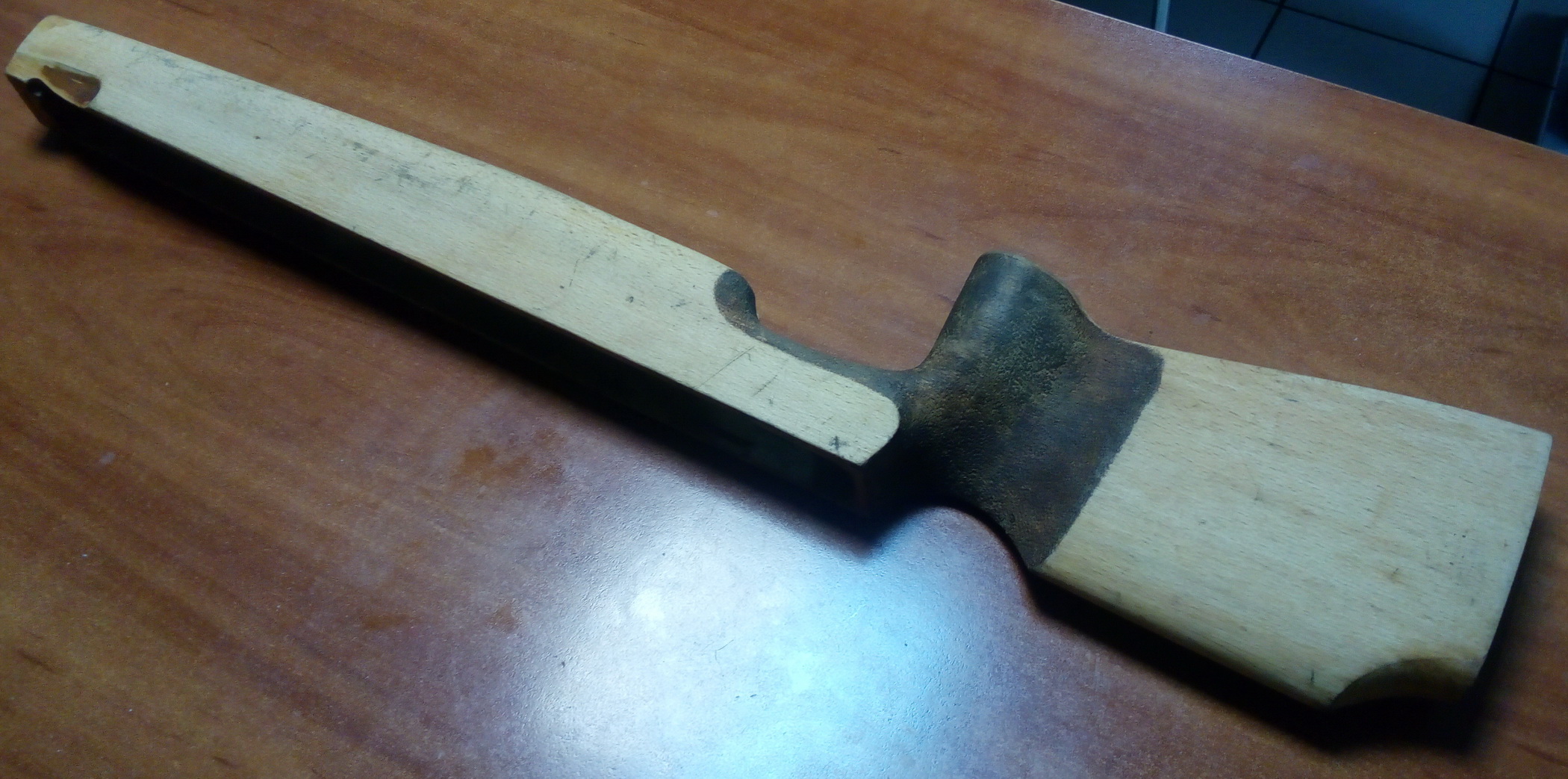 Красивое дерево! Согласны? После полировки станет ещё краше, уверяю!!! Ну а после этого принялся декорировать и цевьё-его нос. Как обычно и его решил не оставить без внимания. Отрезал излишки, при этом муфту ствола я изначально задумал спрятать в ложе: