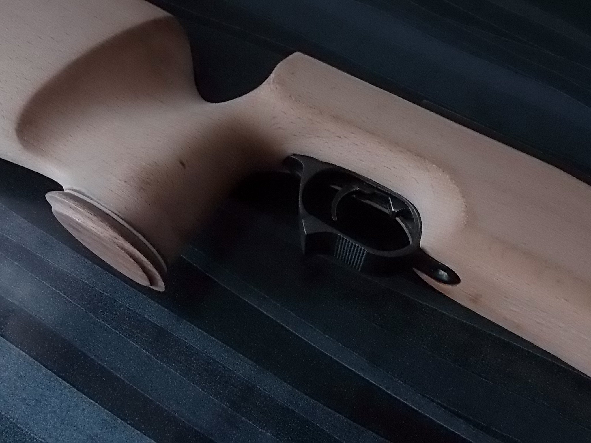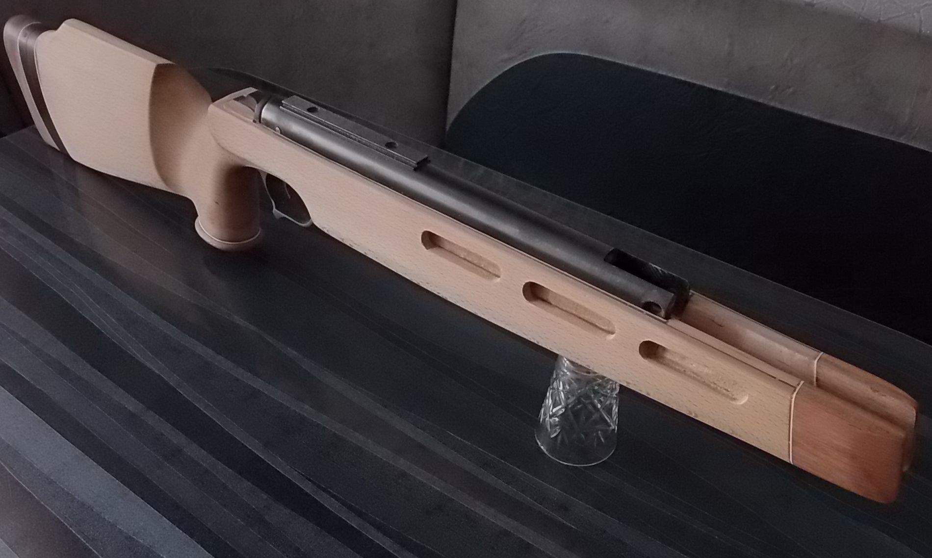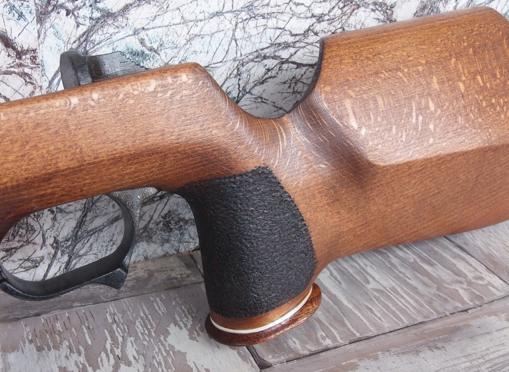 Компрессор отлично упирался в изготовленный вклеенный задник, спусковой крючок с «Муркиным» предохранителем оптимально торчали из спусковой скобы. Наращивать их не пришлось что конечно порадовало. Выходило всё как нельзя хорошо. Приклеенный дубовый шпон хорошо слился с буковой ложей. После зачистки станет ещё лучше! Вот гляньте что у меня получалось на тот момент:
