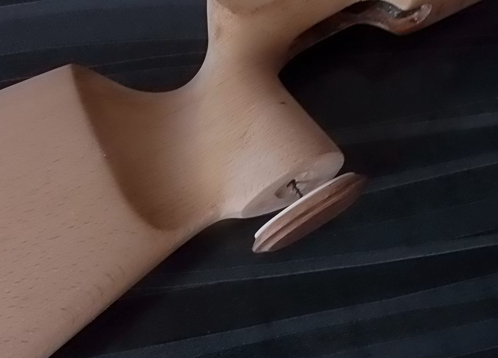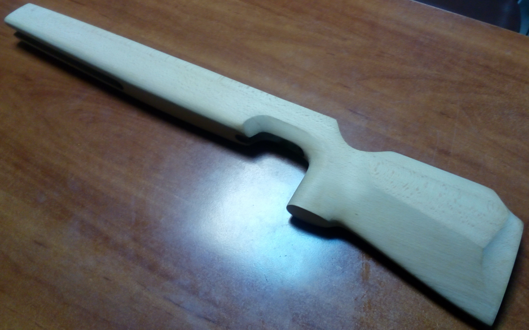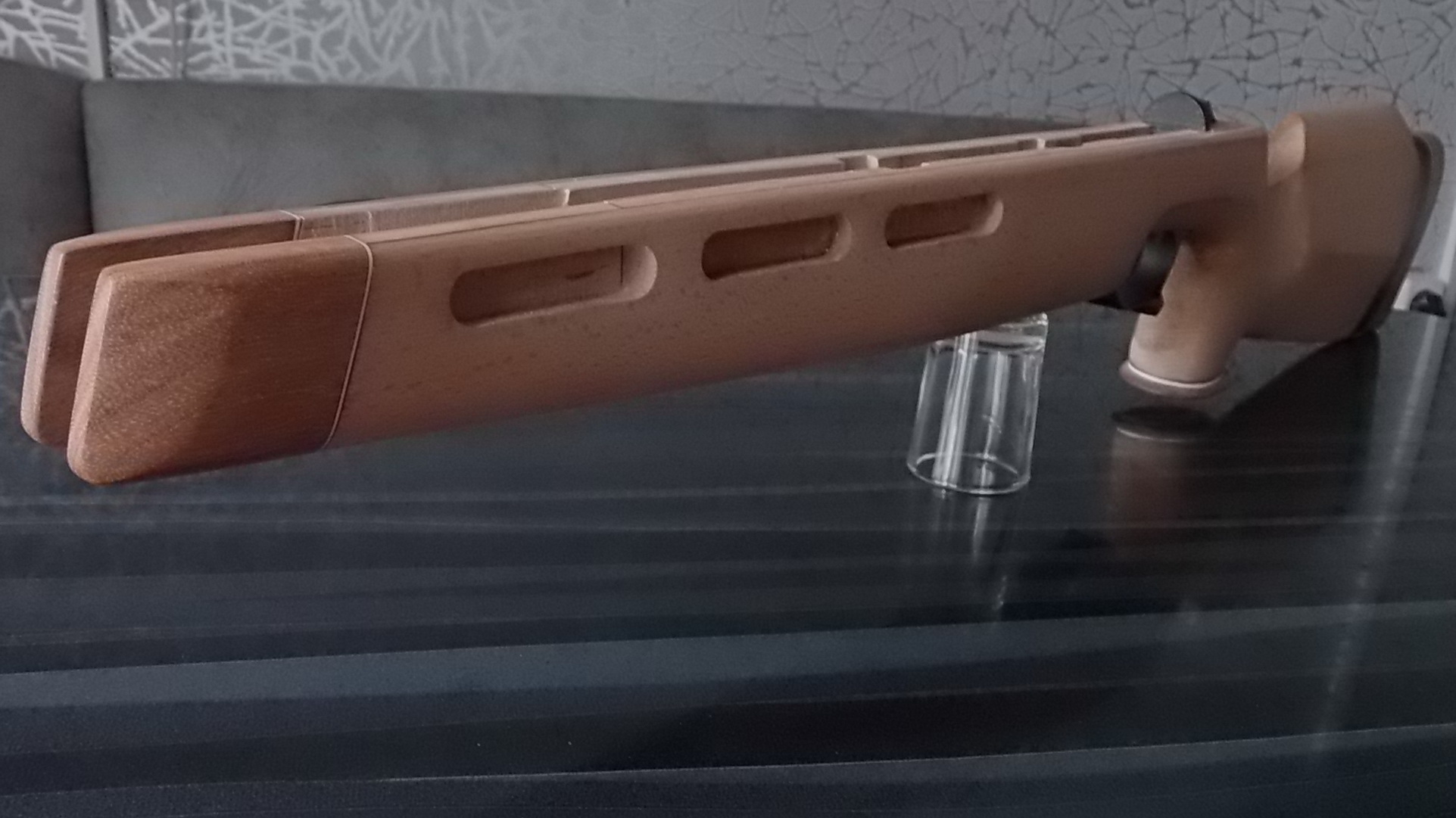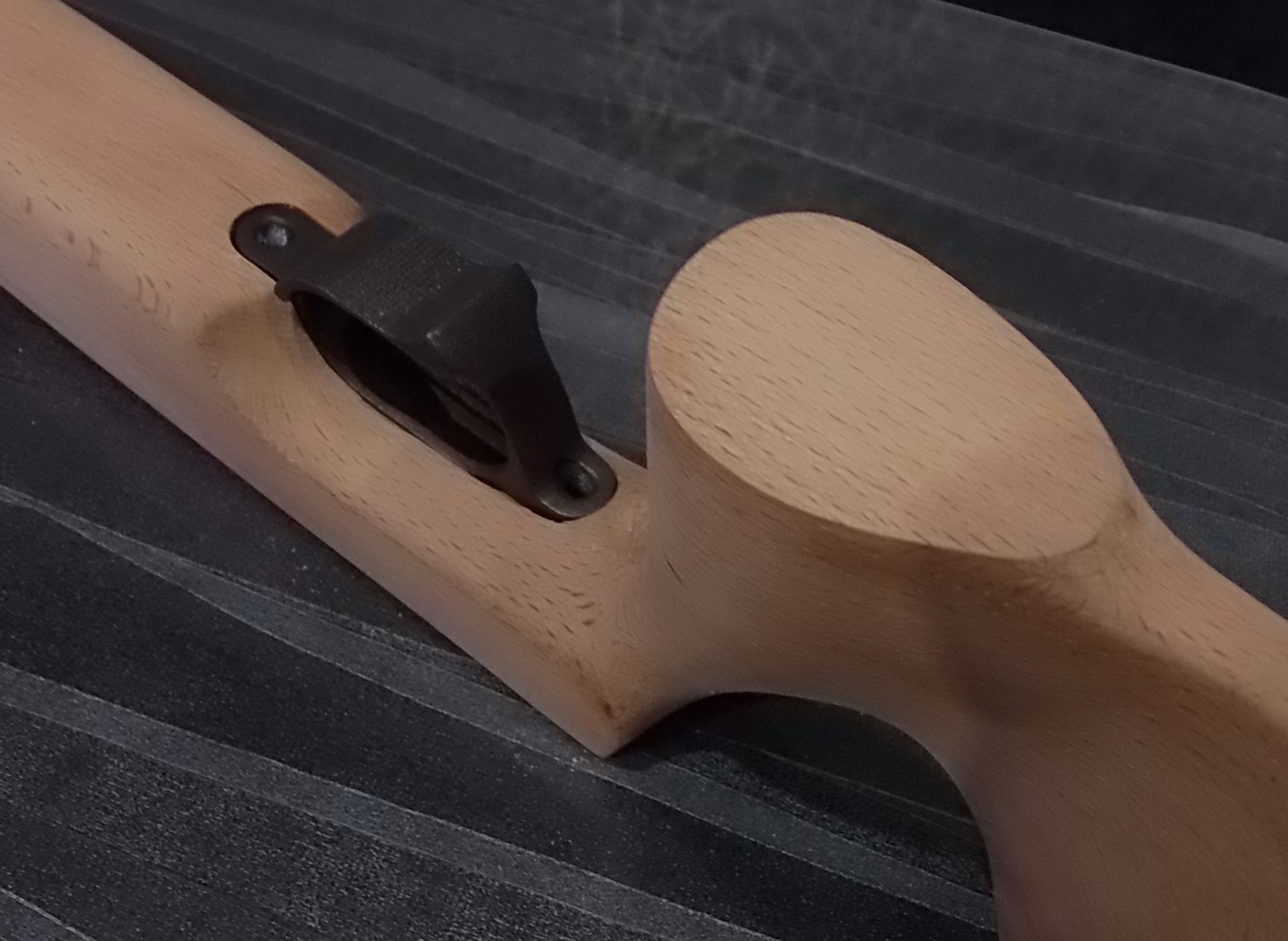 Компрессор отлично упирался в изготовленный вклеенный задник, спусковой крючок с «Муркиным» предохранителем оптимально торчали из спусковой скобы. Наращивать их не пришлось что конечно порадовало. Выходило всё как нельзя хорошо. Приклеенный дубовый шпон хорошо слился с буковой ложей. После зачистки станет ещё лучше! Вот гляньте что у меня получалось на тот момент:
