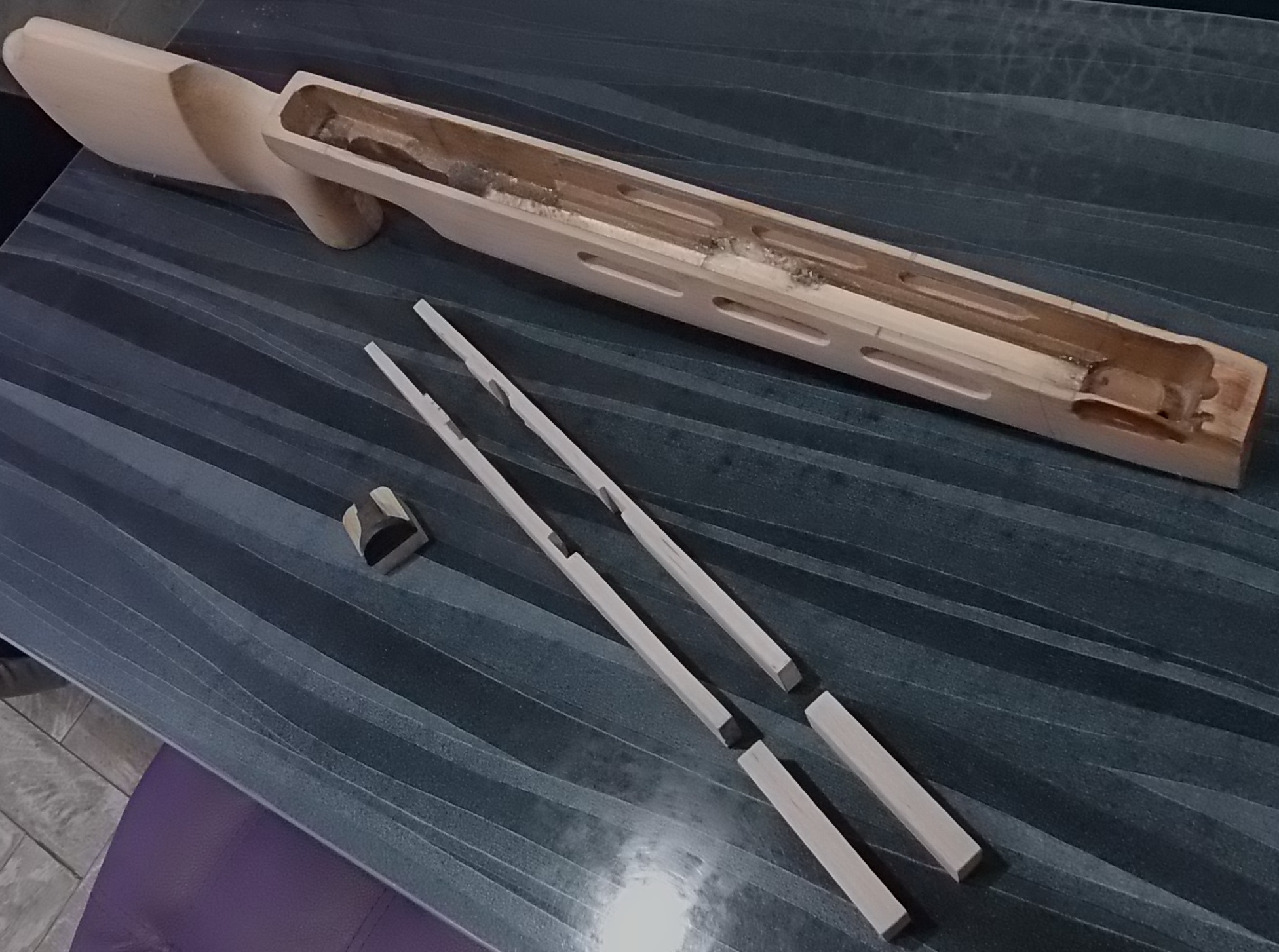 После брусочек с задником был вклеен в заднюю часть старой выборки, также и посадочное место скобы было доработано. Отлично и скоба подошла к ложе. Легла «как бабушка просила»))) Вот и вставки для вклейки были приготовлены-две длинных и две коротких. Вклеил их поочерёдно в ложу. Предварительно сделал в них и выборку под опоры в «железе». Ну чтобы потом меньше возни было. Вот рассказанное: