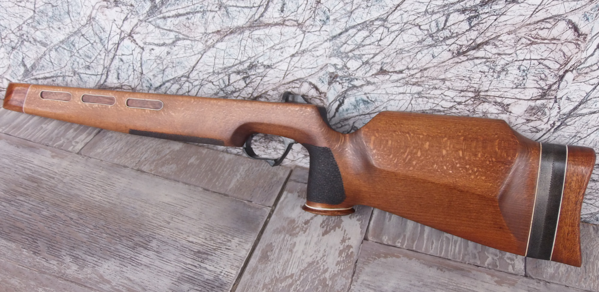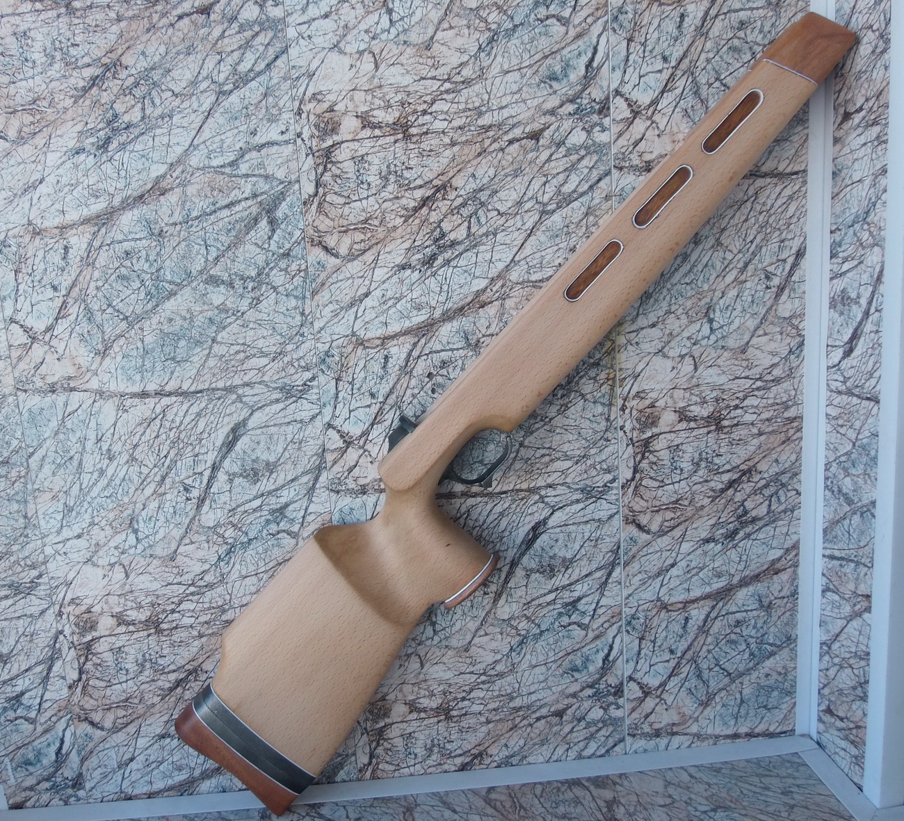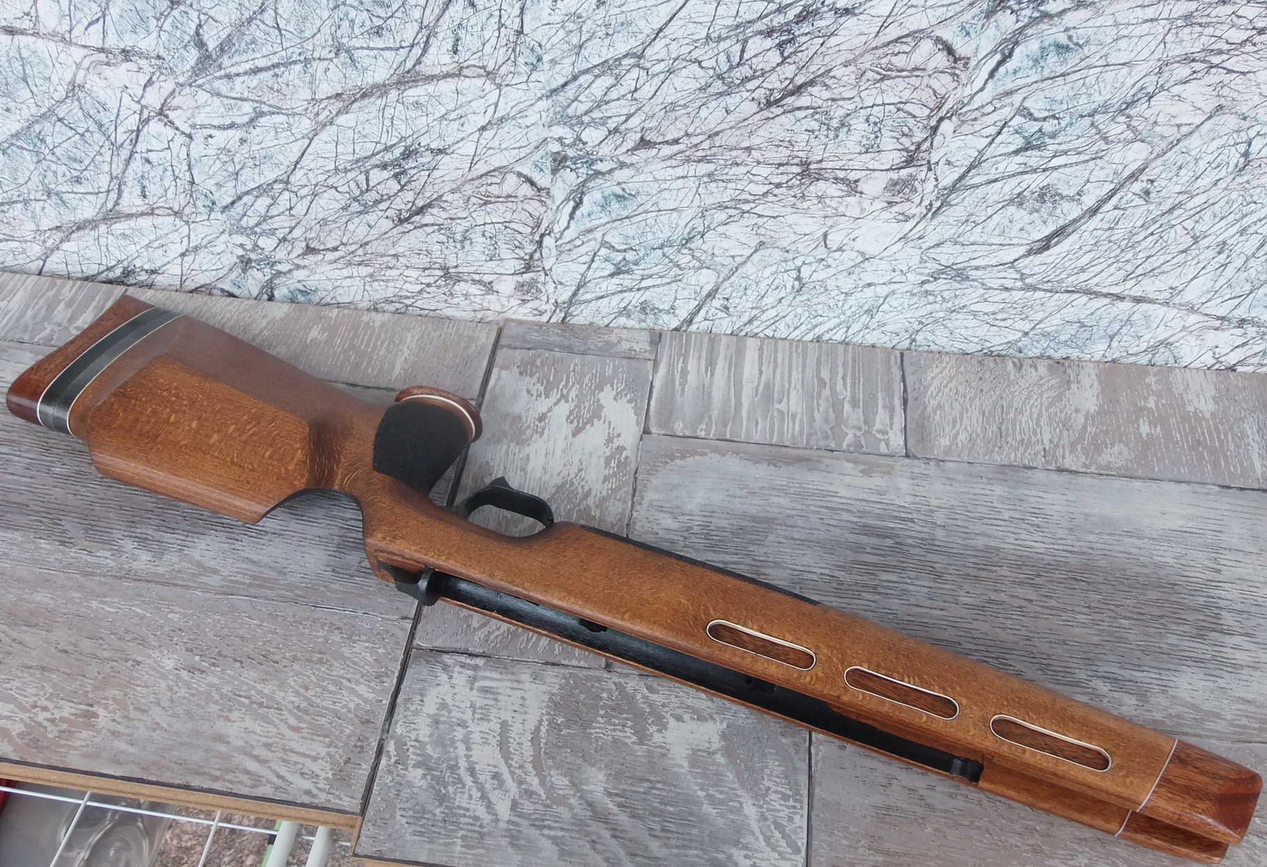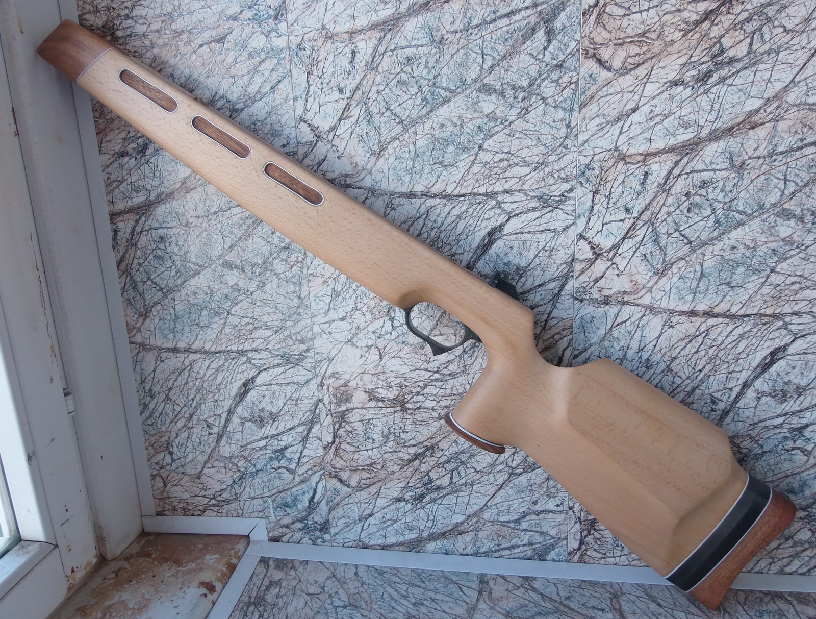 Как видите и сделанные окна в боковинах ложи я слегка декорировал. Подумалось что будет это не страшно выглядеть на винтовке. Коротко говоря-из той же индийской палки выпилил я тонкую дощечку. Из неё детским лобзиком неспешно 6 вставок с красивой фактурой в эти самые окна. Вклеил их на ЭДП и вокруг окна оклеил белым ПВХ пластиком в тон уже собранных на ложе элементов. Ну чтобы подчёркивало эти вставки наверно. И вот так стало дополнять индийское дерево бук на моей поделке: