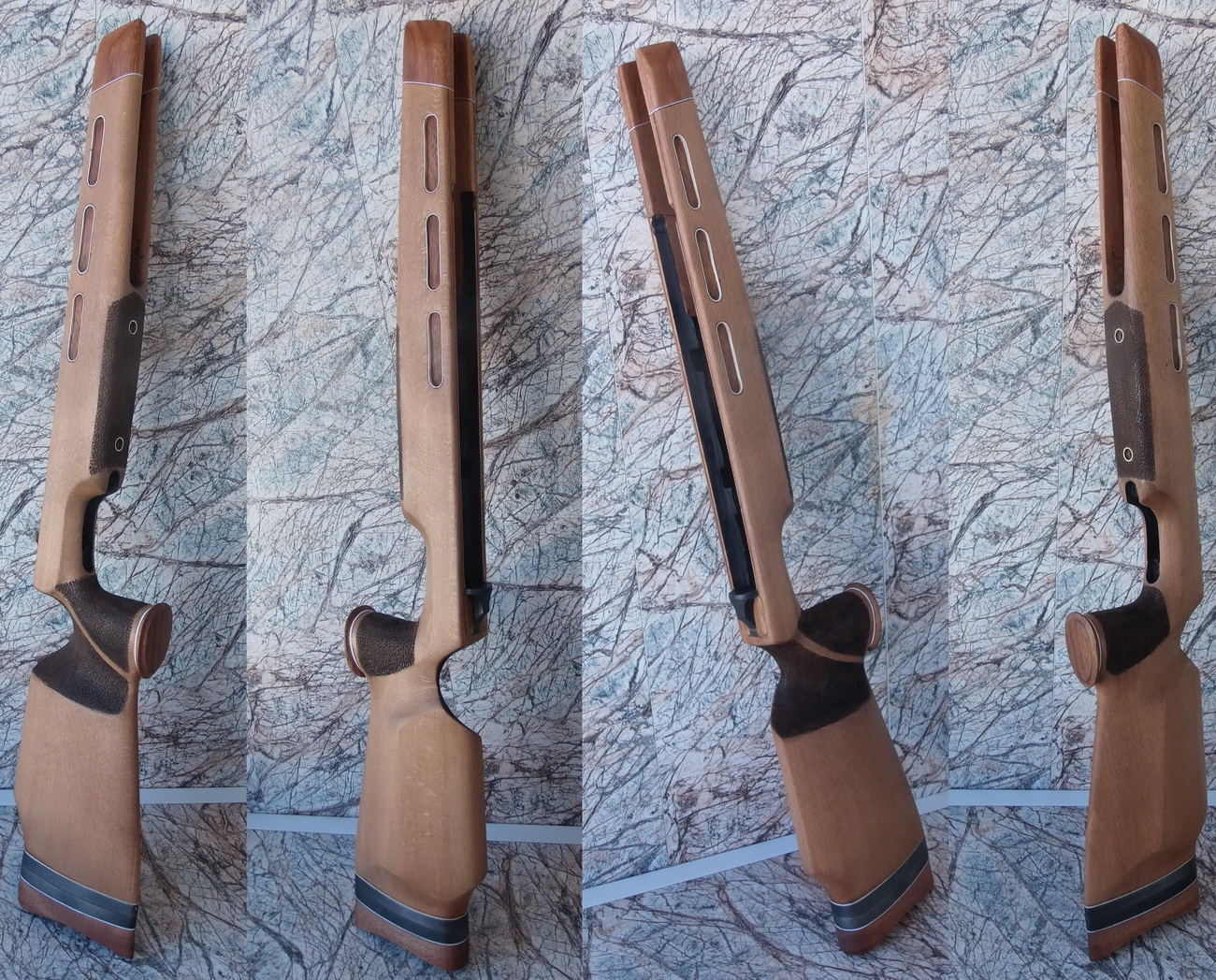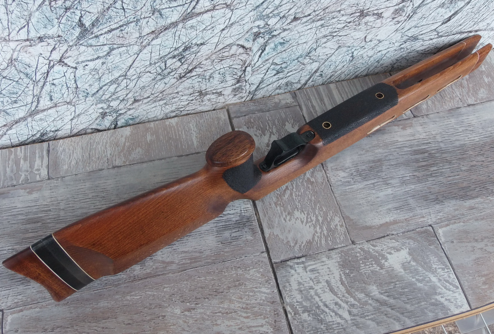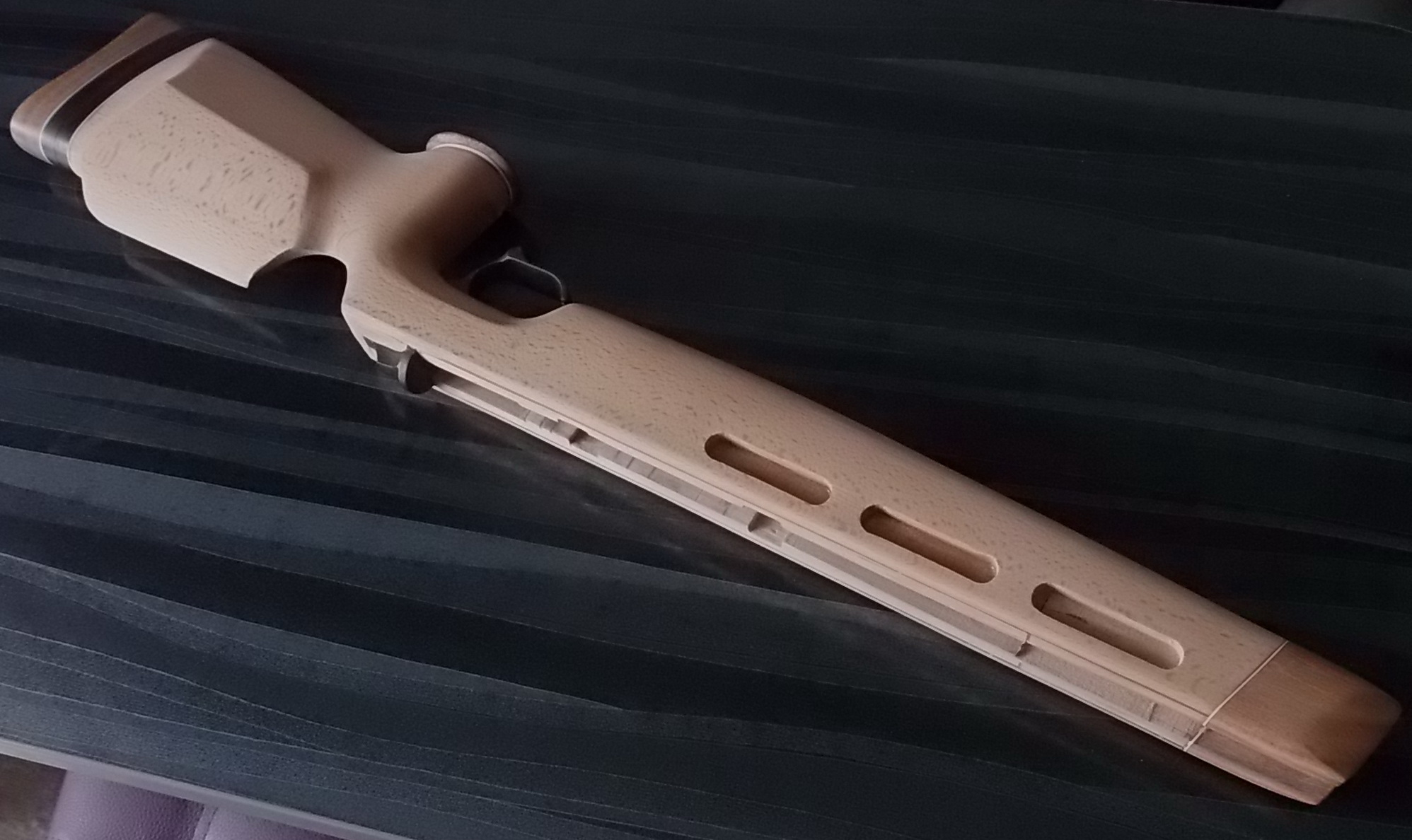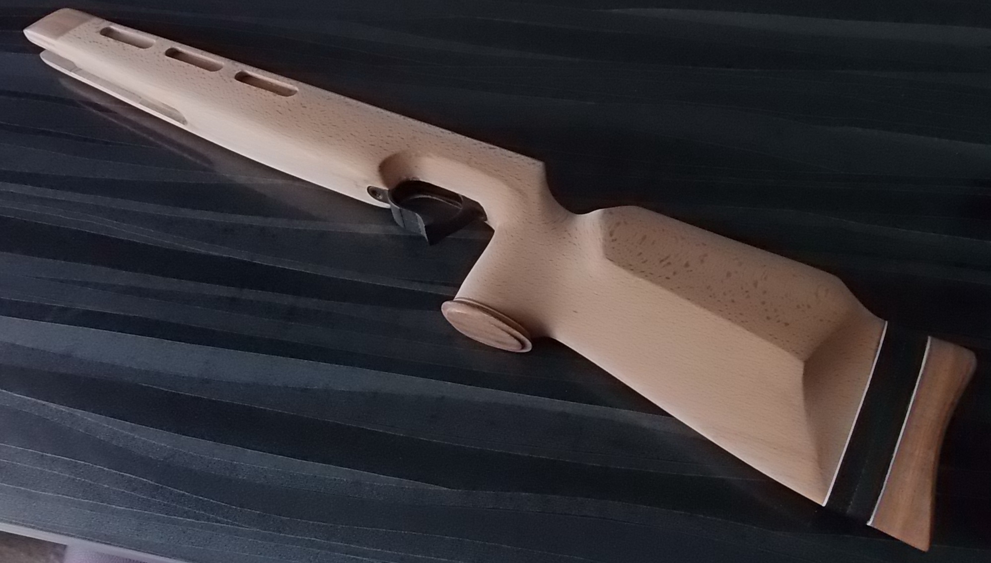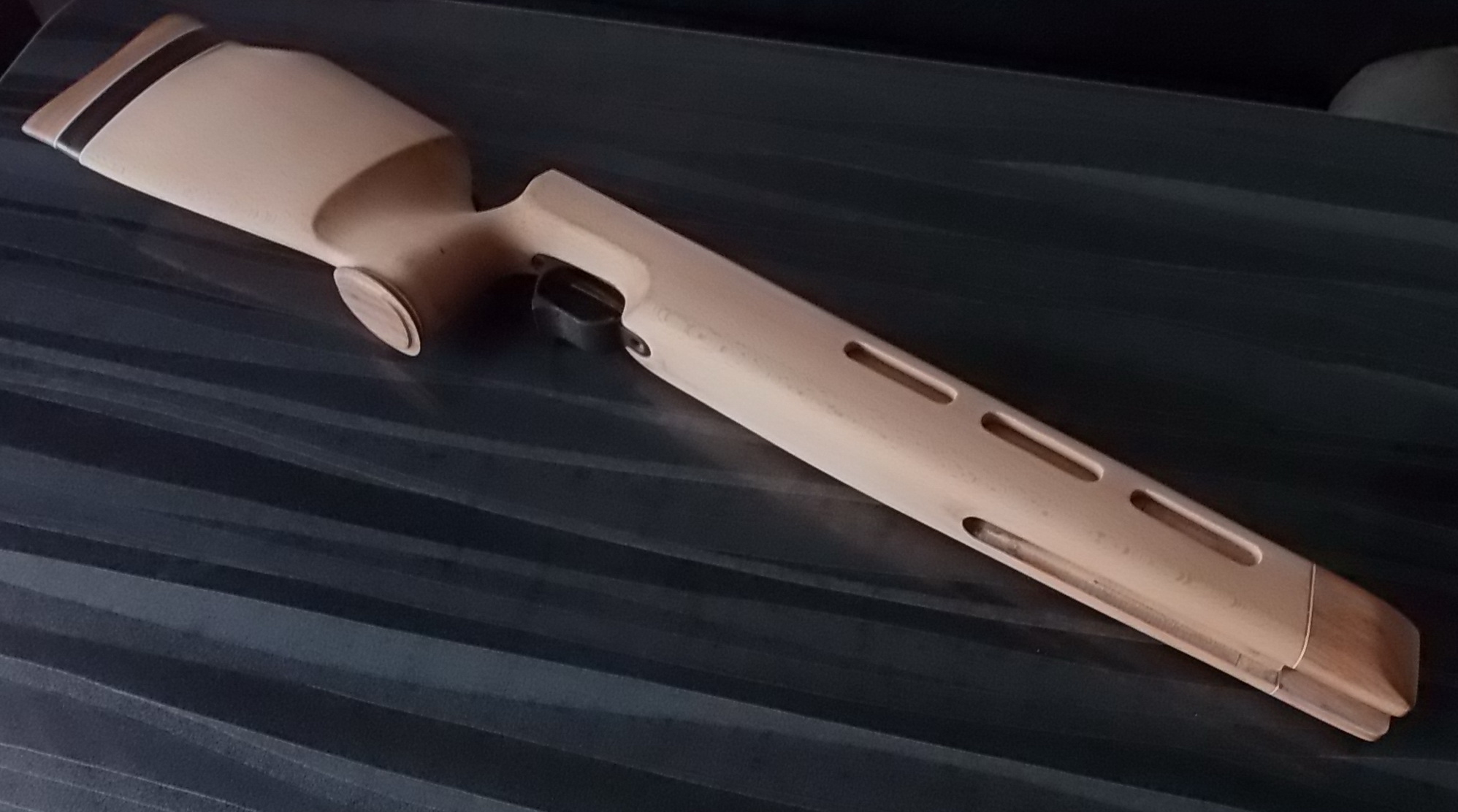 Как видите и сделанные окна в боковинах ложи я слегка декорировал. Подумалось что будет это не страшно выглядеть на винтовке. Коротко говоря-из той же индийской палки выпилил я тонкую дощечку. Из неё детским лобзиком неспешно 6 вставок с красивой фактурой в эти самые окна. Вклеил их на ЭДП и вокруг окна оклеил белым ПВХ пластиком в тон уже собранных на ложе элементов. Ну чтобы подчёркивало эти вставки наверно. И вот так стало дополнять индийское дерево бук на моей поделке: