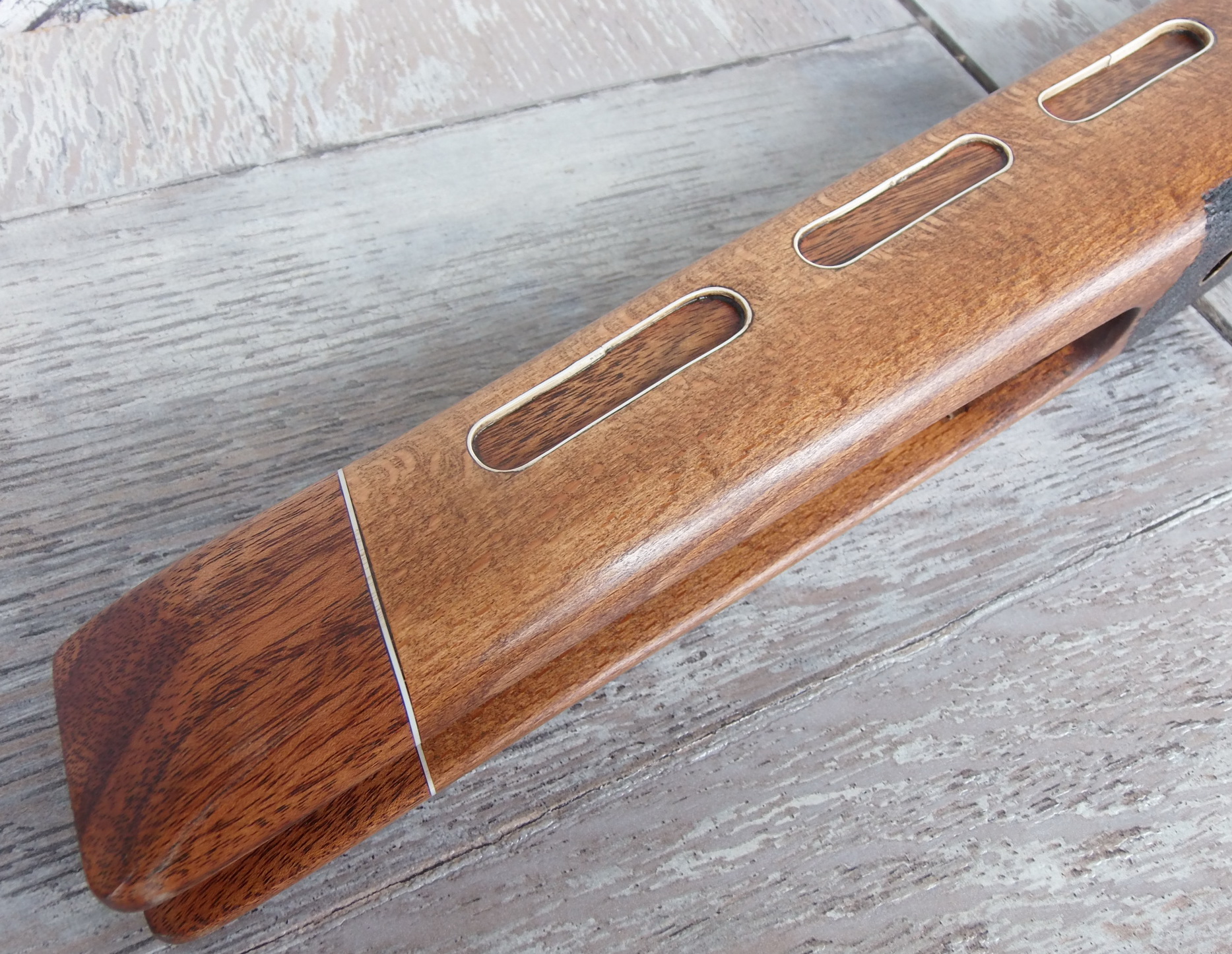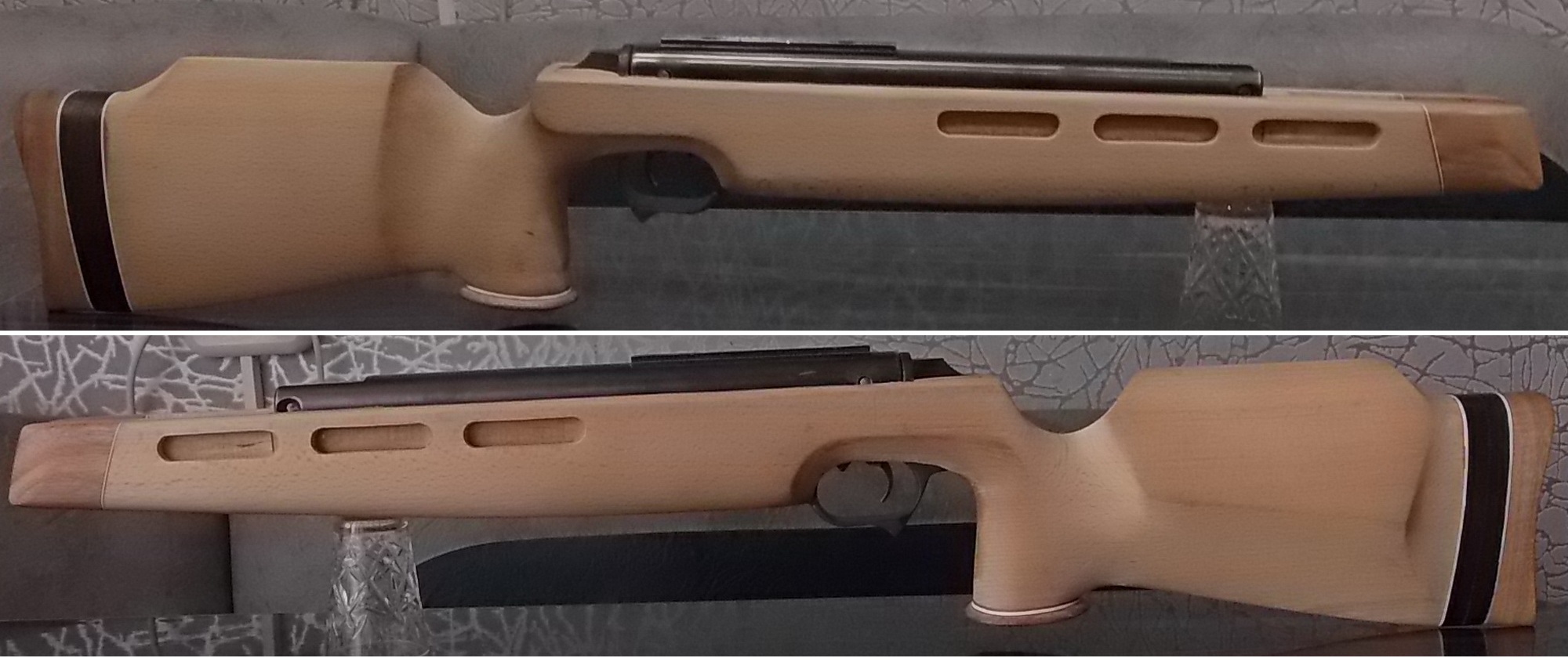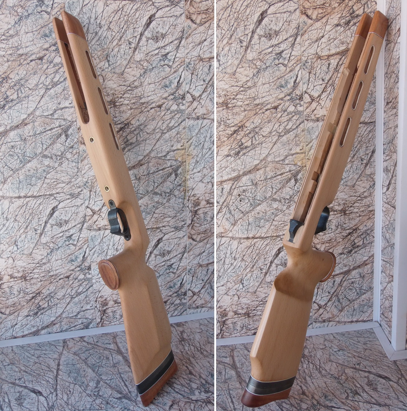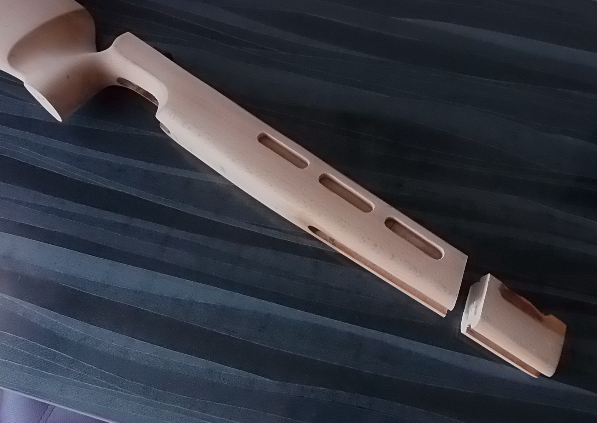 Как видите и сделанные окна в боковинах ложи я слегка декорировал. Подумалось что будет это не страшно выглядеть на винтовке. Коротко говоря-из той же индийской палки выпилил я тонкую дощечку. Из неё детским лобзиком неспешно 6 вставок с красивой фактурой в эти самые окна. Вклеил их на ЭДП и вокруг окна оклеил белым ПВХ пластиком в тон уже собранных на ложе элементов. Ну чтобы подчёркивало эти вставки наверно. И вот так стало дополнять индийское дерево бук на моей поделке: