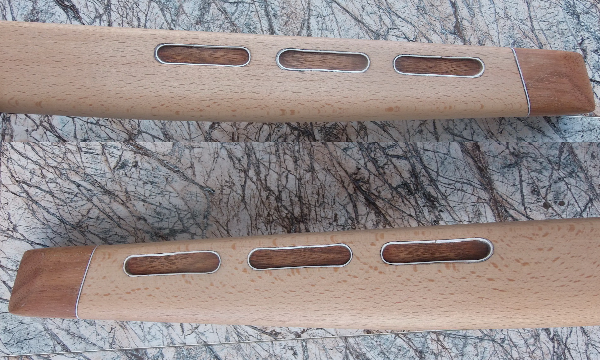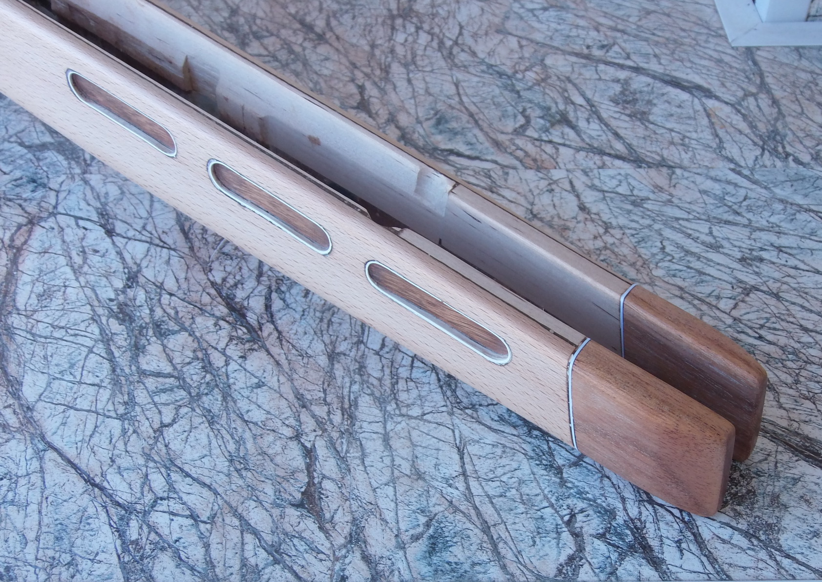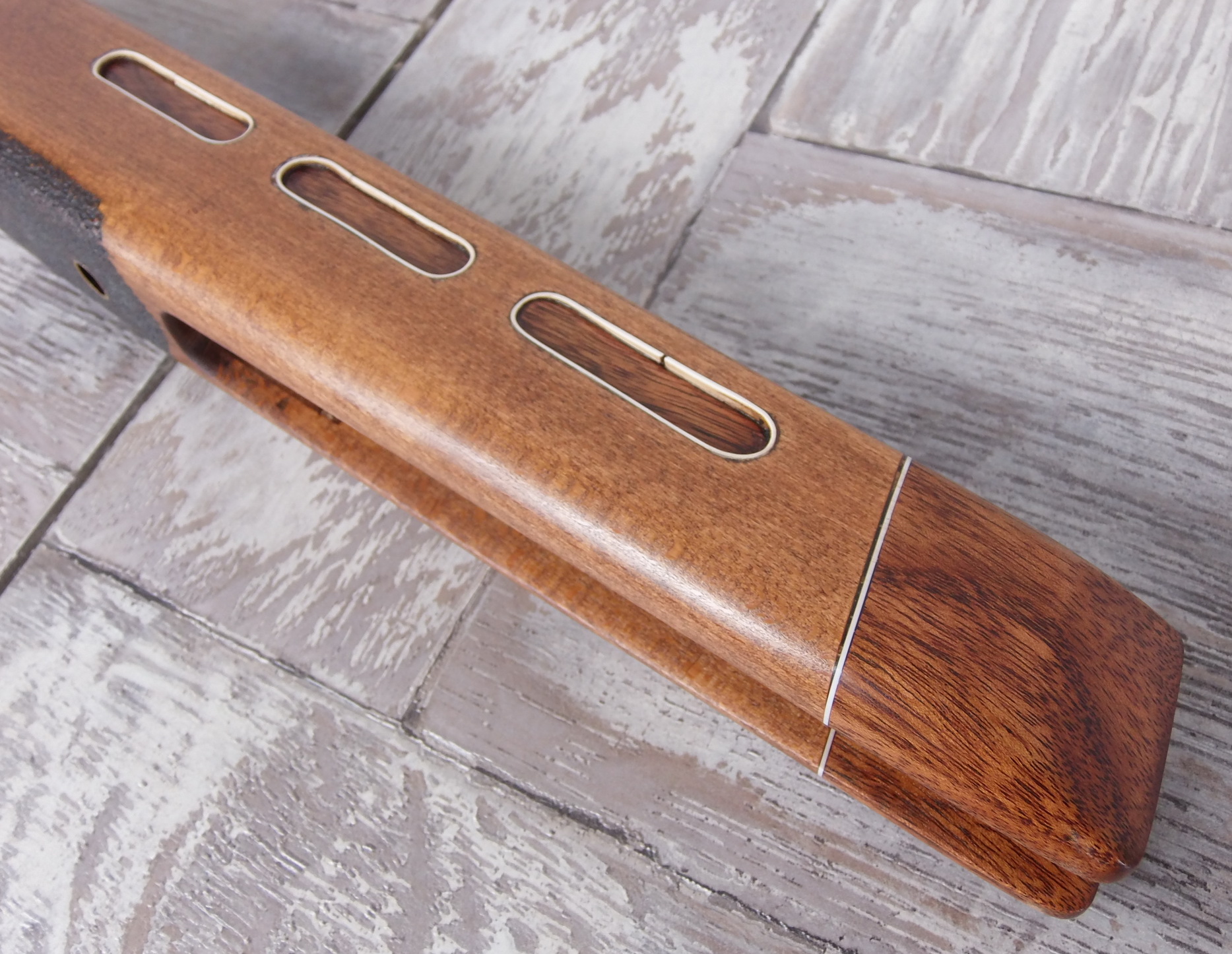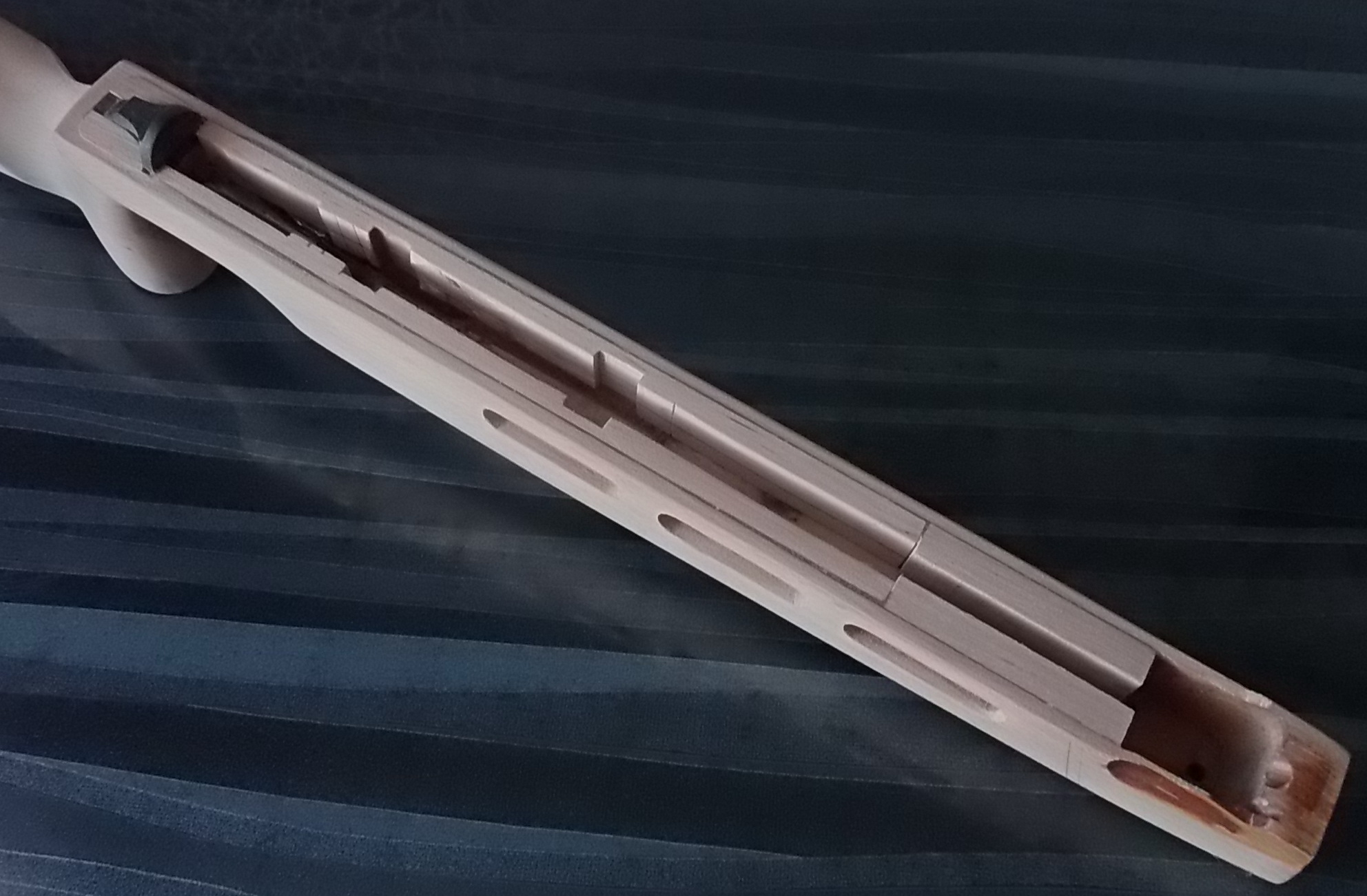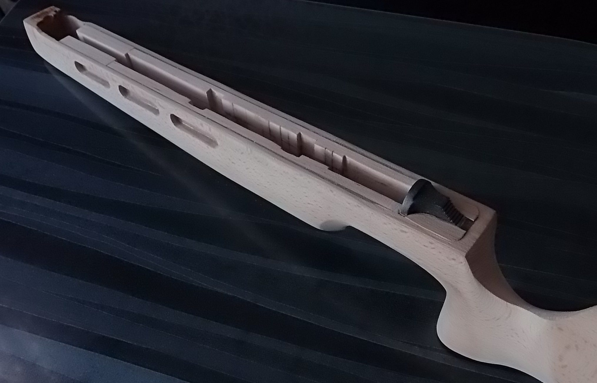 Как видите и сделанные окна в боковинах ложи я слегка декорировал. Подумалось что будет это не страшно выглядеть на винтовке. Коротко говоря-из той же индийской палки выпилил я тонкую дощечку. Из неё детским лобзиком неспешно 6 вставок с красивой фактурой в эти самые окна. Вклеил их на ЭДП и вокруг окна оклеил белым ПВХ пластиком в тон уже собранных на ложе элементов. Ну чтобы подчёркивало эти вставки наверно. И вот так стало дополнять индийское дерево бук на моей поделке: