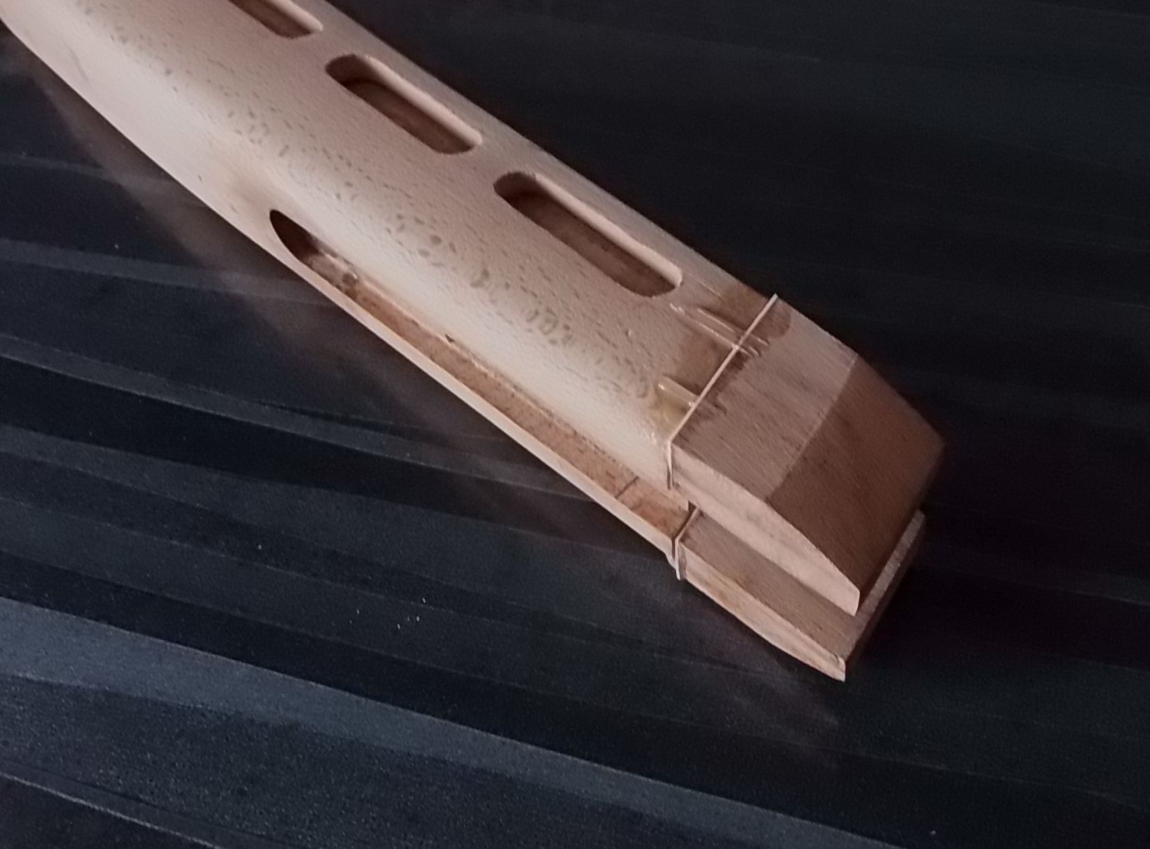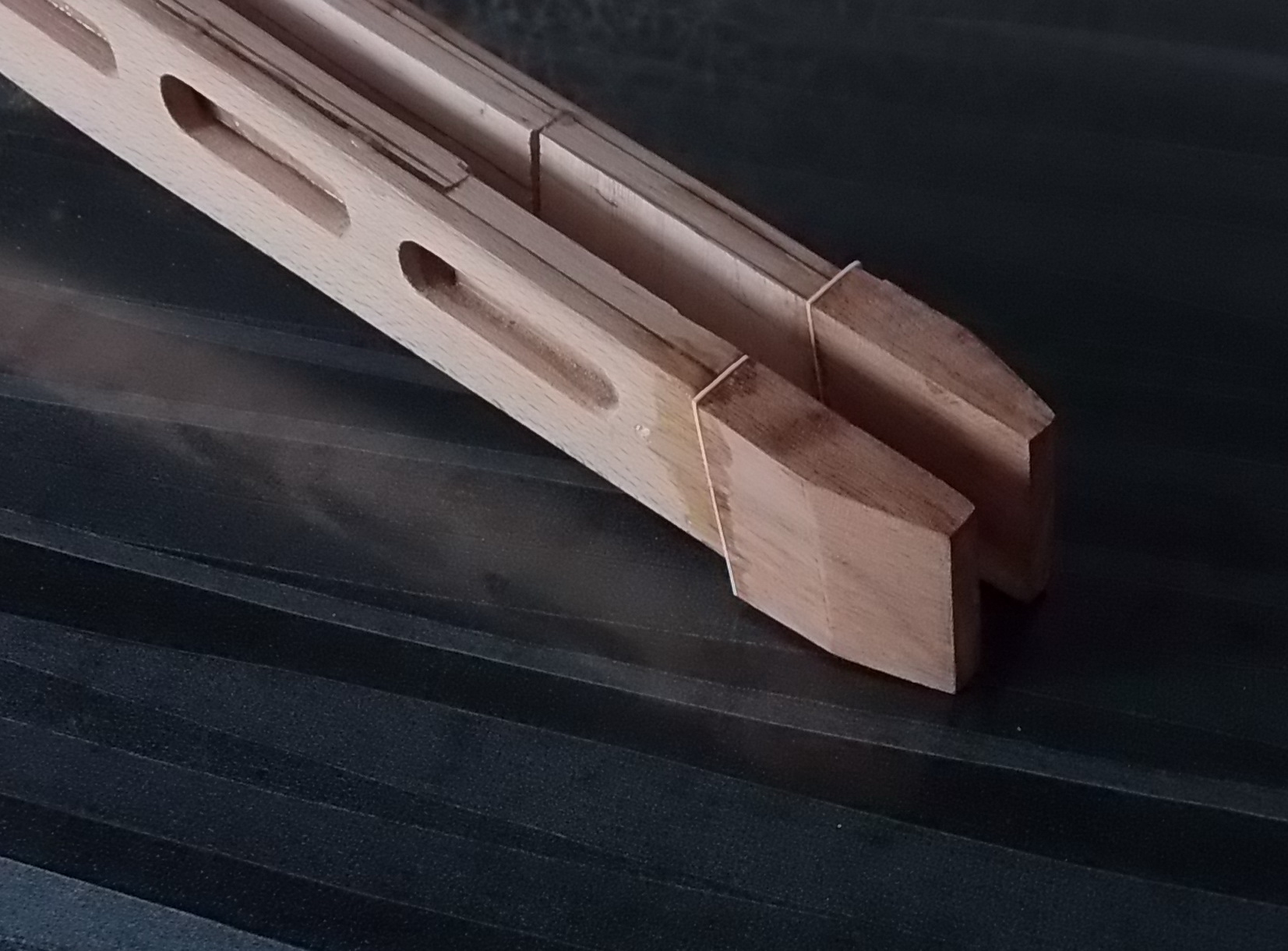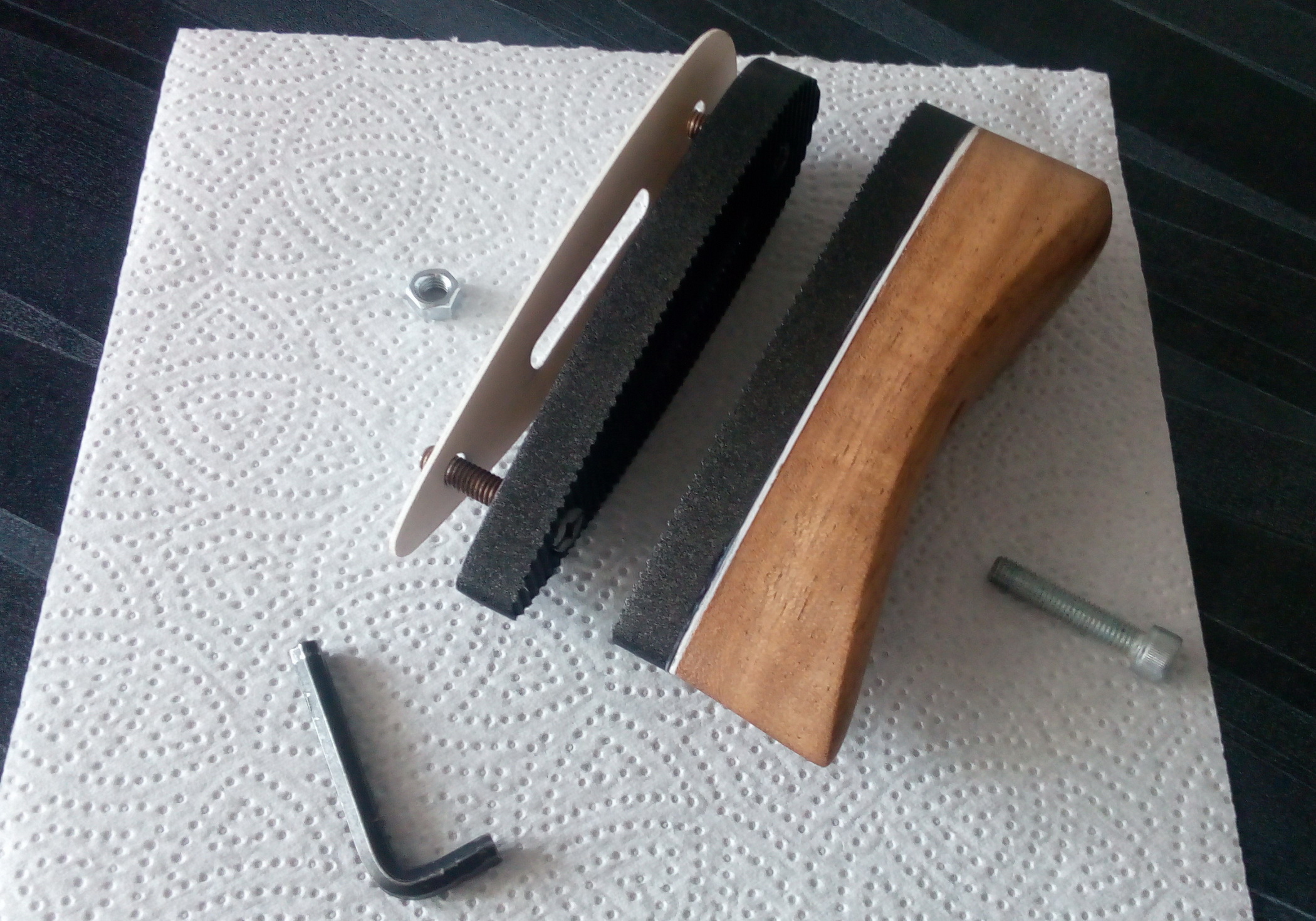 А вместо отпиленной части цевья я изготовил заготовки из этой же экзотической древесины. К ним заготовки прокладок белых и четыре шпильки/самореза. Просверлил нужные отверстия и собрал всё на ЭДП. Вот тут подготовка и итог всего задуманного на цевье: