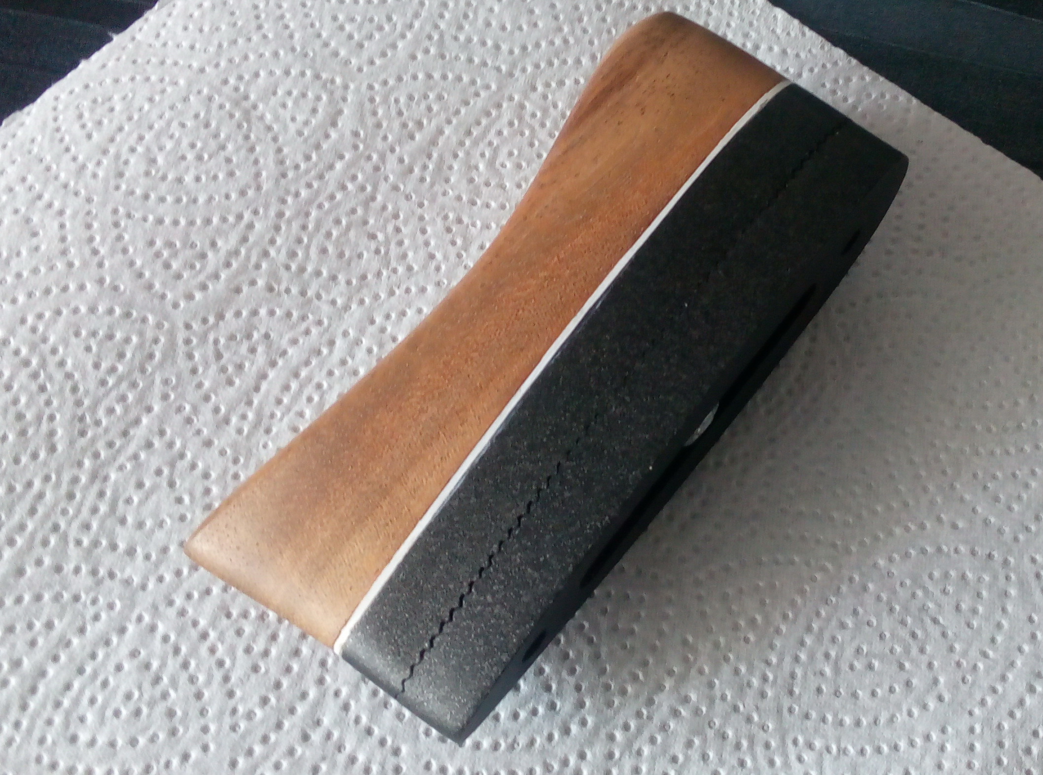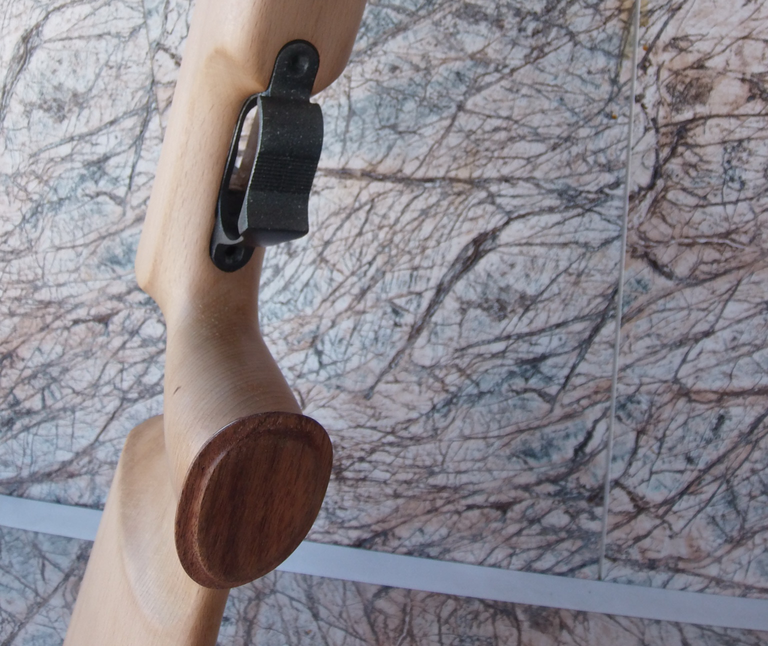 Зачисткой пока не занимался-работы с клеем ещё предстояло много. Сделал это позже. Ну и ещё в дополнение Русланом была выполнена и основа затыльника винтовки. Сделали её регулируемой по высоте. Только не на «ластохвост», а более на наш взгляд надёжнее-соединение «крокодильчик». Сам затыльник изготовил я традиционно из красивой индийской породы. Подгонку основы с закреплённым на ней на клей ЭДП+саморезы затыльником выполнял закрепив весь комплект на прикладе двумя винтами в родные немецкие втулки. Потому подгонка очень точная-ничего не выступает, нет щелей и т.д. В дополнение к затыльнику были изготовлены две белых тонких прокладки из ПВХ пластика от электрокороба. Вышло всё вполне отлично,вот начало-напечатанная основа затыльника из двух половин с соединением «крокодил», затыльник из экзотической породы и две прокладки: