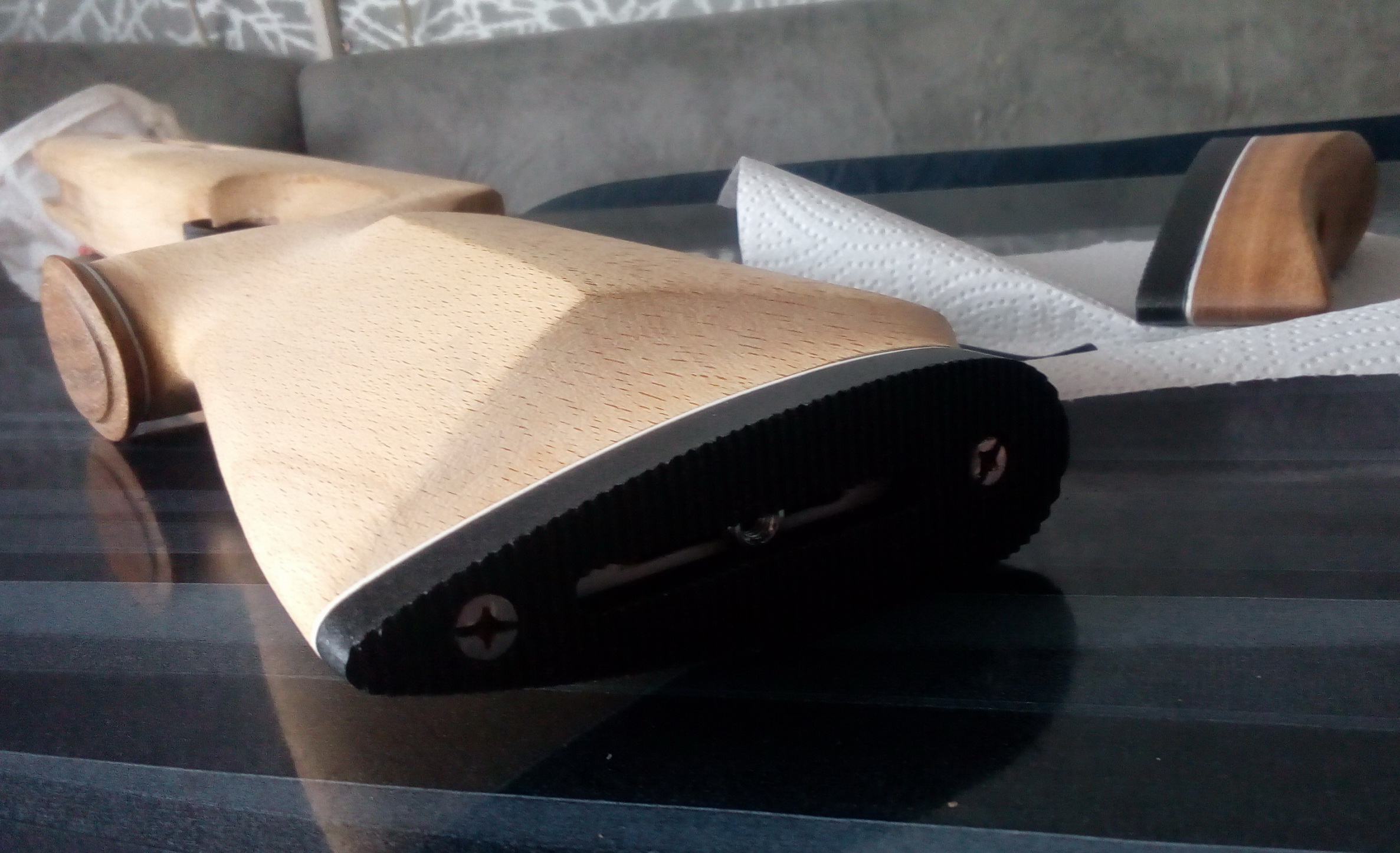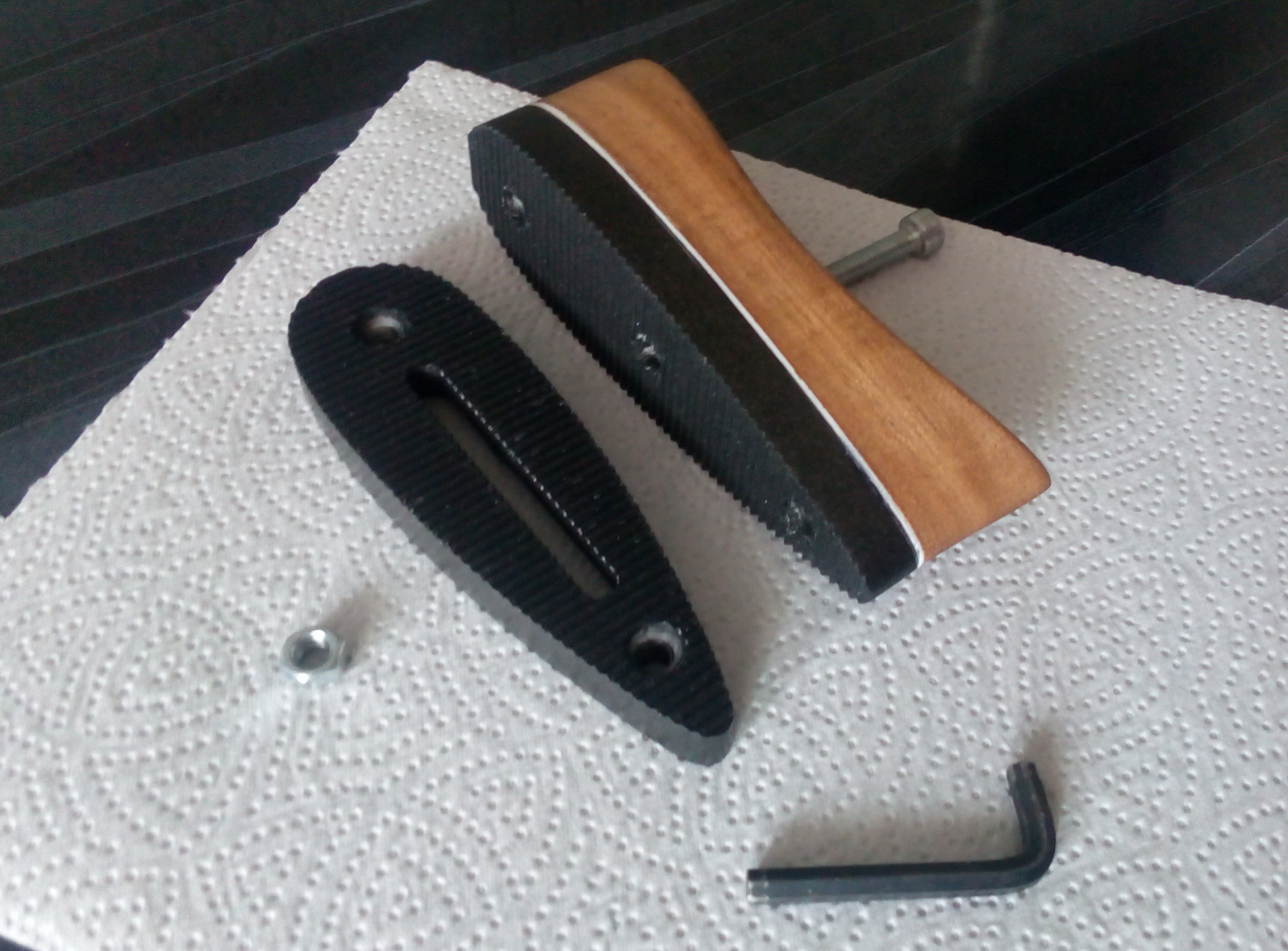 Продолжил декорирование изготовлением пятки на рукоять из той же индийской породы+ также прокладка из такого же пластика. Закрепил пятку на рукояти по отработанной давно технологии-саморез вместо шпильки, отверстие в рукояти, клей ЭДП, струбцина. Вот так всё двигалось: