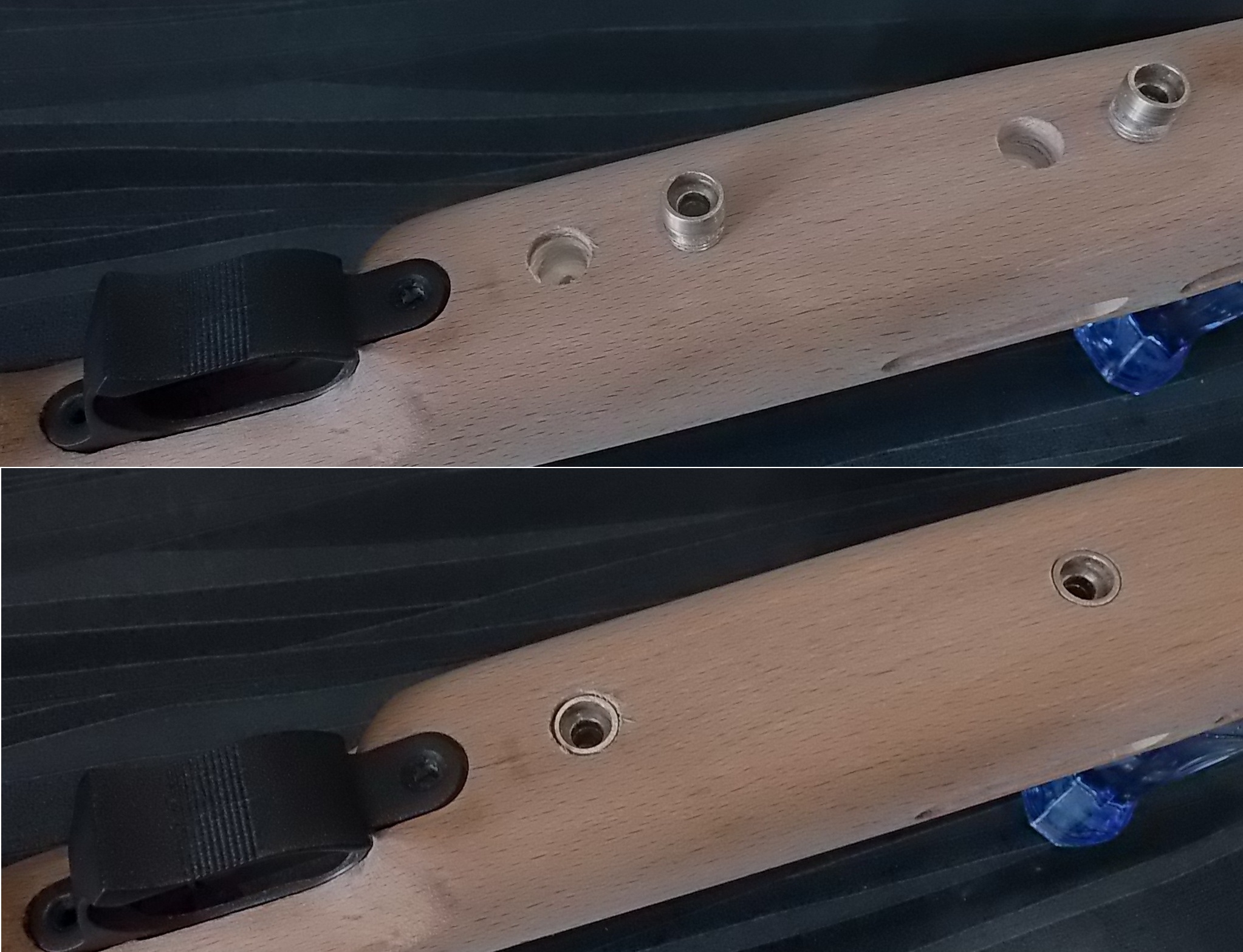 Ну и теперь можно было сделать и крепёж «железа» в ложе! Крепить решил и в этой работе двумя винтами снизу. Не люблю я боковые винты в передке ложи. Потому и в передней опоре компрессора было по центру просверлено отверстие Ф4,2мм, нарезана резьба М5 как и в задней опоре. Для надёжного крепежа изготовил две металлические втулки для винтов М5 под шестигранник. Точно всё рассчитал и просверлил нужные для врезки втулок отверстия. Отверстия Ф13мм не сквозные-они были рассчитаны и сделаны так, чтобы втулки туго садились на ЭДП, при этом были заподлицо с цевьём. Т.е. они не проваливались в ложу, а стояли на клею на оставшейся в ложе деревянной перемычке межу ними и опорами. Вышло на удивление точно и опрятно:
