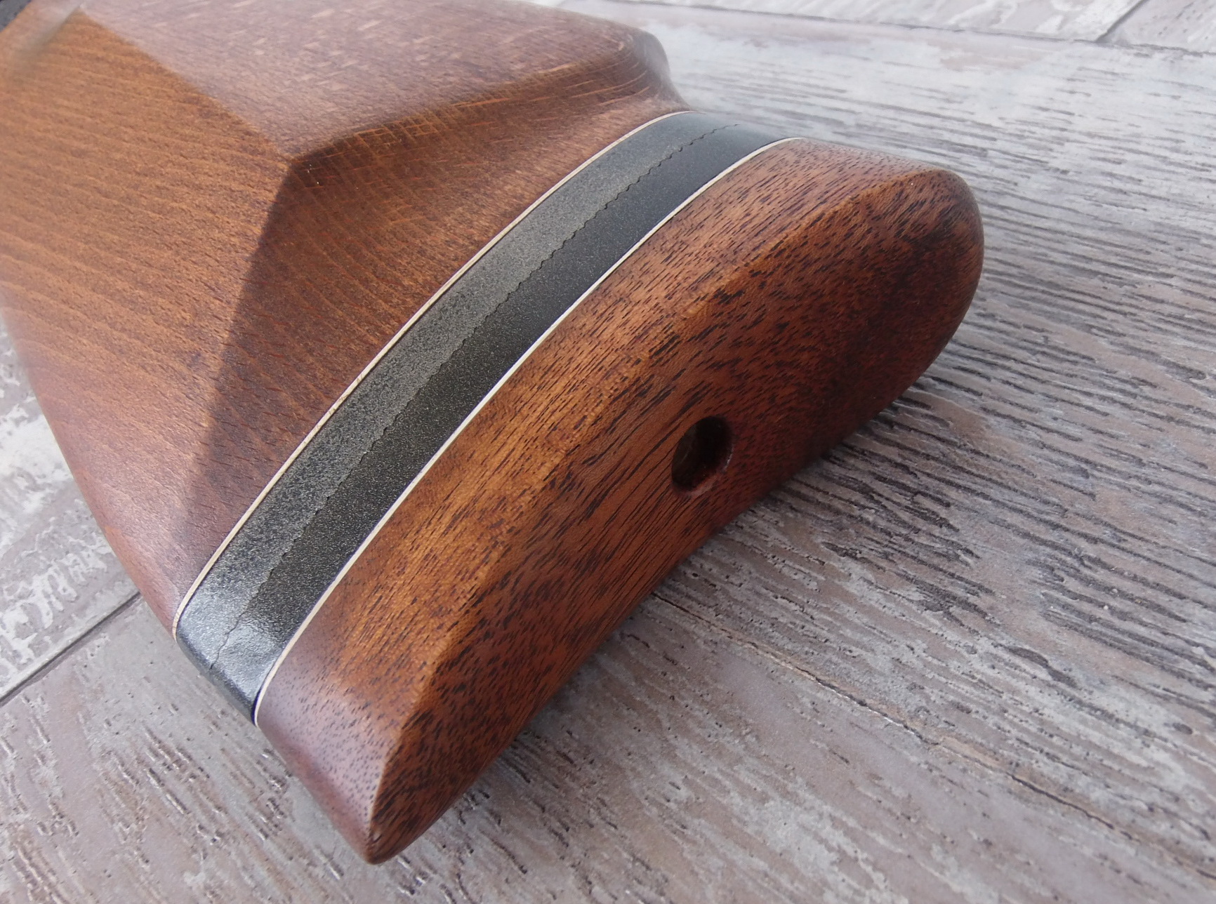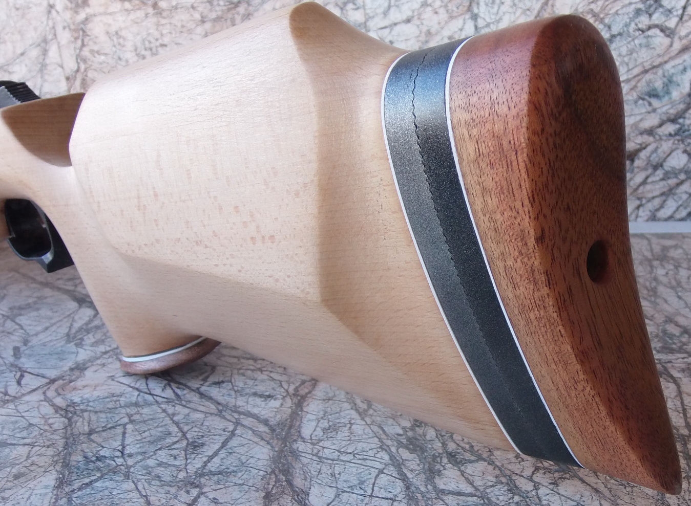 Учитывая что буду применять для пропитки тёмное датское масло «Чёрный орех», ложу я решил не тонировать морилками. Да и хотелось что-то классических ружейных окрасов, да и на предыдущей «спортивной» МР-512 ложа была сделана тёмных тонов-желал разнообразия. Потому к пропитке приступил сразу, фото этапов пропитки не буду показывать-там всё и так не раз рассказано и нового ничего я не добавил. Начало было положено льняным отбеленным маслом (3 слоя с промежуточной сушкой),далее 5 слоёв масла Дениш Ойл(чёрный орех),слой восковой полироли Дениш Сатин(дарк). После недельной сушки ложа была отполирована шерстяным мягким шарфом. Я ещё позже побалую ложу маслами и повторно отполирую-будет ещё краше. Но и этот вид ложи меня удовлетворил. Текстура бука здорово проявилась под маслом, особенно красивым рисунок был слева. Индийское дерево тоже отлично себя подчеркнуло и дополняло бук. Несколько фото поближе:
