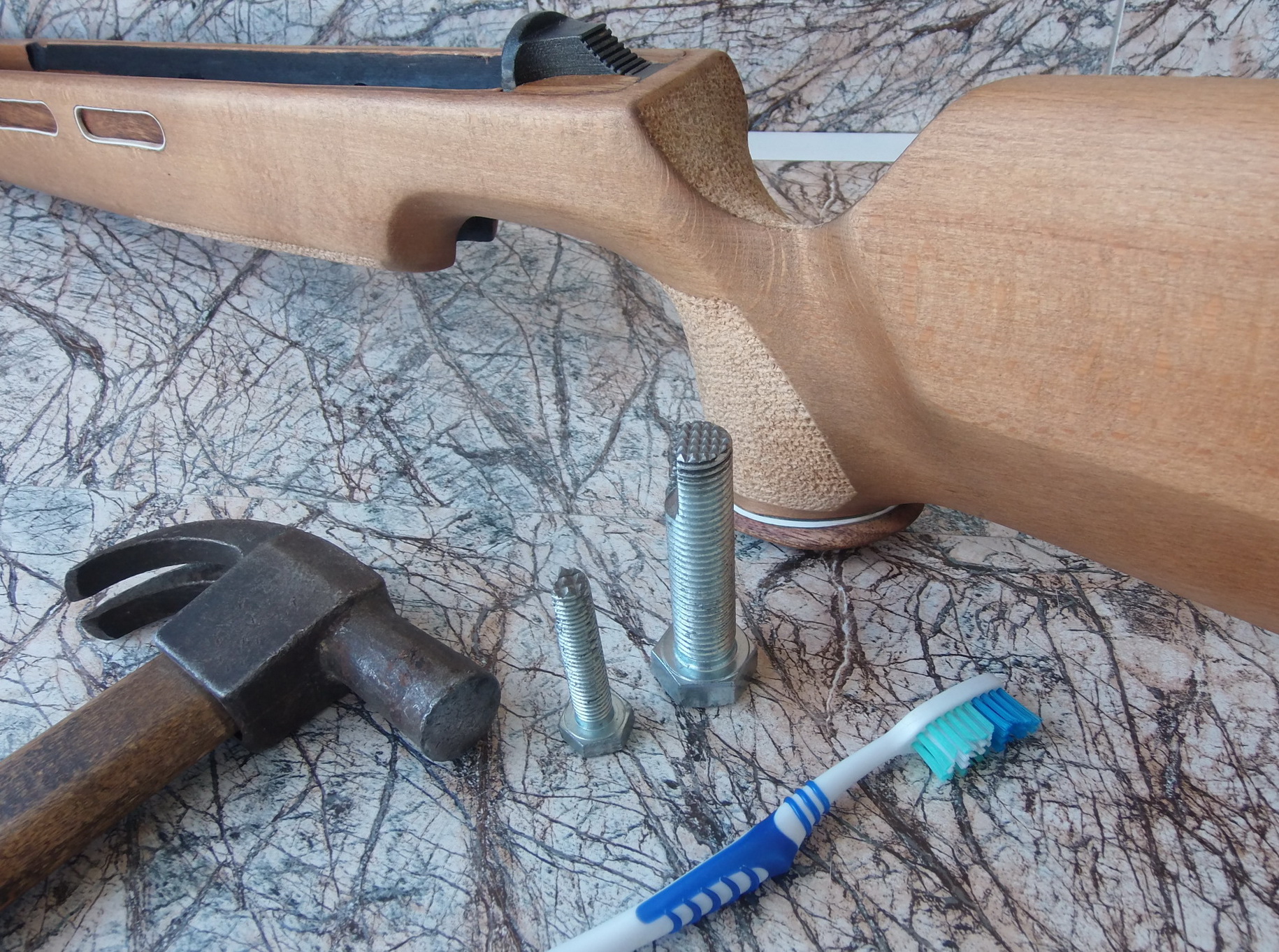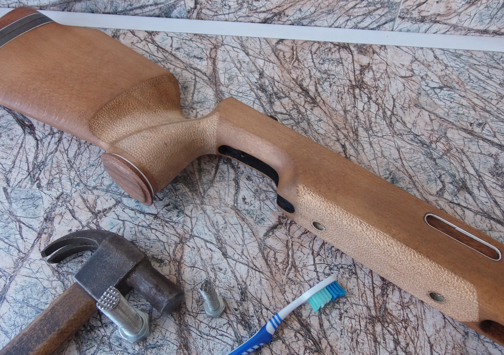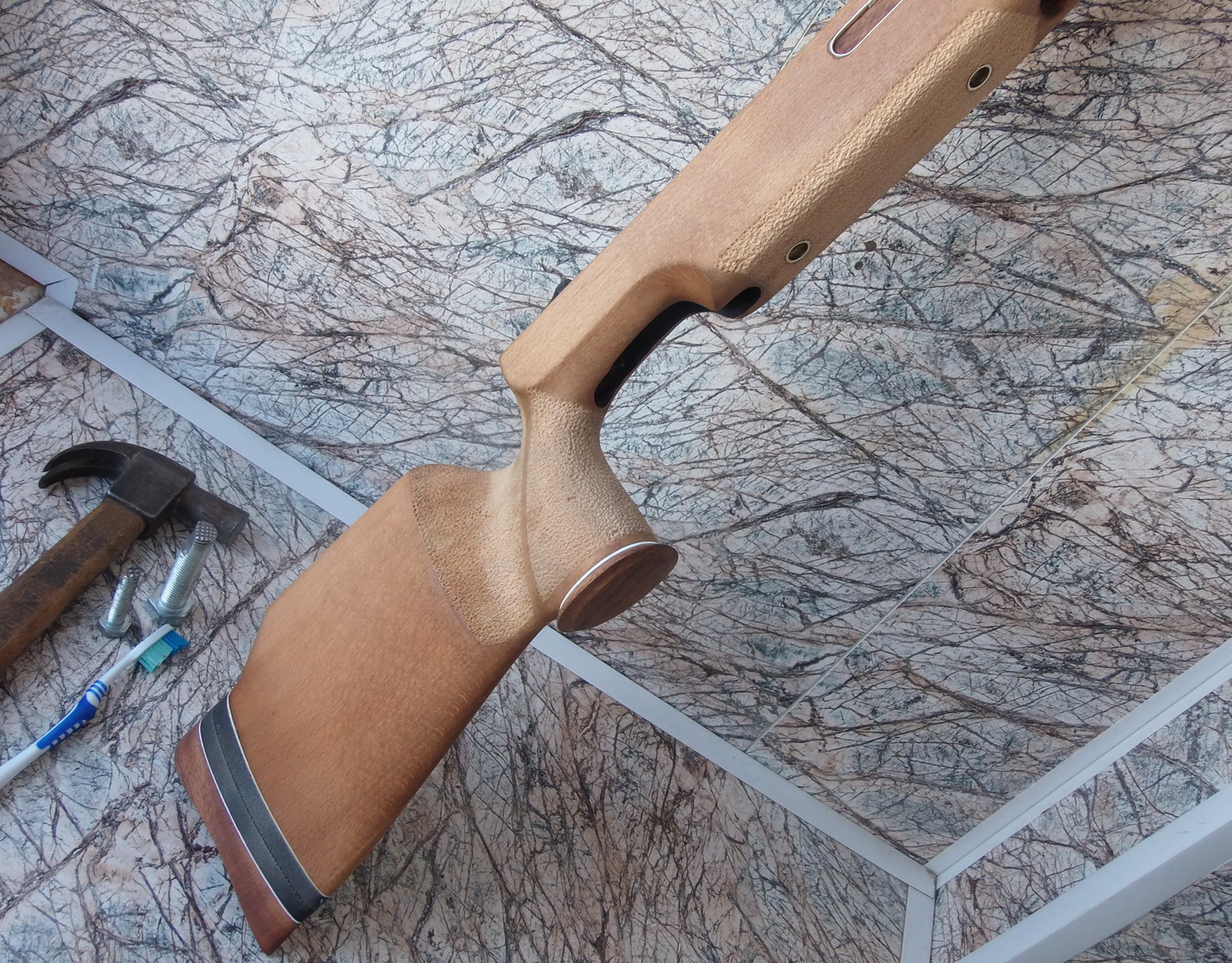 Разумеется что изначально планировалось сделать и хват надёжный. Потому заново нанёс на ложу наколотку на рукояти и вокруг неё справа (под ладонь) и на цевье. С помощью двух немудрёных приспособлений, молотка и зубной щётки для обтирания опилок сделал эти элементы: