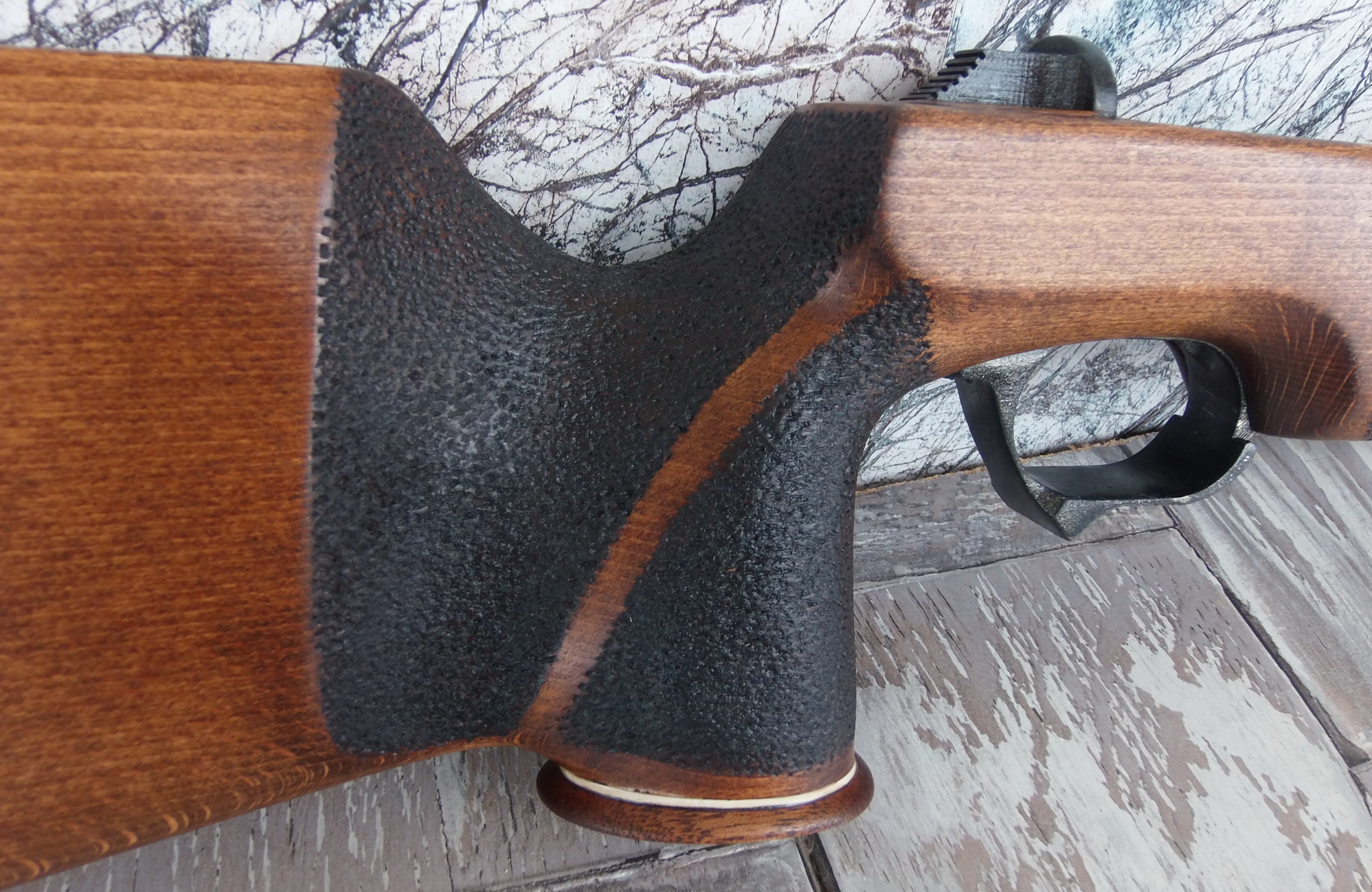 Нанесённая на цевье и рукояти наколотка отлично пропиталась, имела интересную фактуру. Конечно главное её предназначение-препятствовать скольжению рук на ложе. Но и она должна быть достойной и не лишней. Не знаю как покажется вам-мне итог весьма понравился: